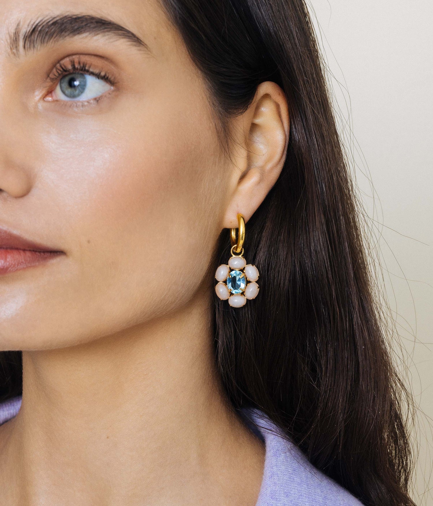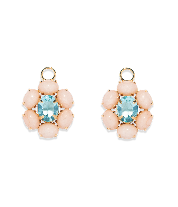 Handcrafted with semi-precious jade cabochons, aqua glass stones, and an 18K gold finish over brass. Charms measure 1.0" drop x 0.75".