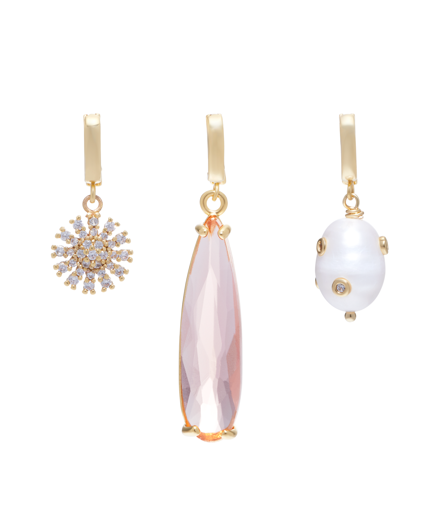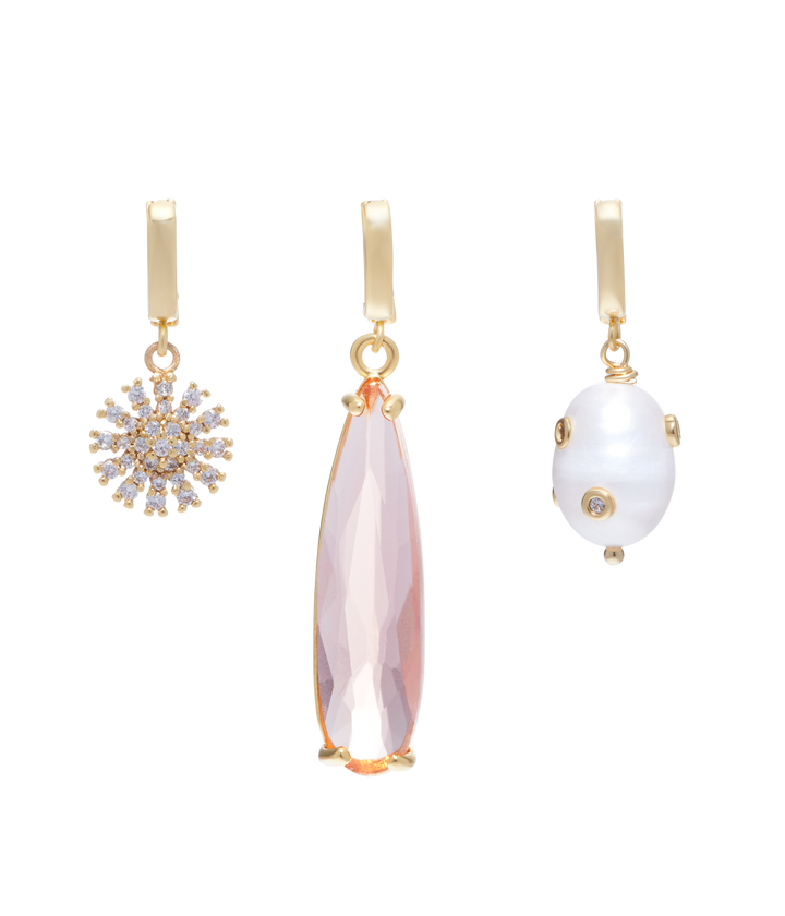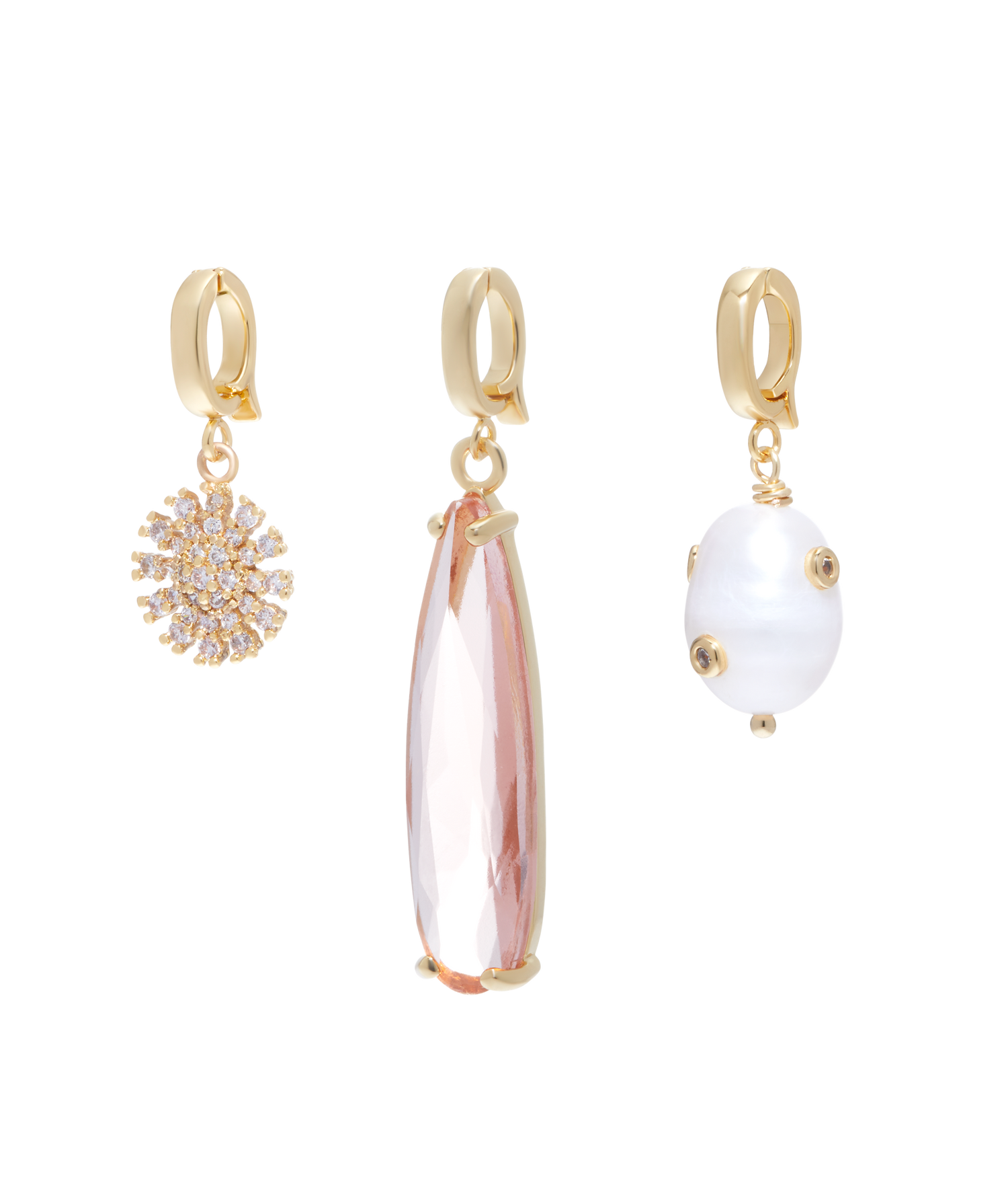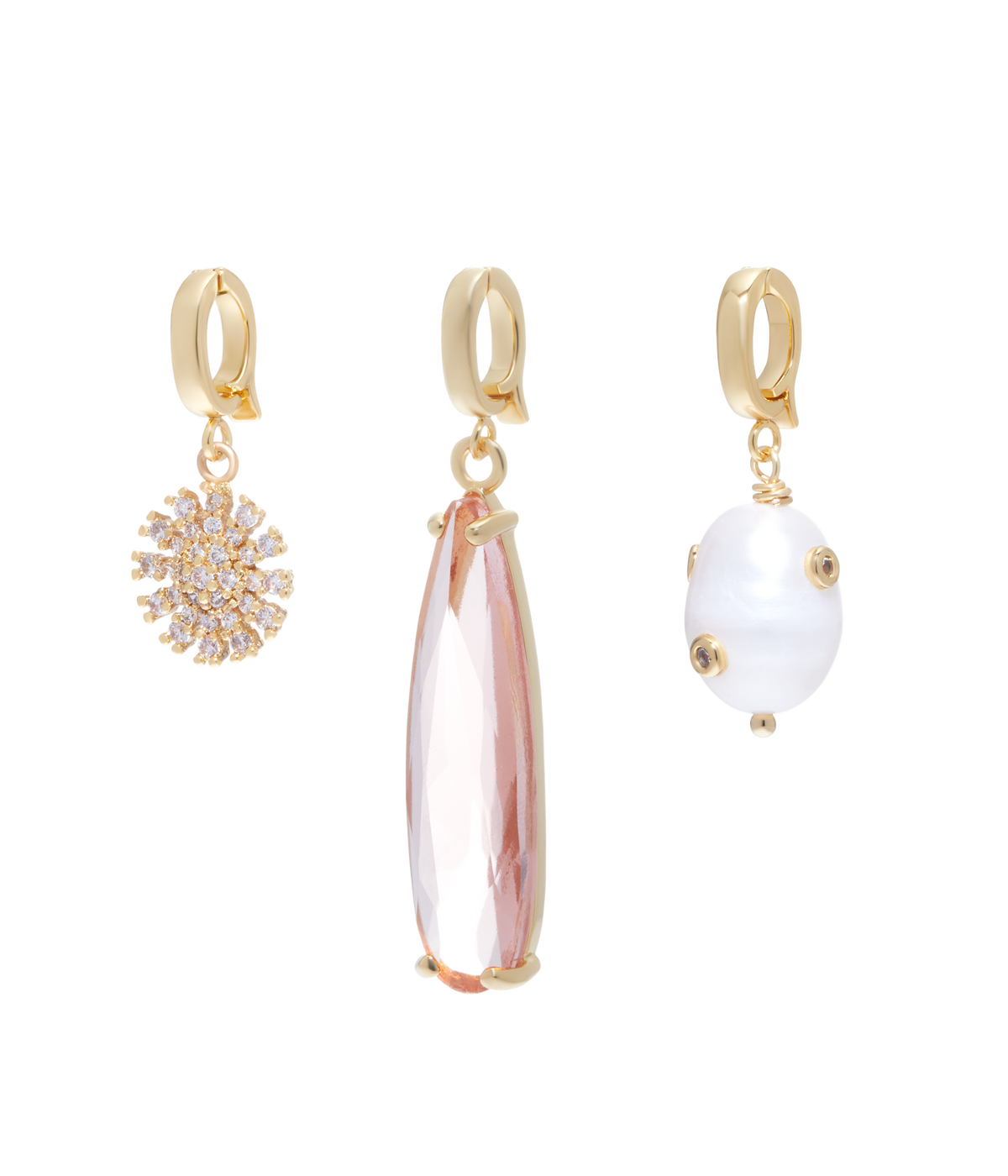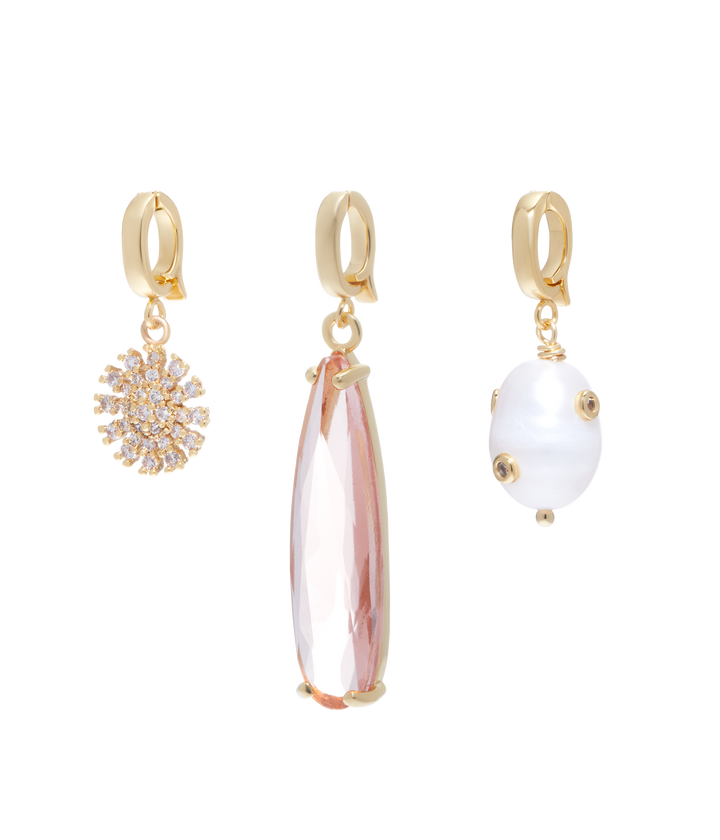 Freshwater Pearl Charm measures 1.0', Pavé Burst Charm measures 0.75', Rosaline Teardrop Charm measures 1.5'.