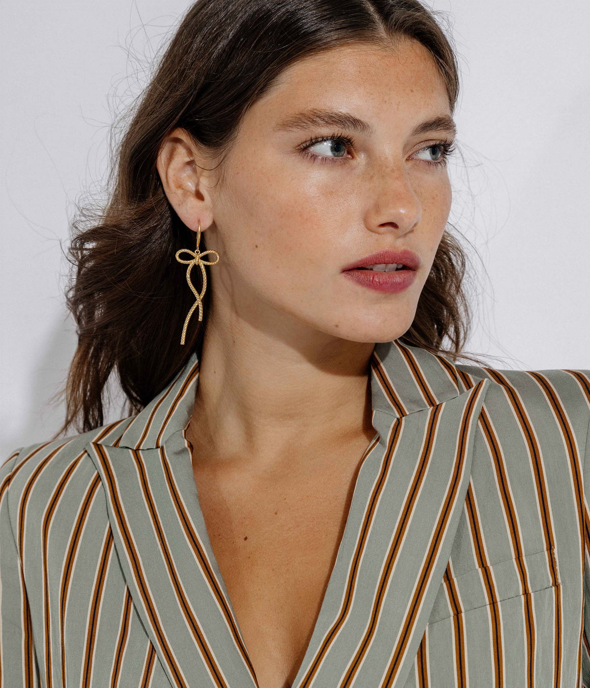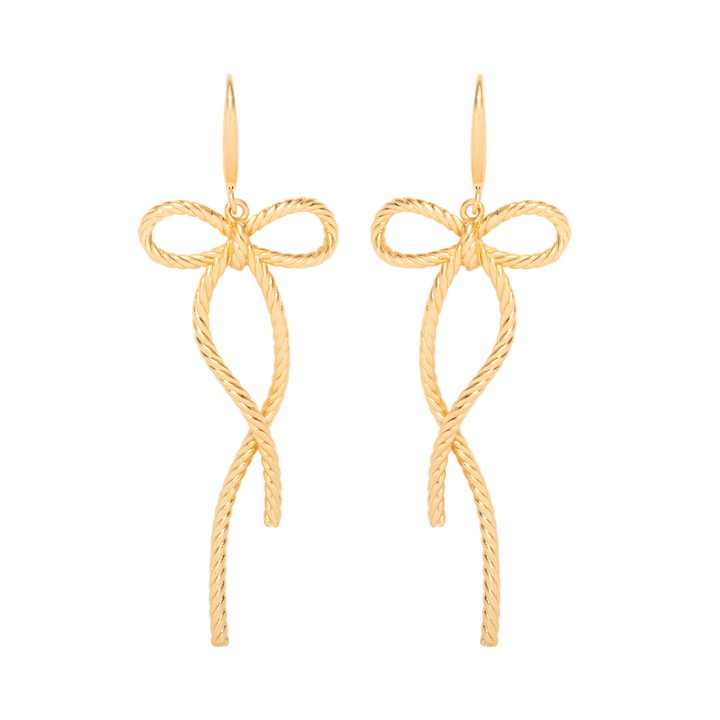 These Spencer Bow Earrings by Loren Hope — A must-have for bow lovers, these earrings feature metal rope-textured bows with elongated ribbons that twist elegantly. They add just the right amount of lady-like drama to any outfit, making them a versatile accessory for any occasion. Arrives in Loren Hope's signature dust bag.