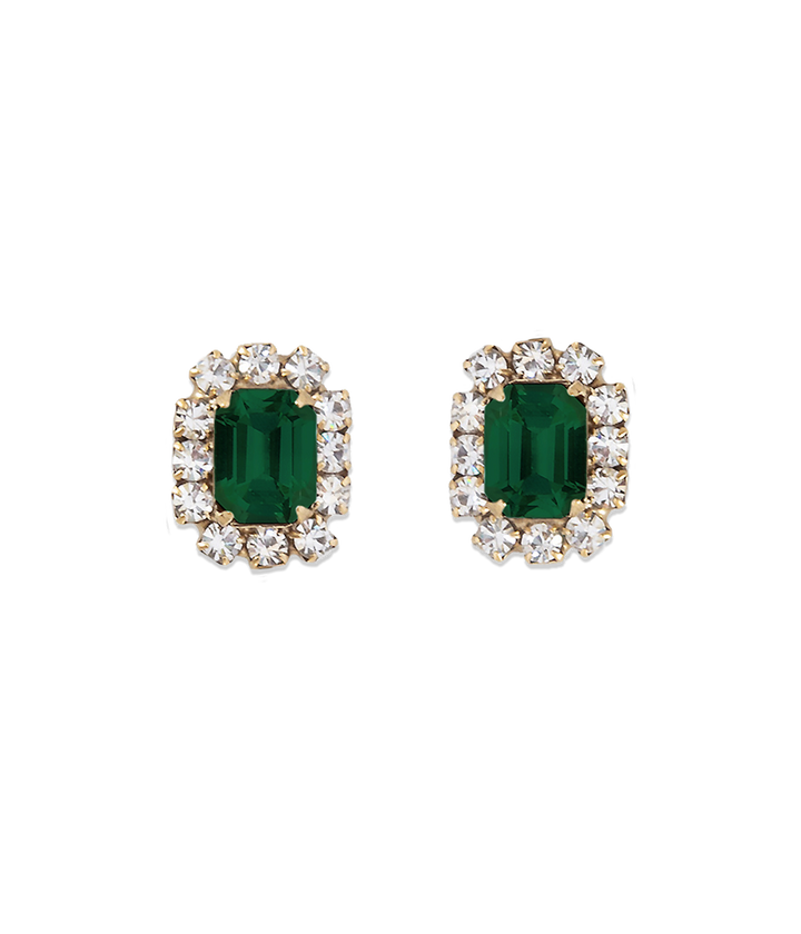 These Tati Studs in Emerald by Loren Hope — Like their crystal counterparts, these elegant studs add a touch of sparkle and shine. Featuring hand-set emerald crystals, they are also available as clip-ons for versatility. Arrives in Loren Hope's signature dust bag.