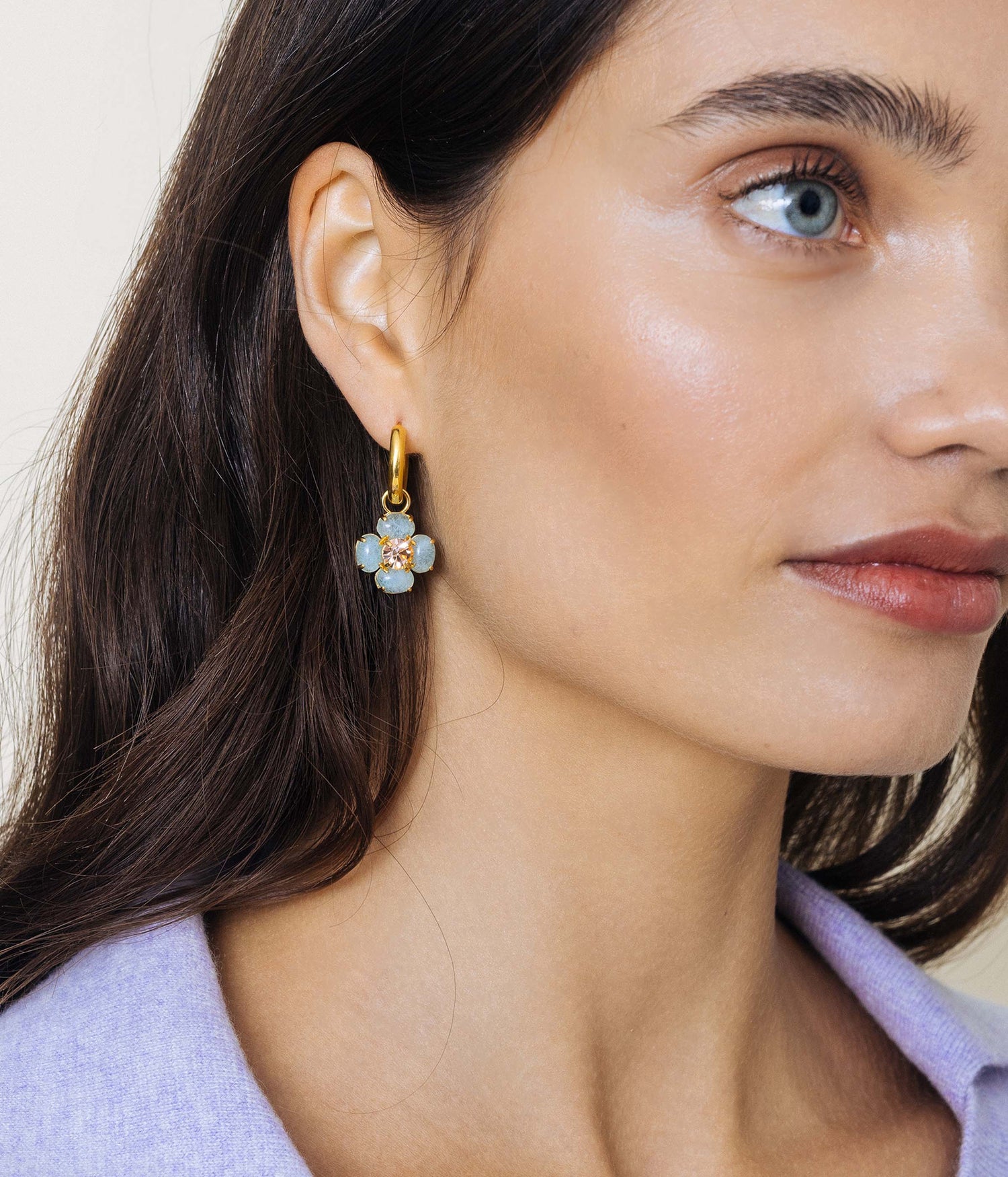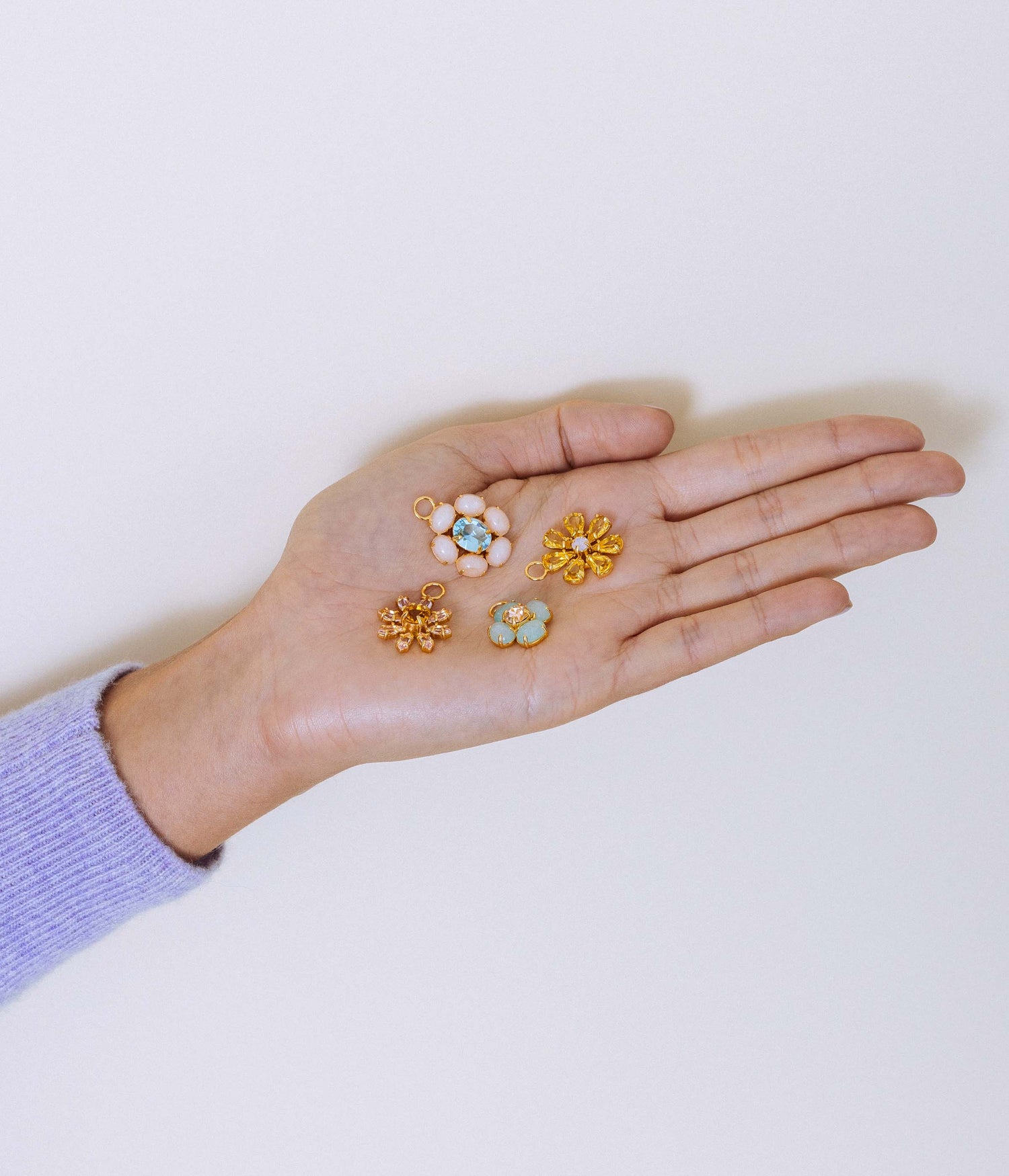 These Trudy Huggie Charms by Loren Hope — A lovable 60s-inspired flower charm, perfect for adding a pop of color and sparkle when worn on pavé hoops. Pair with additional charms like the Addie Huggie Charms for a delightful flower power look. Arrives in Loren Hope's signature dust bag.