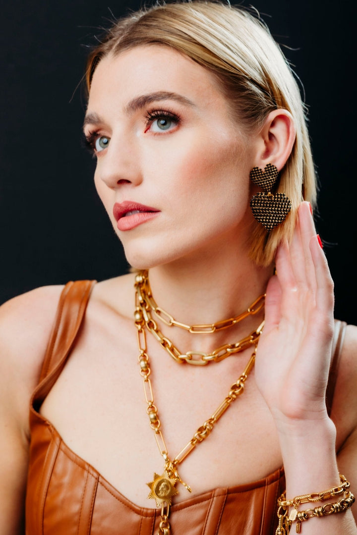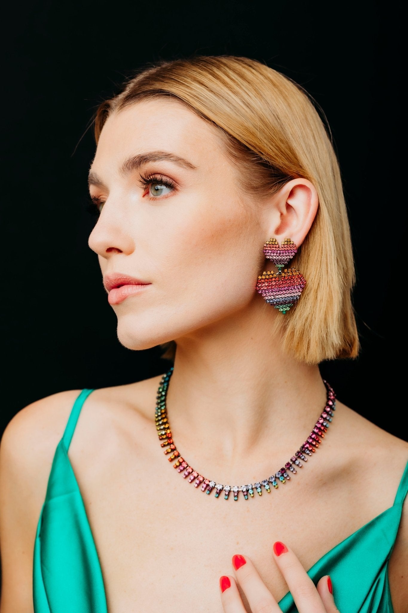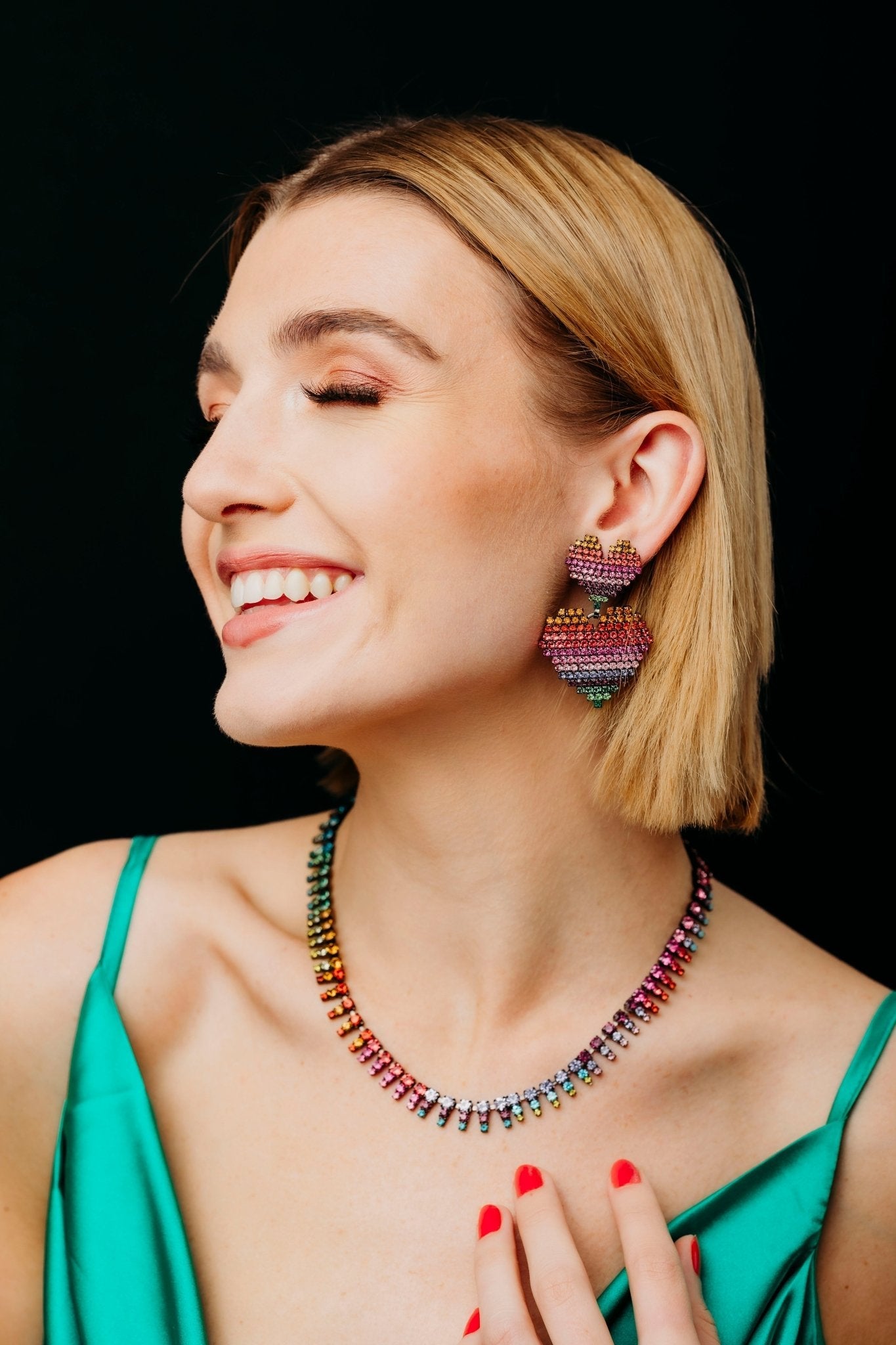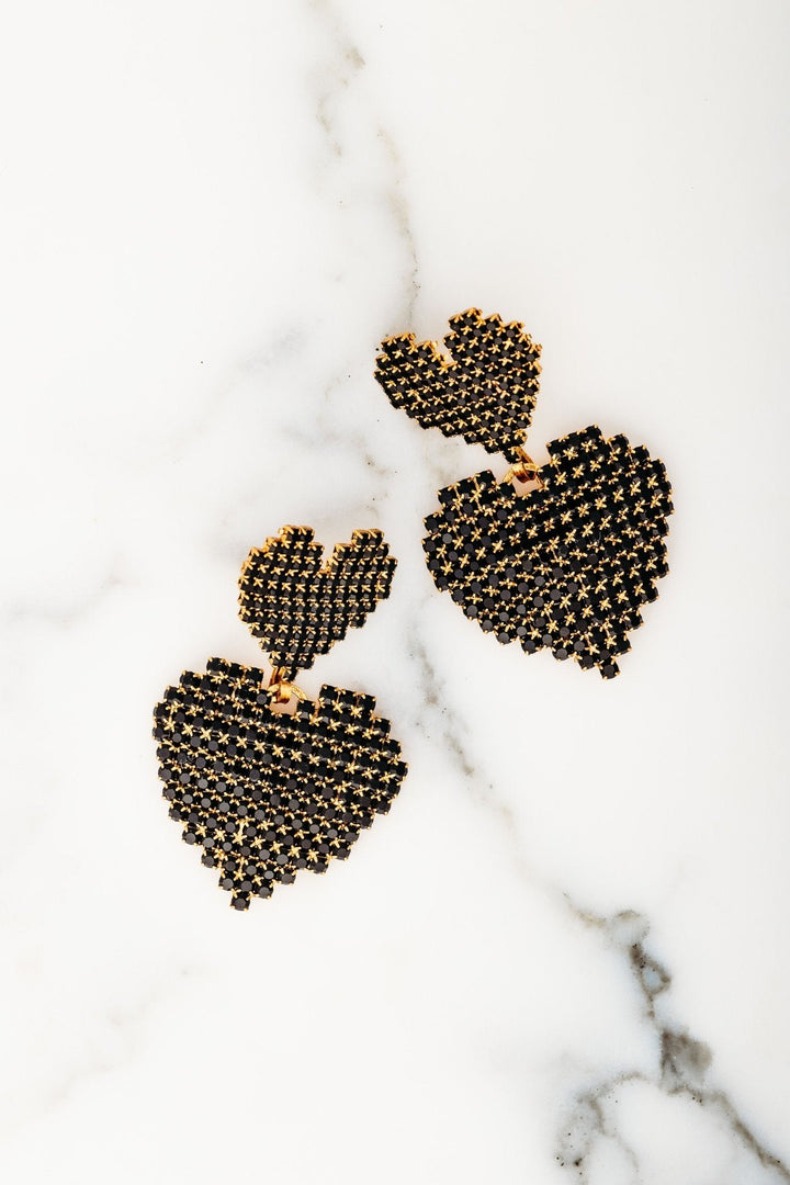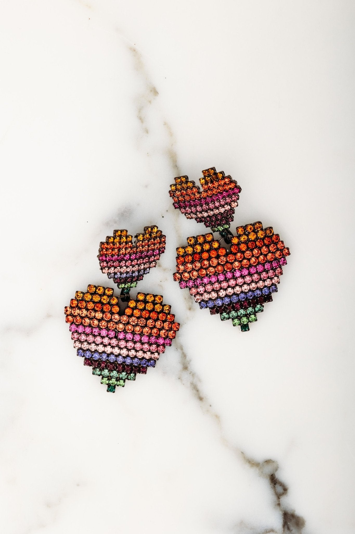These Abby Earrings by Elizabeth Cole – Stay sparkling in these dazzling double heart earrings featuring two sets of graduated hearts for a show-stopping look. Available in breathtaking rainbow and classic jet Czech Crystals, these earrings shimmer with the highest quality. Styled and made with love in the USA, these earrings are perfect for adding a touch of glamour to any outfit.
