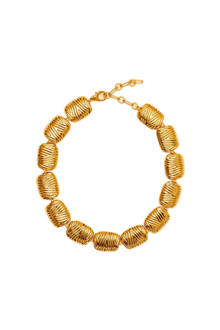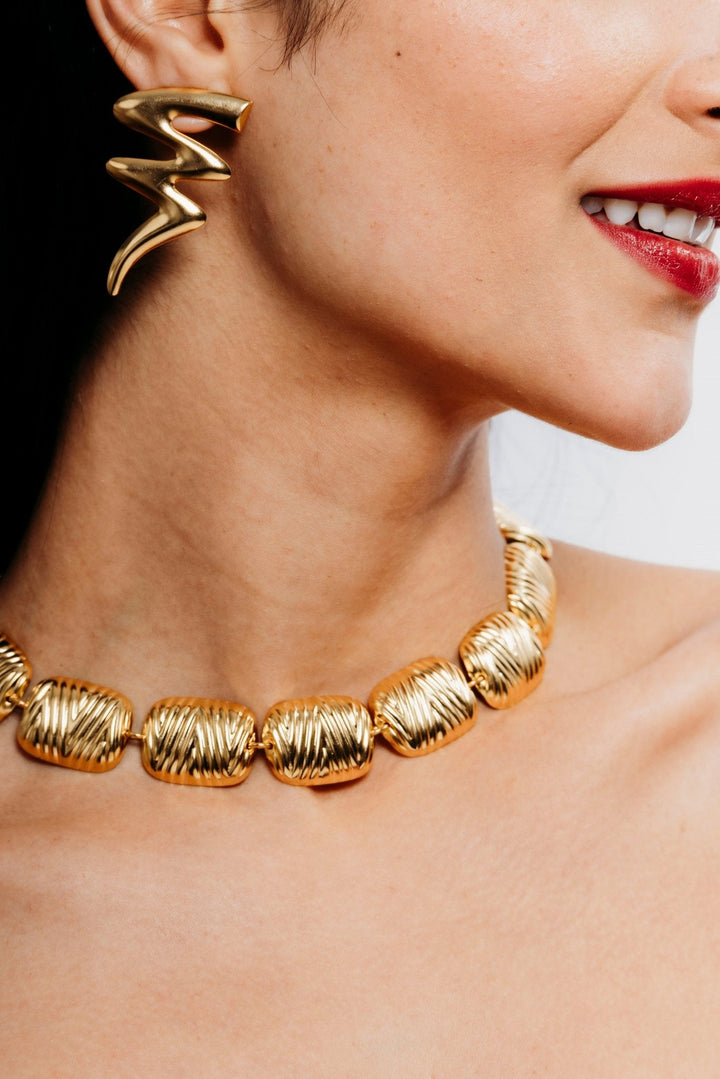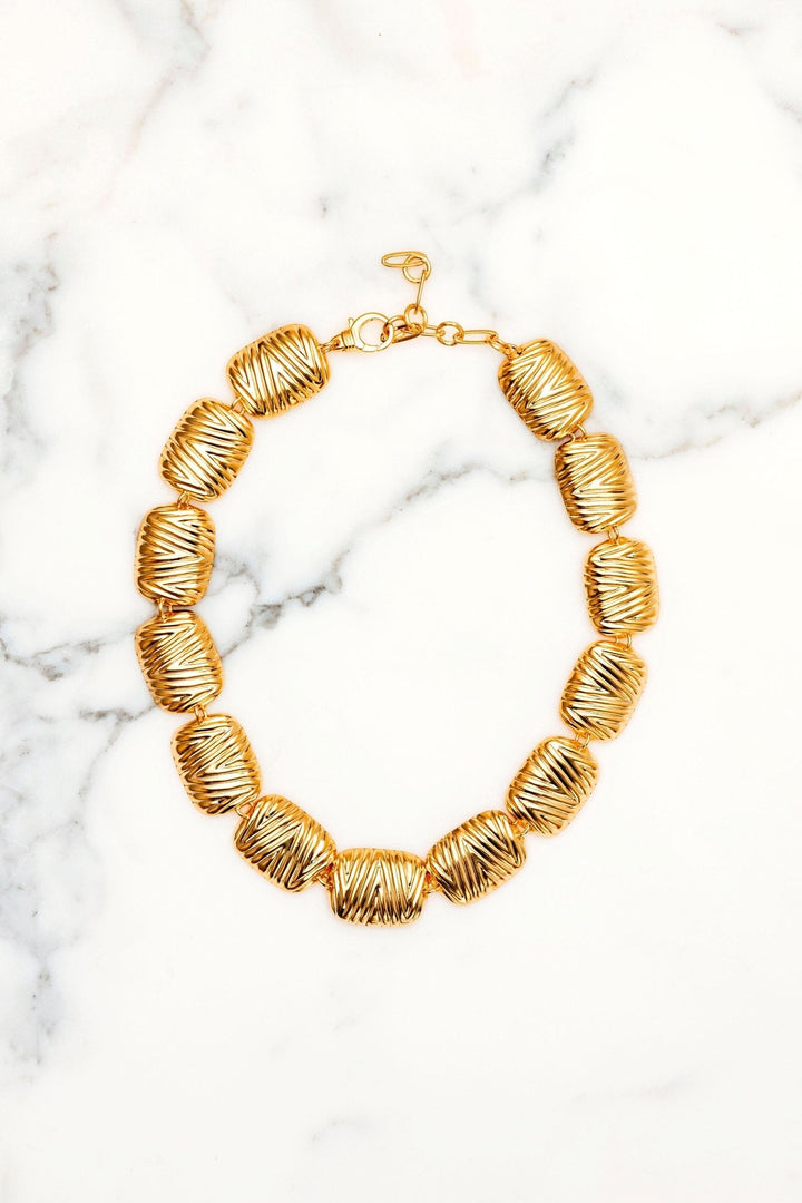 This Adara Necklace by Elizabeth Cole – Shine bright with this statement necklace featuring oversized, textured golden octagons. Wear it alone for a bold look or layer it with other necklaces to elevate your style.