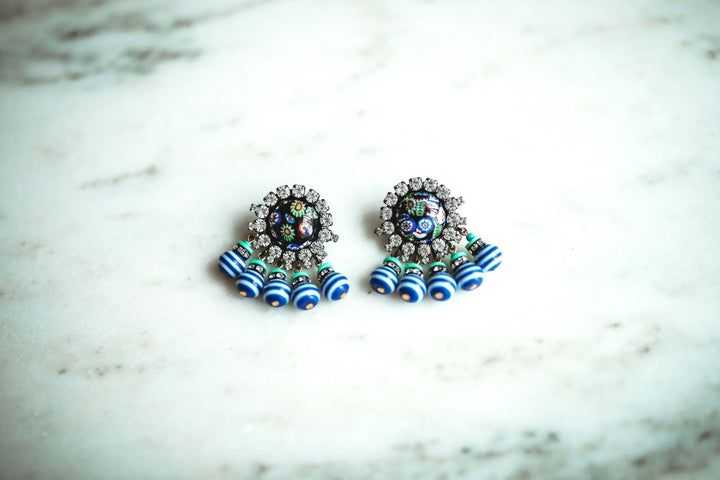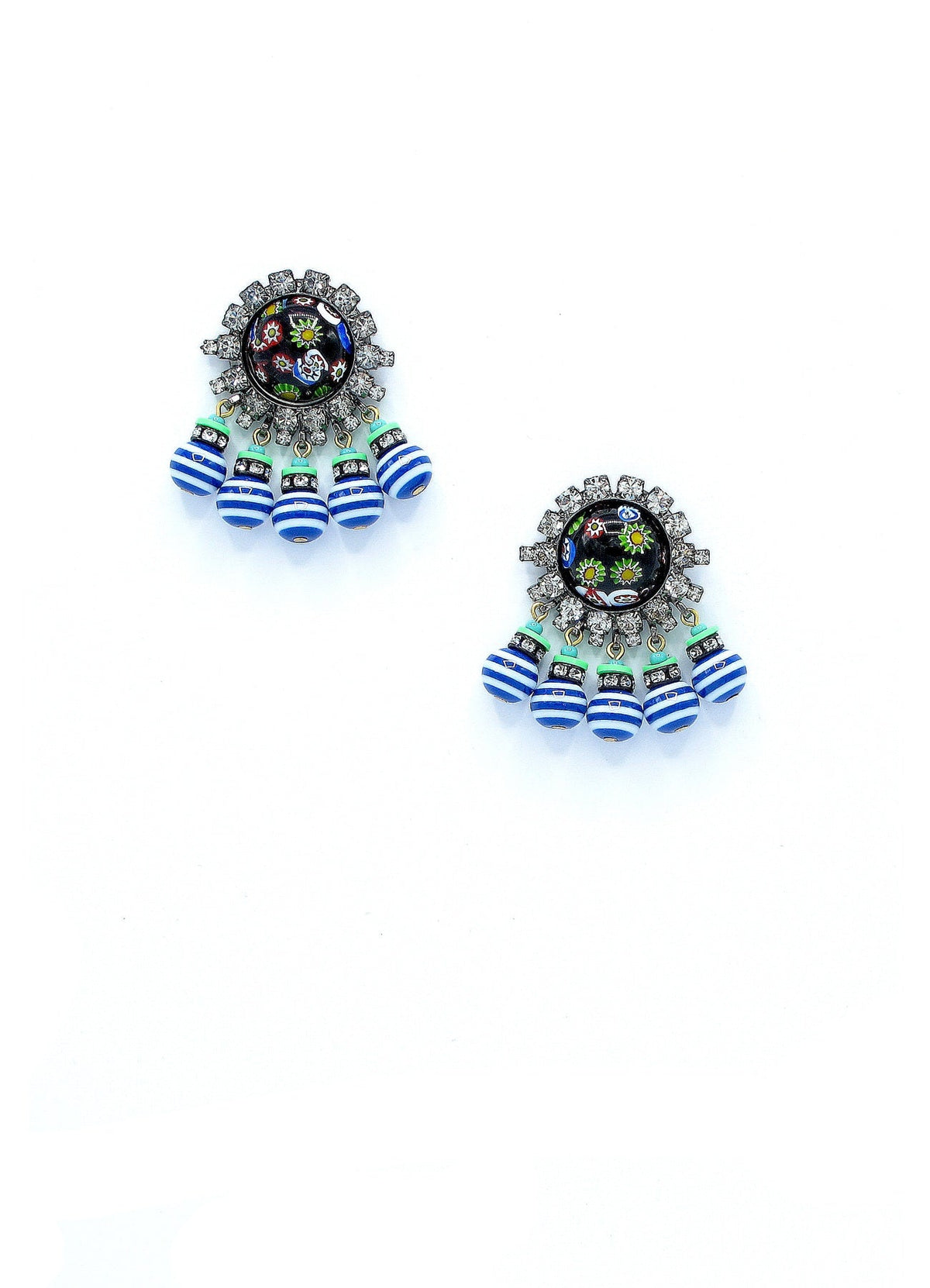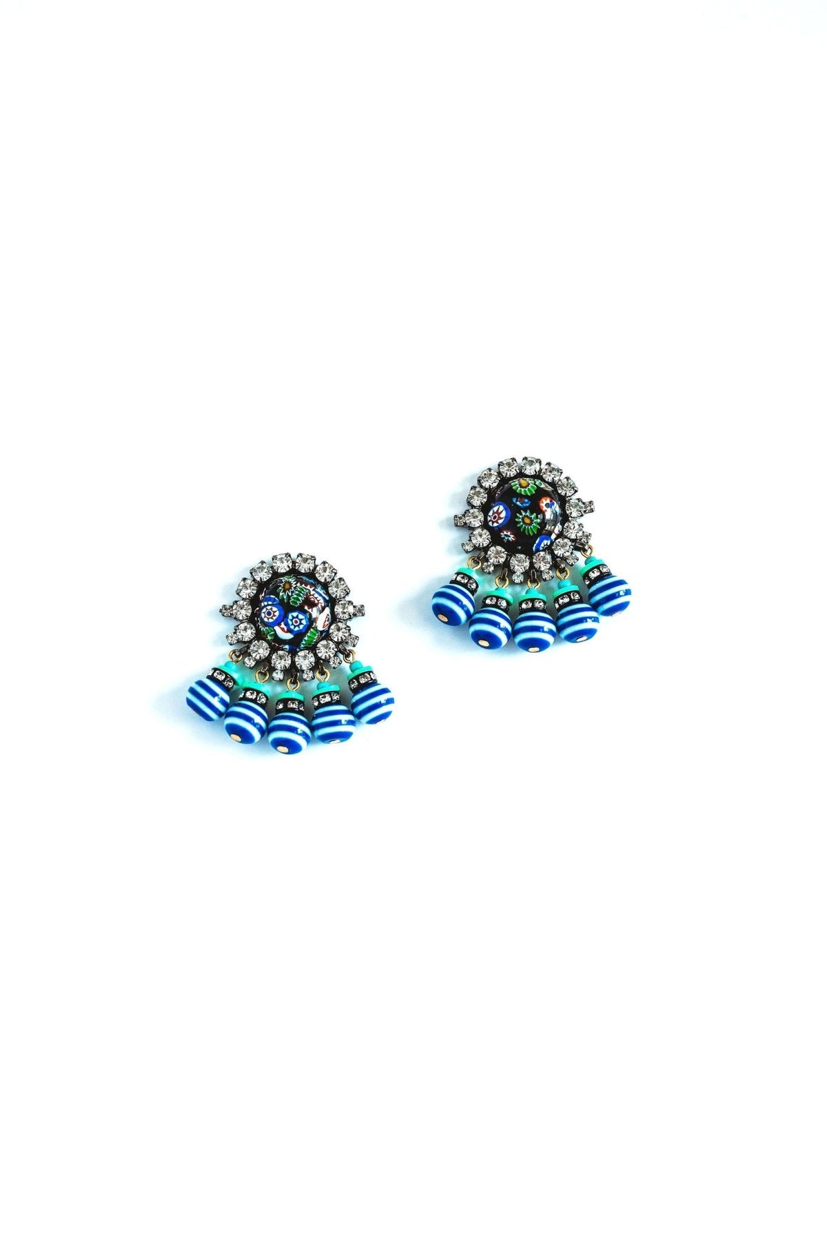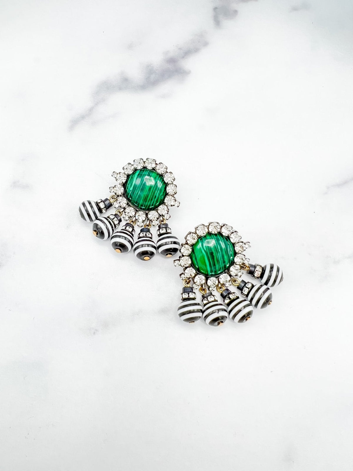 These Addison Earrings by Elizabeth Cole – These large studs feature brightly patterned circular stones, dangling blue and white striped beads, and are finished with neon green and crystal details. Add a playful touch to any outfit with these vibrant earrings.