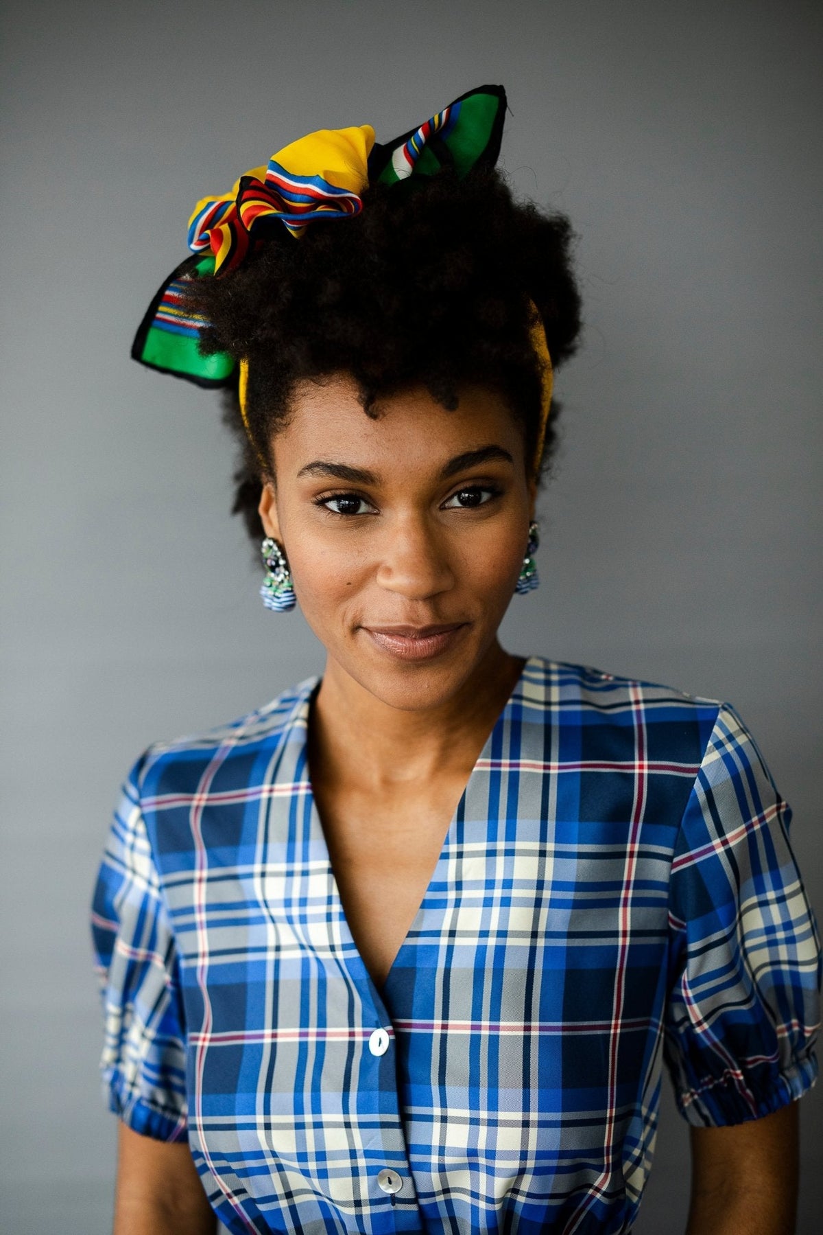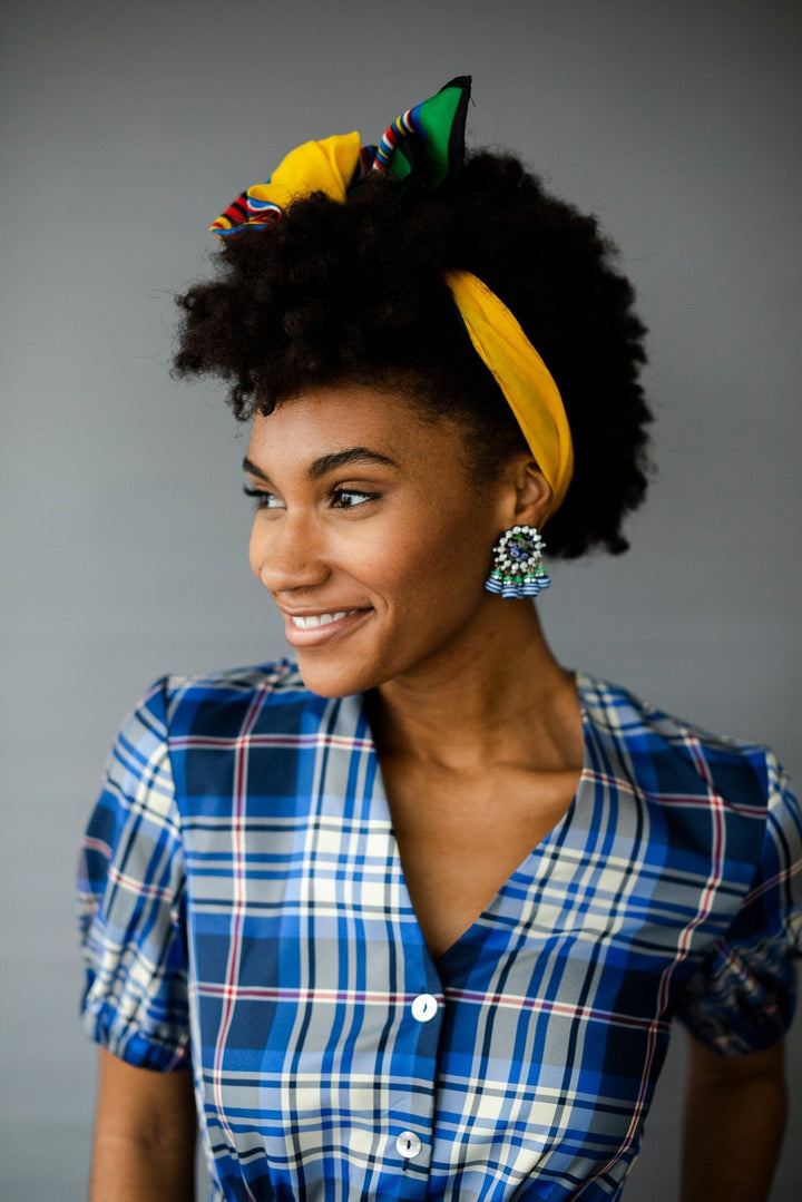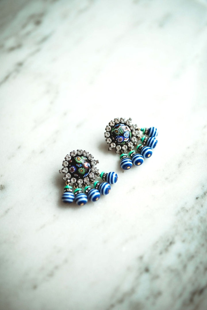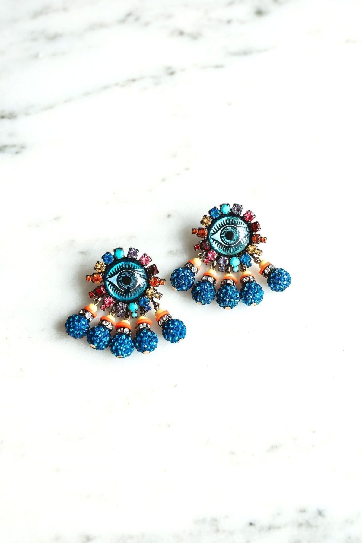 These Addison Earrings by Elizabeth Cole – These large studs feature brightly patterned circular stones, dangling blue and white striped beads, and are finished with neon green and crystal details. Add a playful touch to any outfit with these vibrant earrings.