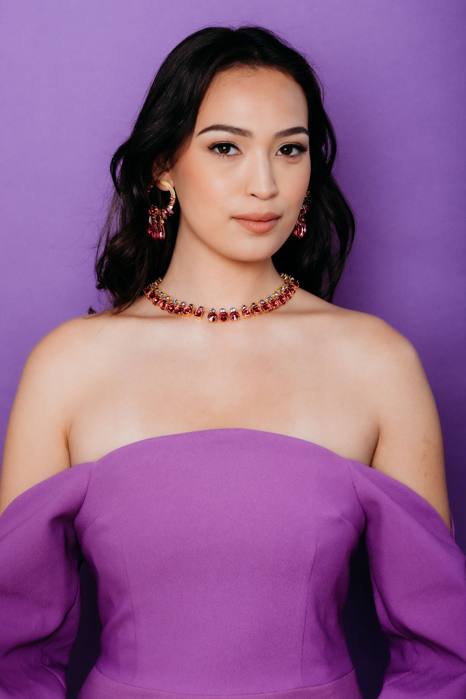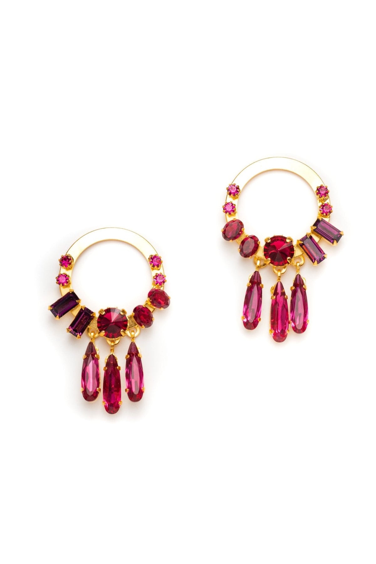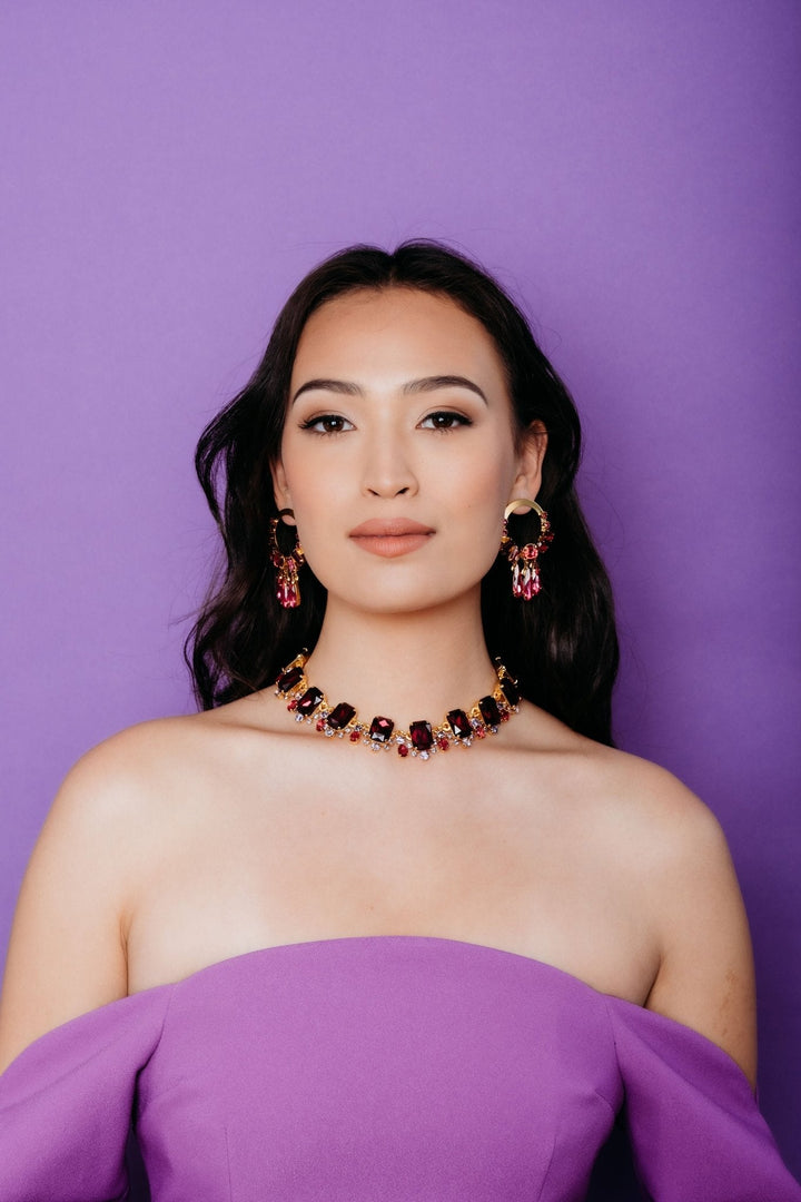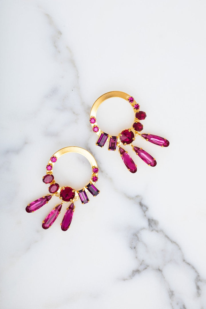These Aiko Earrings by Elizabeth Cole – Make a statement with these front-facing hoop earrings, featuring Swarovski crystals in ombre jewel tones and skinny pear fringe. These head-turning earrings are perfect for a night out and proudly made in the USA.