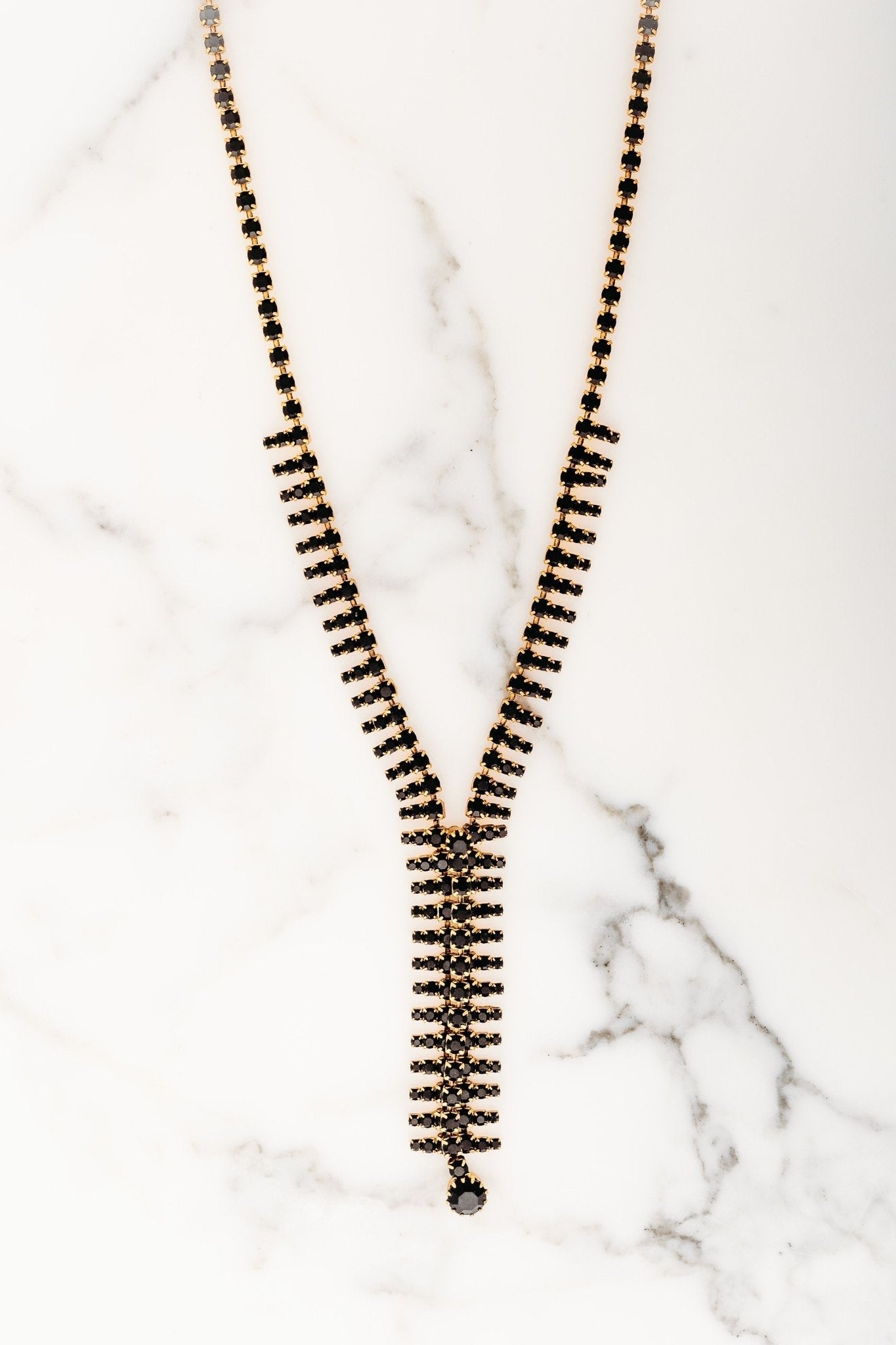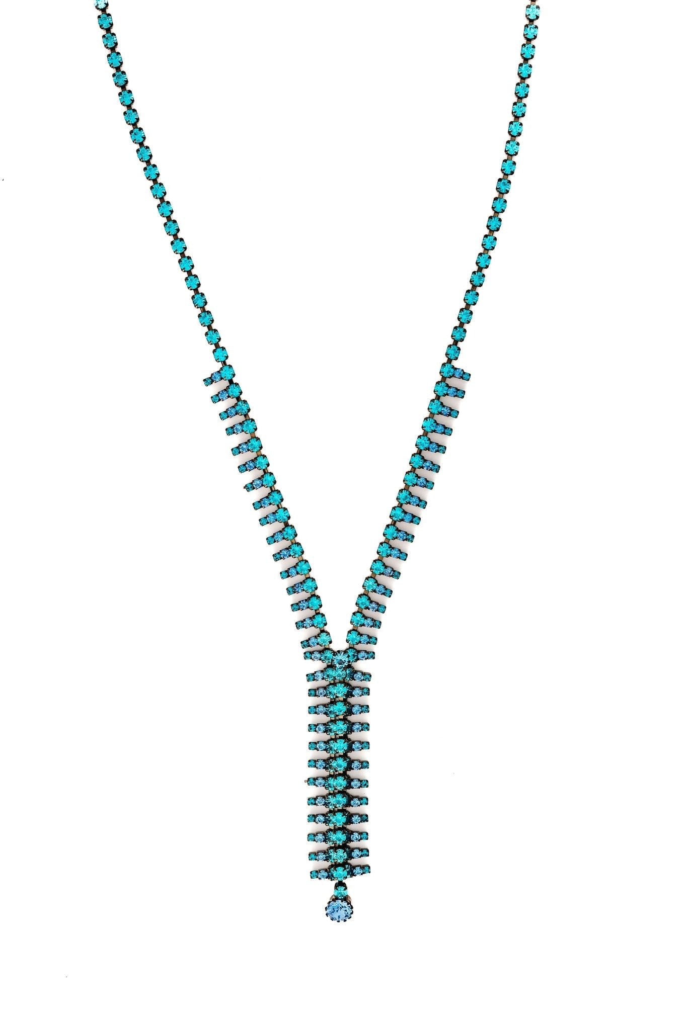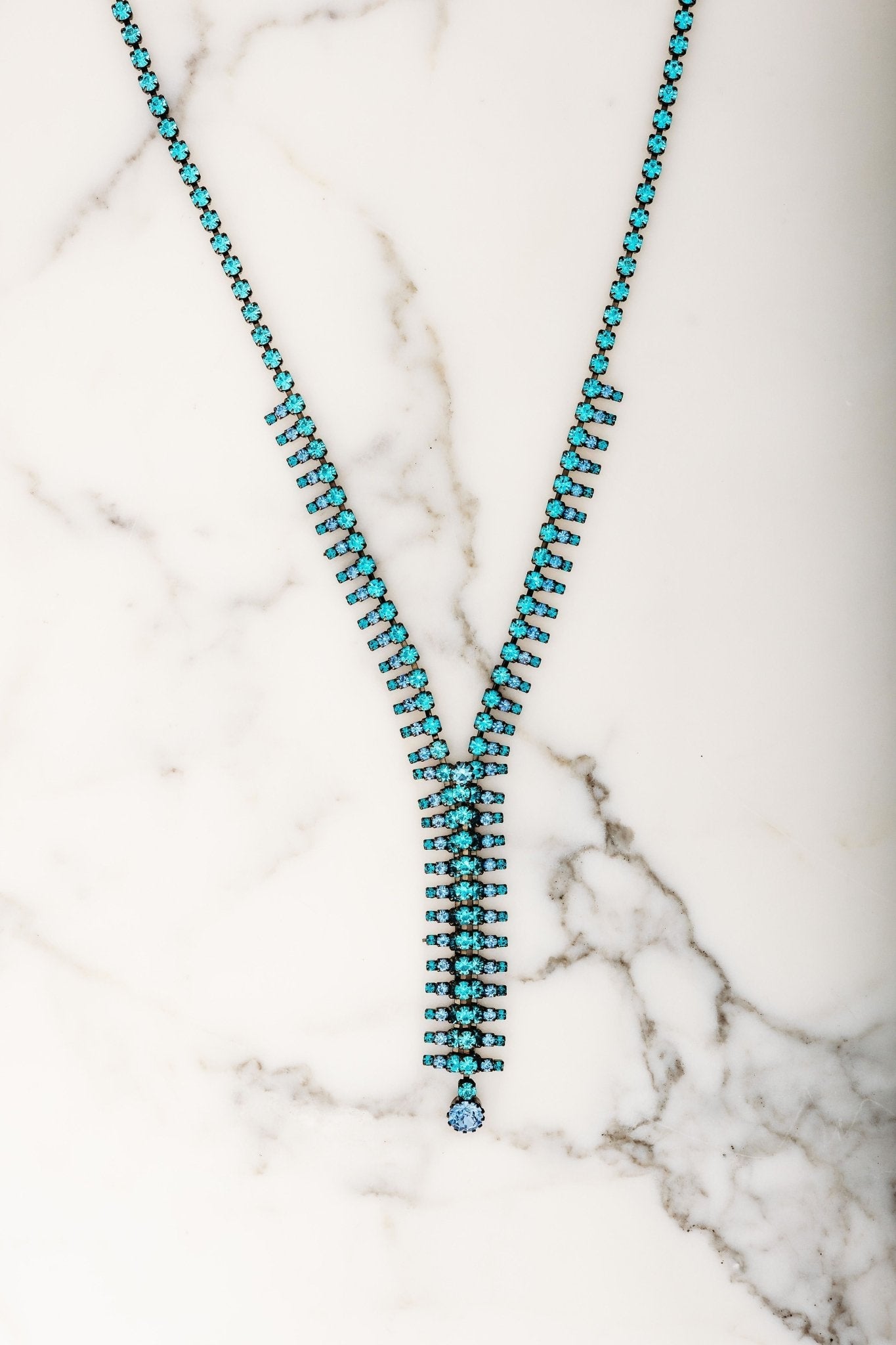 This Alani Necklace by Elizabeth Cole – Make a stunning statement with this showstopper necklace featuring dazzling Czech crystals and a zipper component, available in bright blue or classic jet. Elevate your night-out look with this unique accessory.