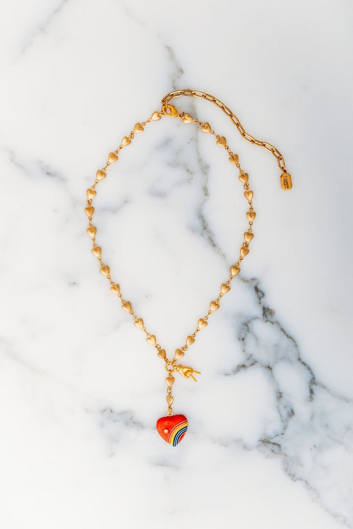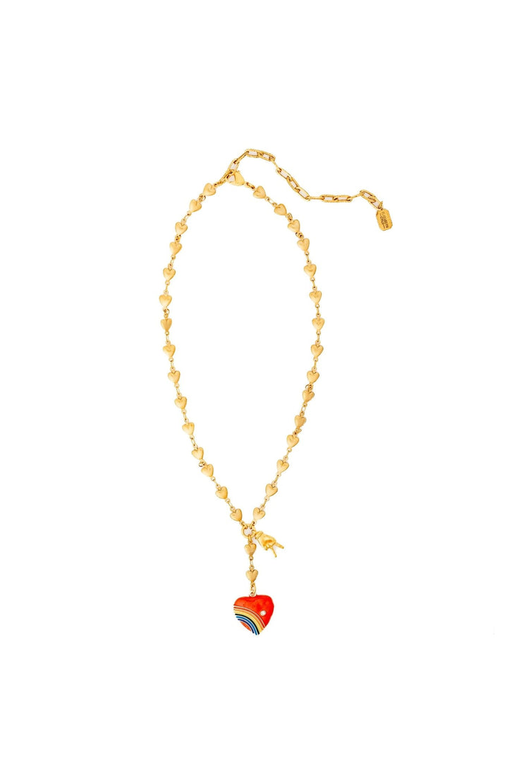 This Alessia Necklace by Elizabeth Cole – Add a pop of color and playful charm with this handmade necklace featuring 24kt gold-plated links, golden hearts, and a bright red heart with rainbow details and a peace sign charm. Wear it with pride and make a statement.