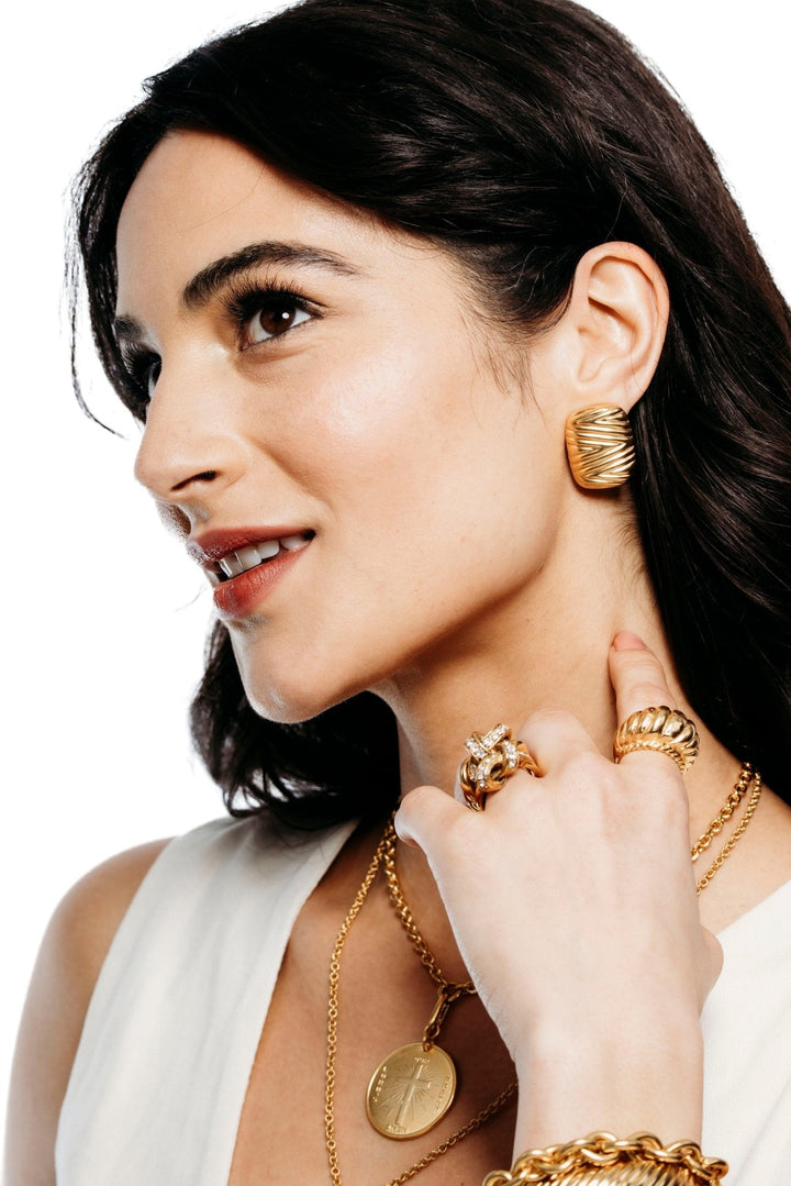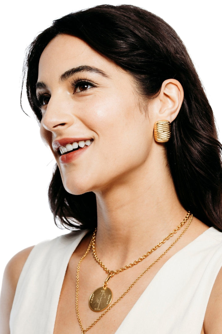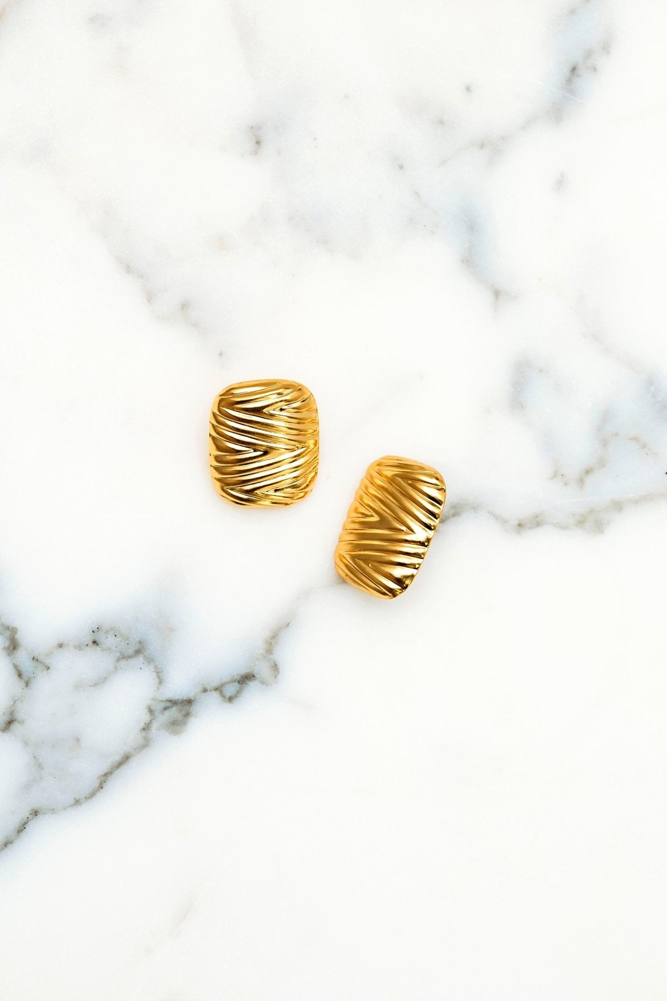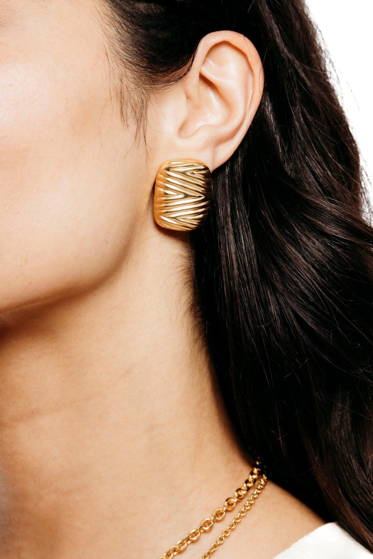 These Almera Earrings by Elizabeth Cole – Get groovy with these large stud earrings, a nod to the eighties with their textured lines and playful retro style. Add a touch of flair to any outfit and feel chic with this throwback look.