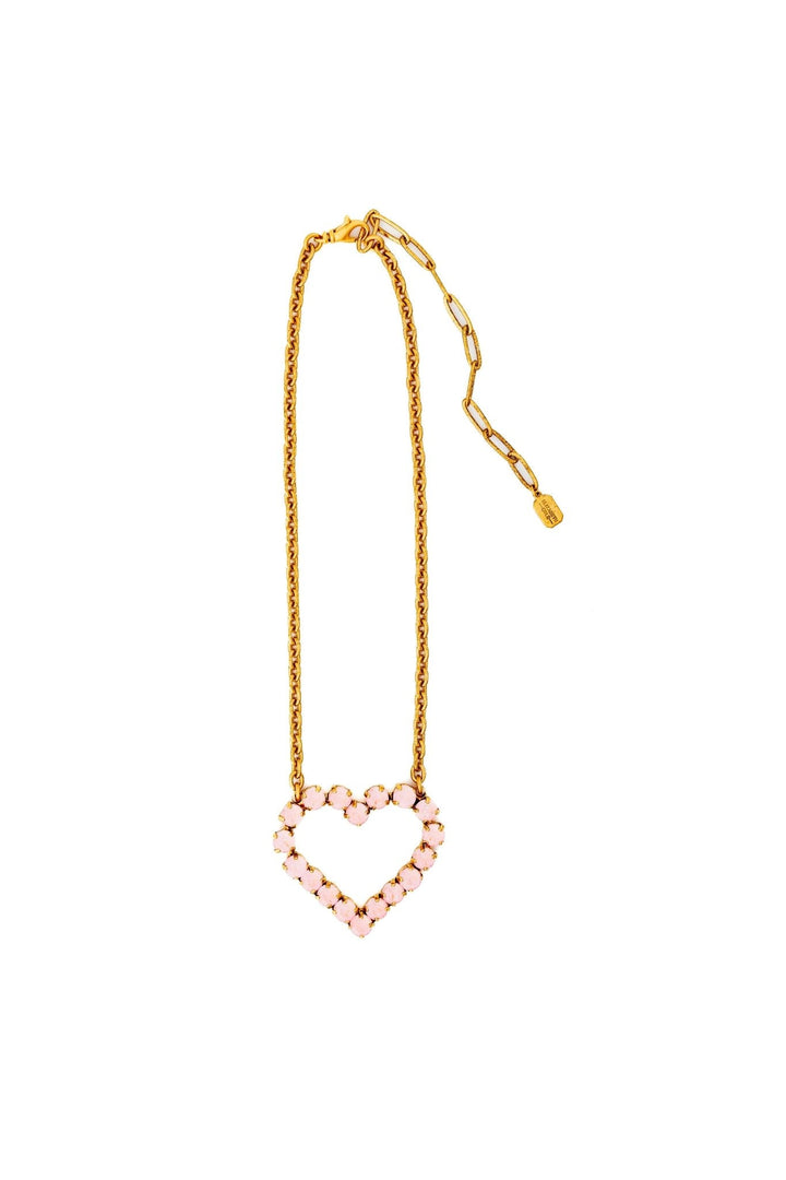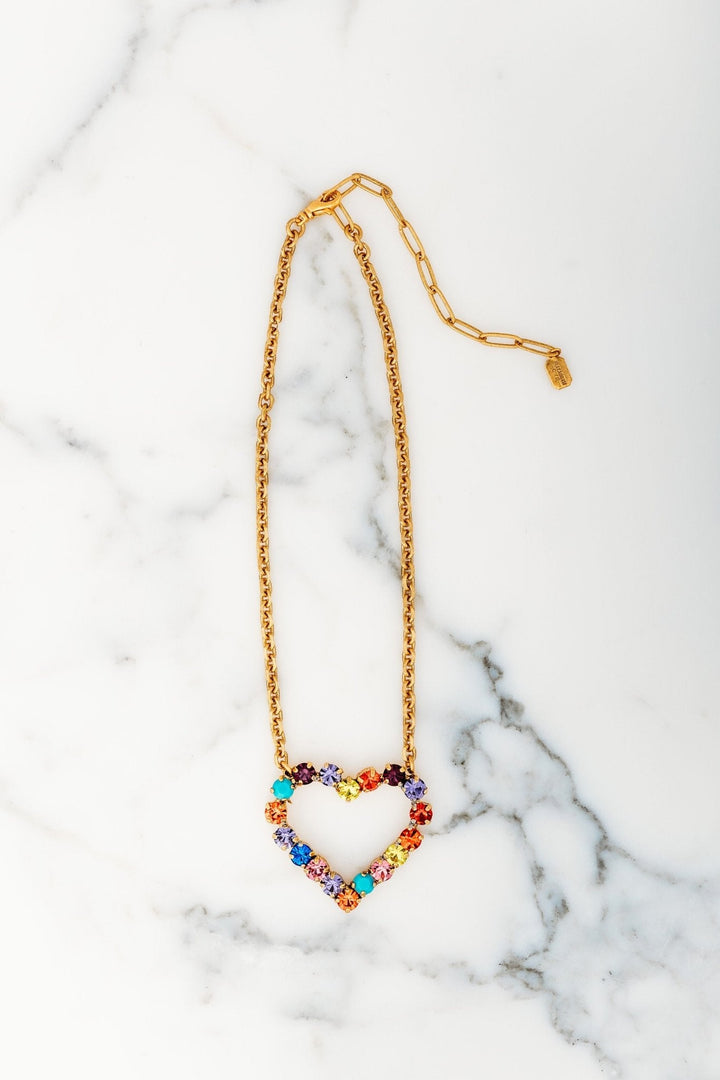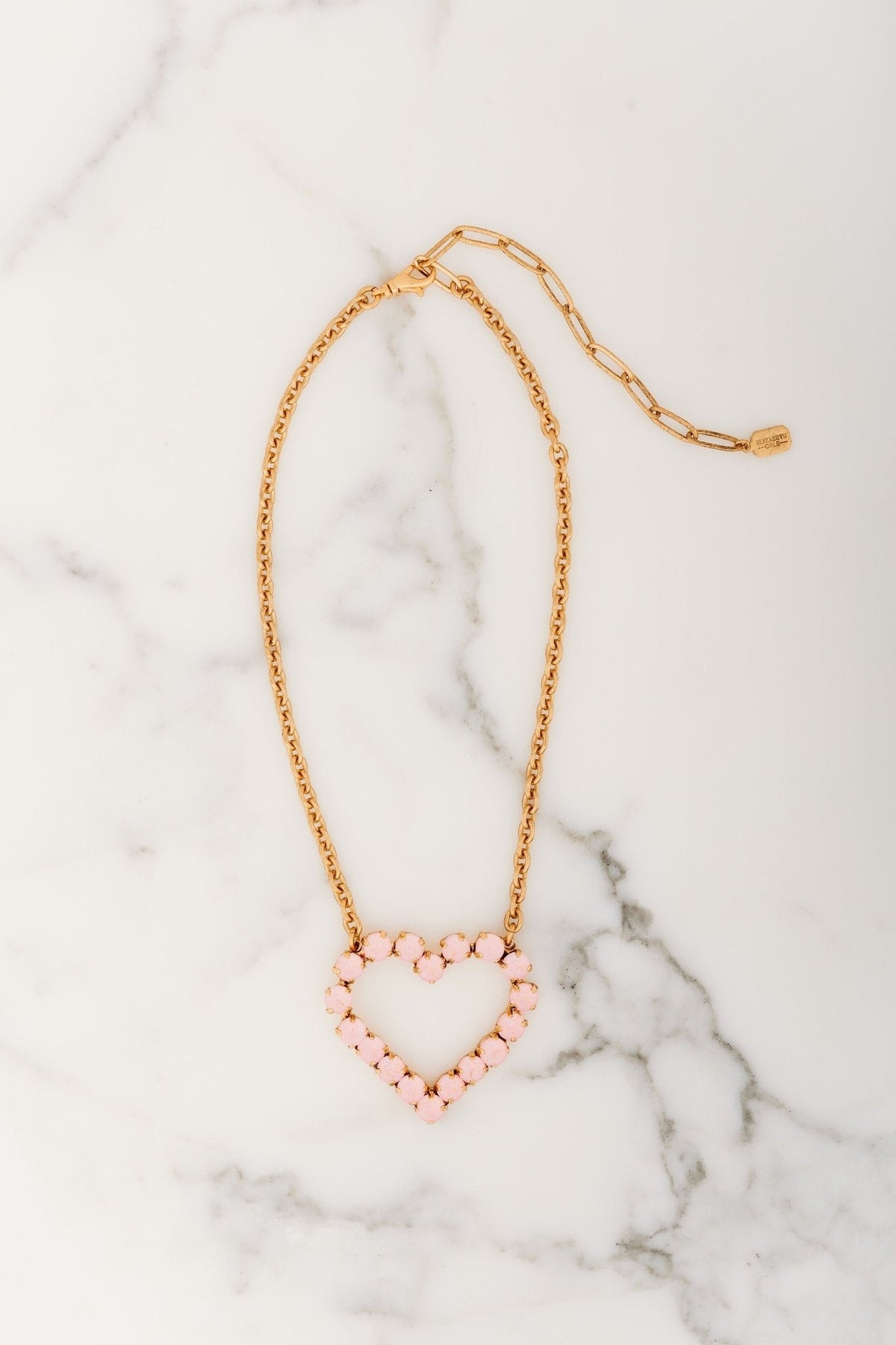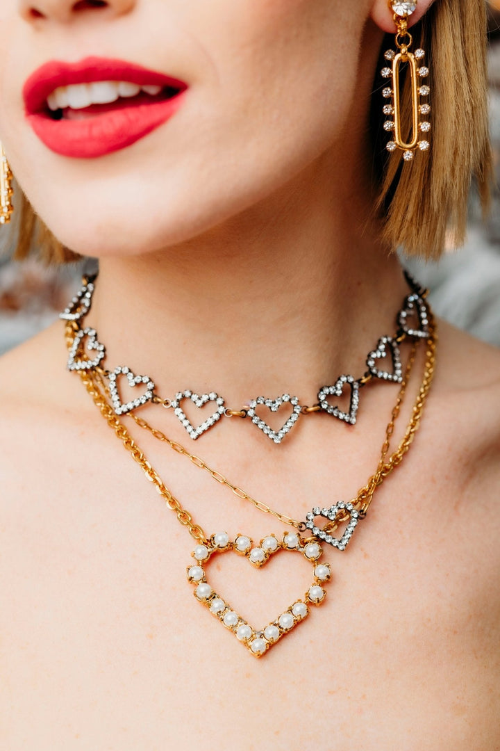 This Amora Necklace by Elizabeth Cole – A timeless piece featuring an open link chain and stationary open heart pendant. Available in blue, pink, faux pearl, and multi-crystal, this necklace adds charm and elegance to any outfit, making it perfect for any occasion.