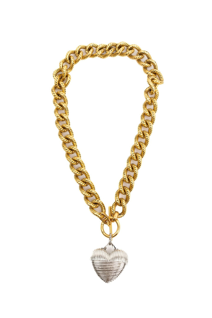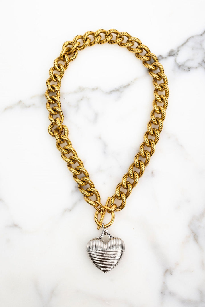 Textured Silver Heart, Chunky Golden Chain, Front Toggle Clasp, Made in the USA. Length: 16'