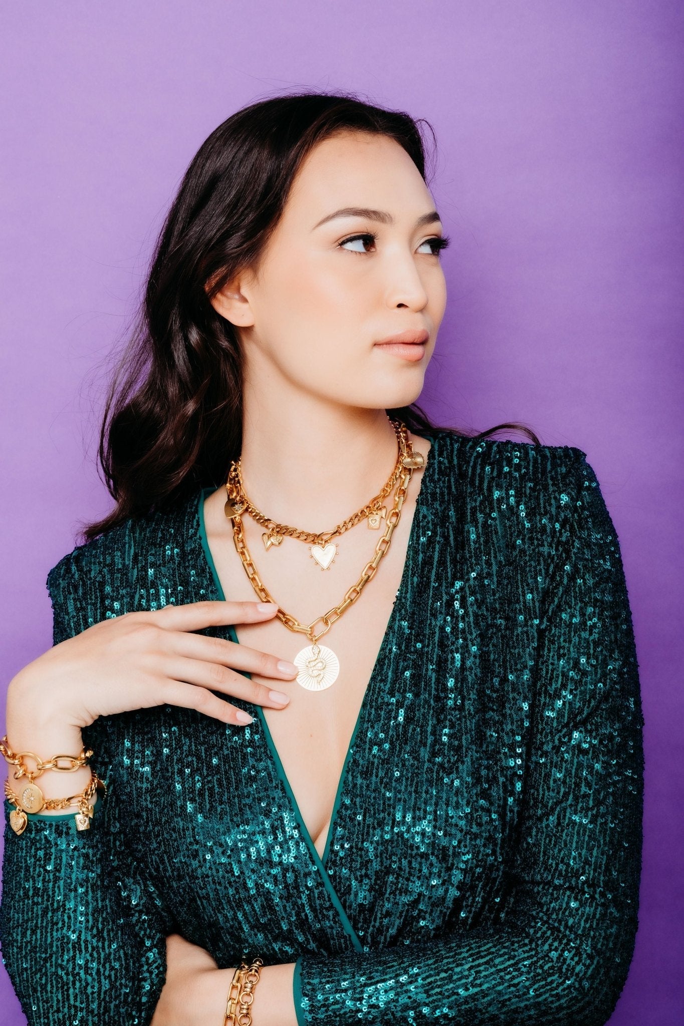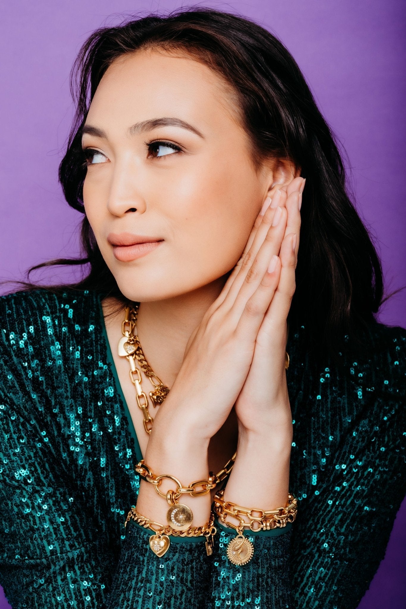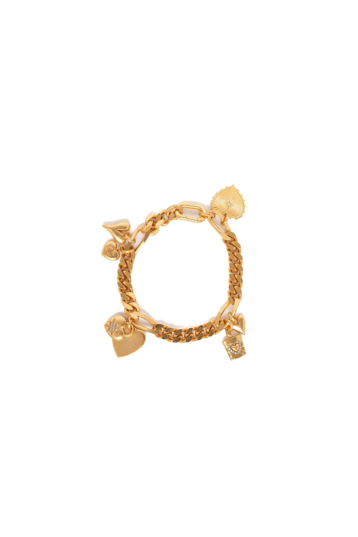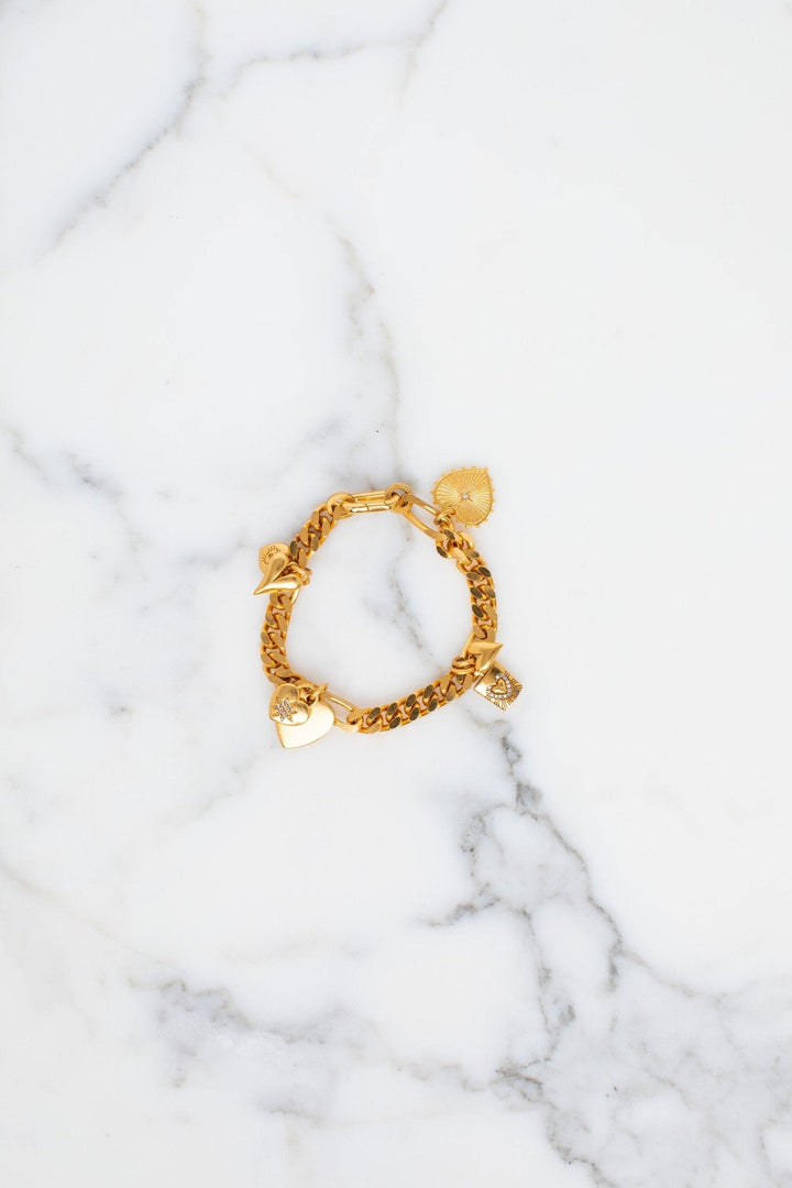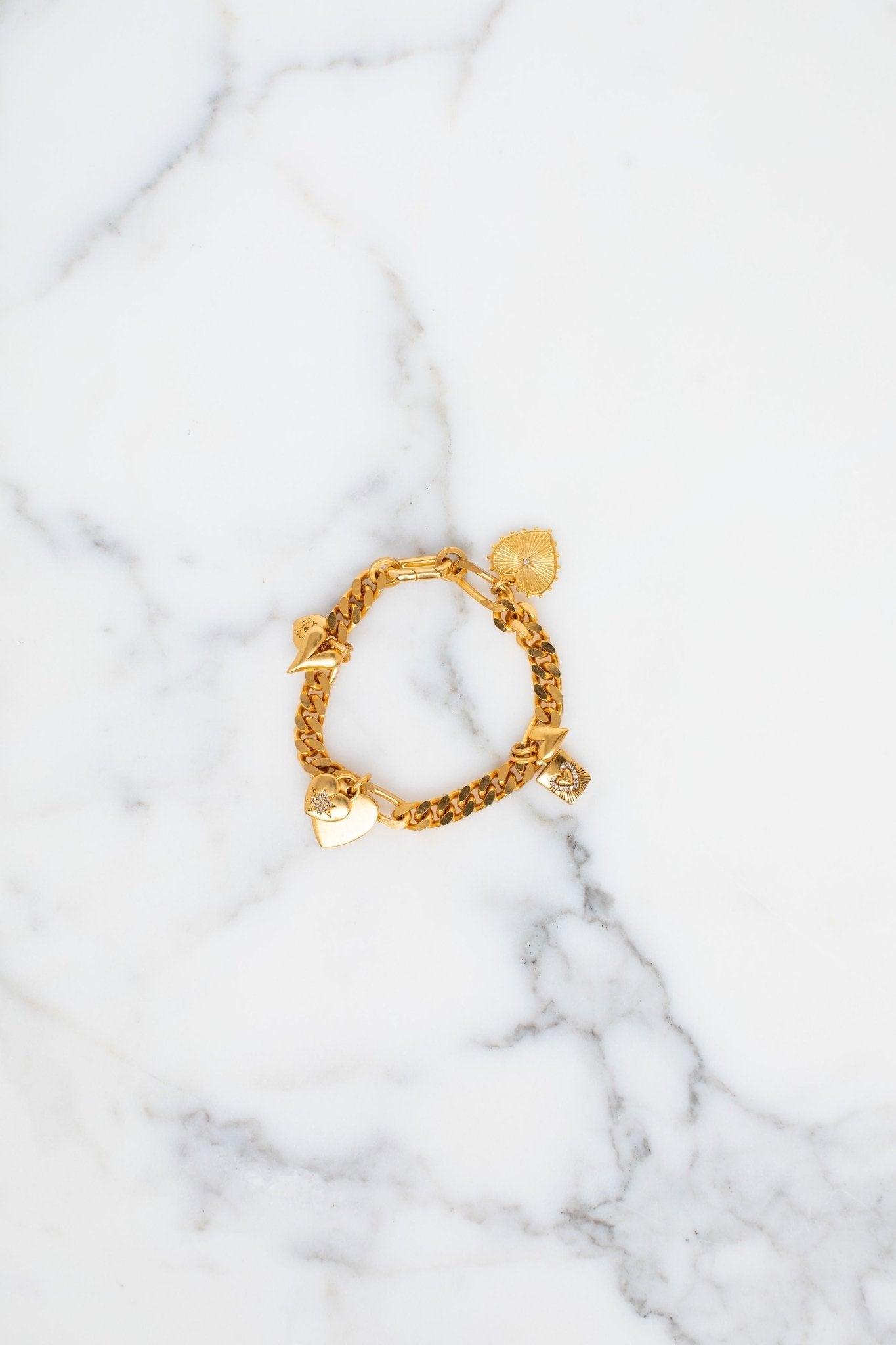 This Auryn Bracelet by Elizabeth Cole – Make a statement with this beautiful bracelet, featuring golden links and four heart charms adorned with crystals. This daring and glamorous accessory will add the perfect touch of luxury to any outfit.