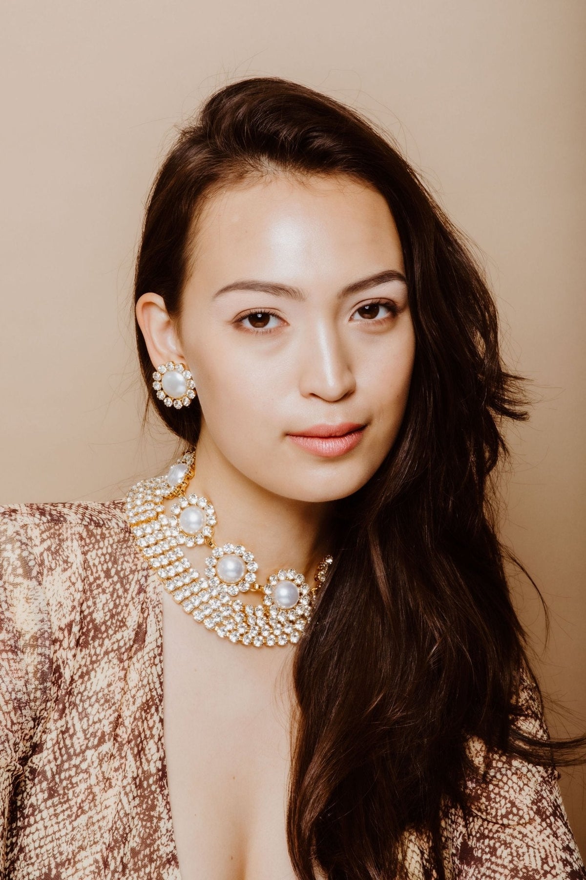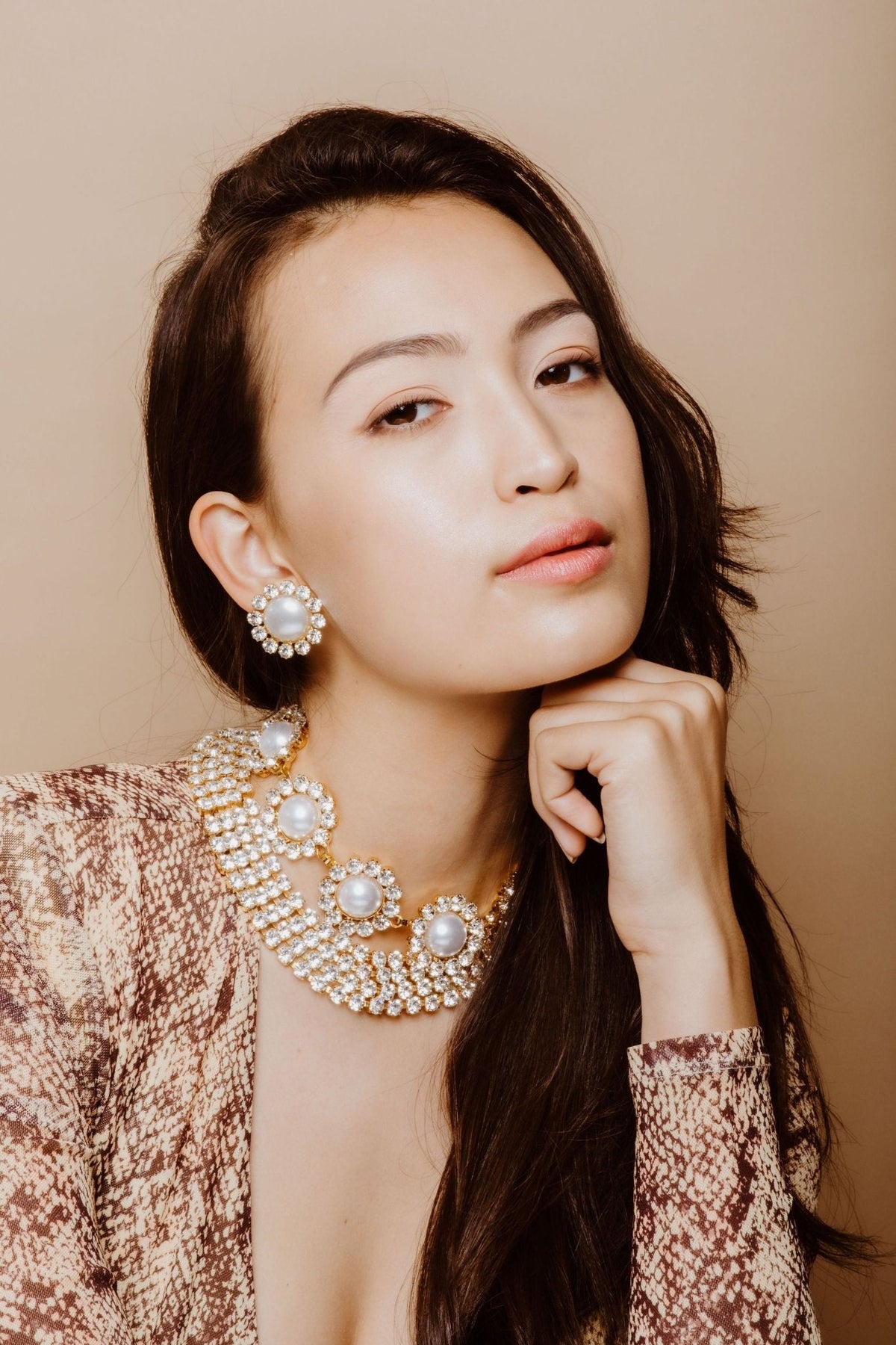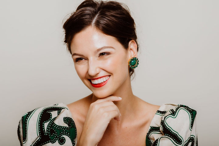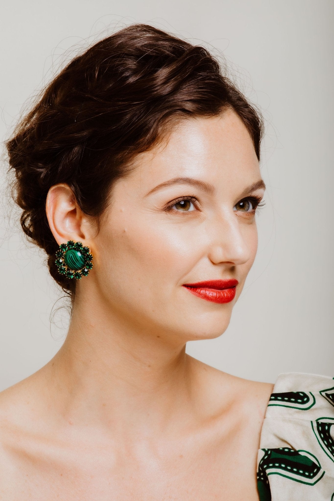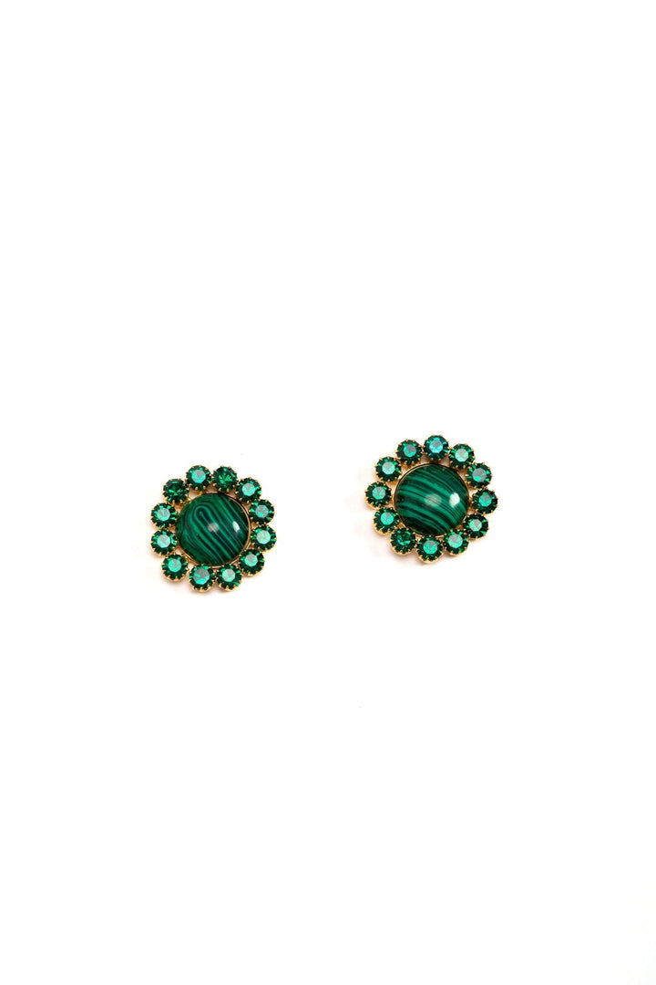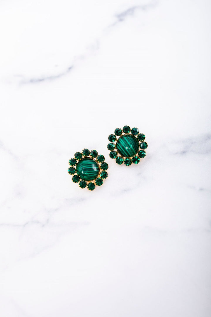 These Aylin Earrings by Elizabeth Cole – Oversized and glamorous, these studs feature round pearls or malachite surrounded by glittering round crystals in emerald or crystal. Perfect for a statement-making, yet understated, look.