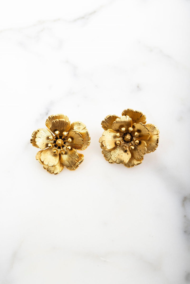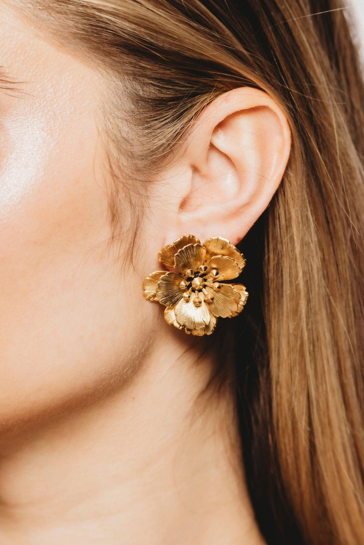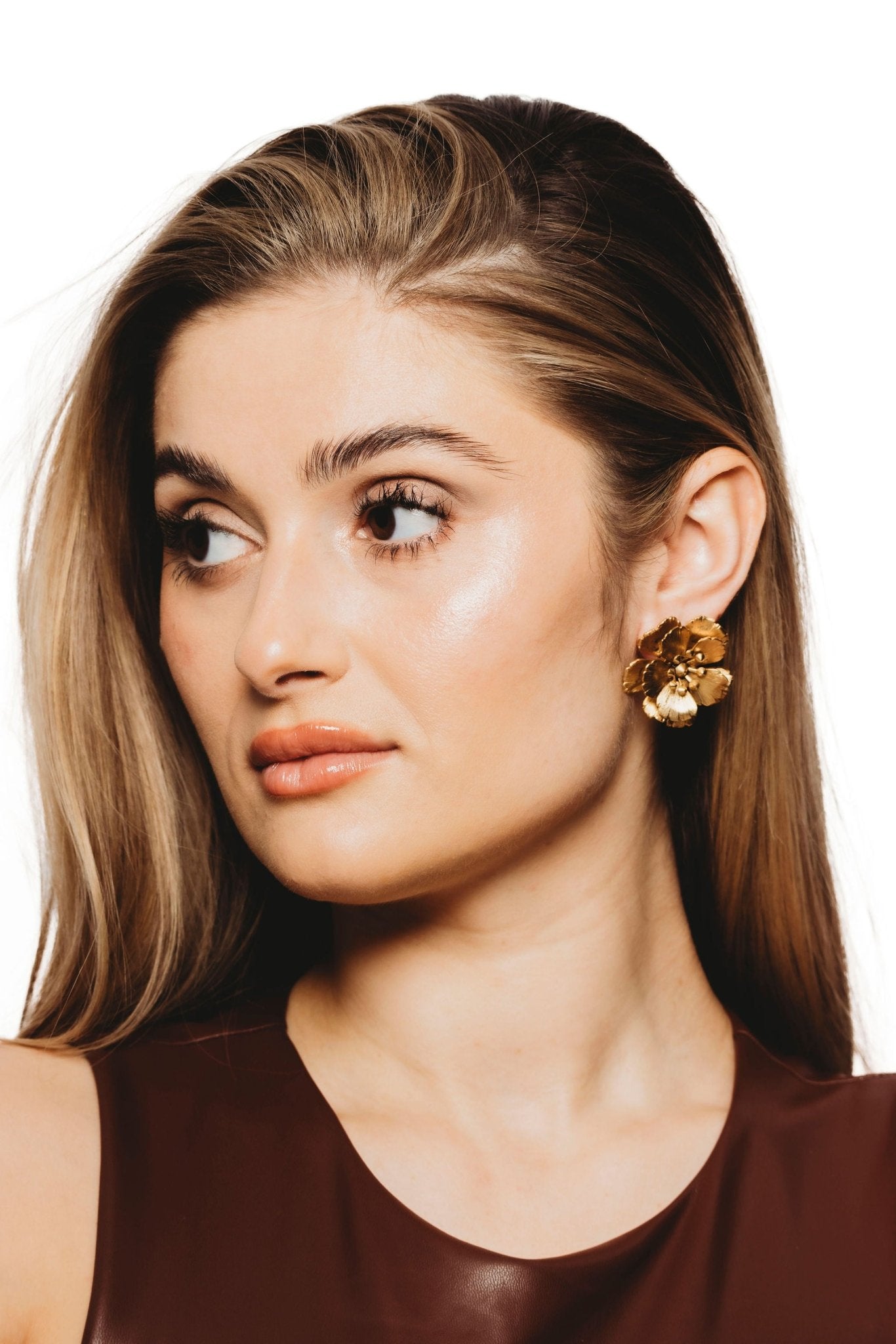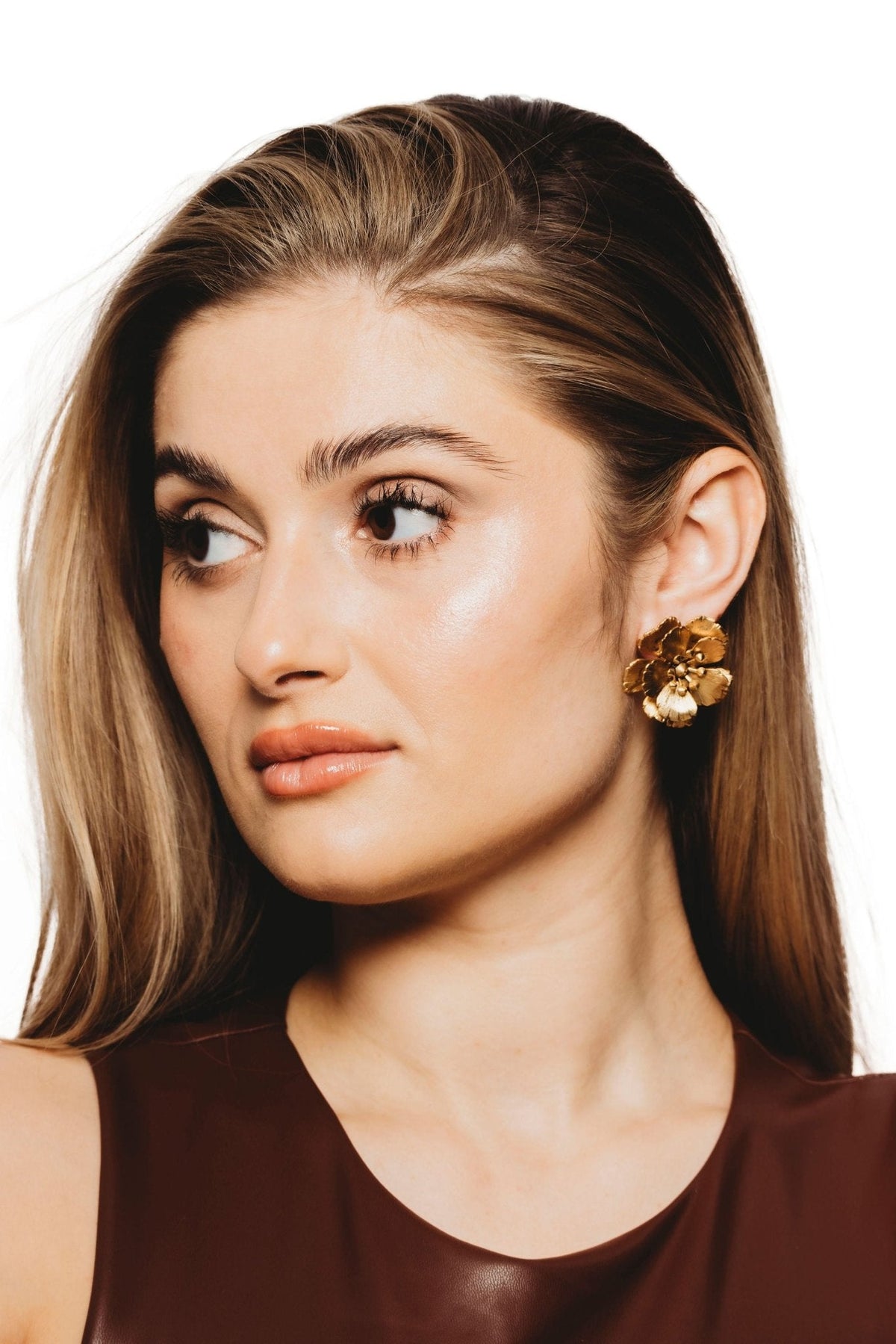 These Betania Earrings by Elizabeth Cole – Add a whimsical touch to your look with these golden layered floral studs. Perfect for standing out from the crowd with elegance and playfulness.