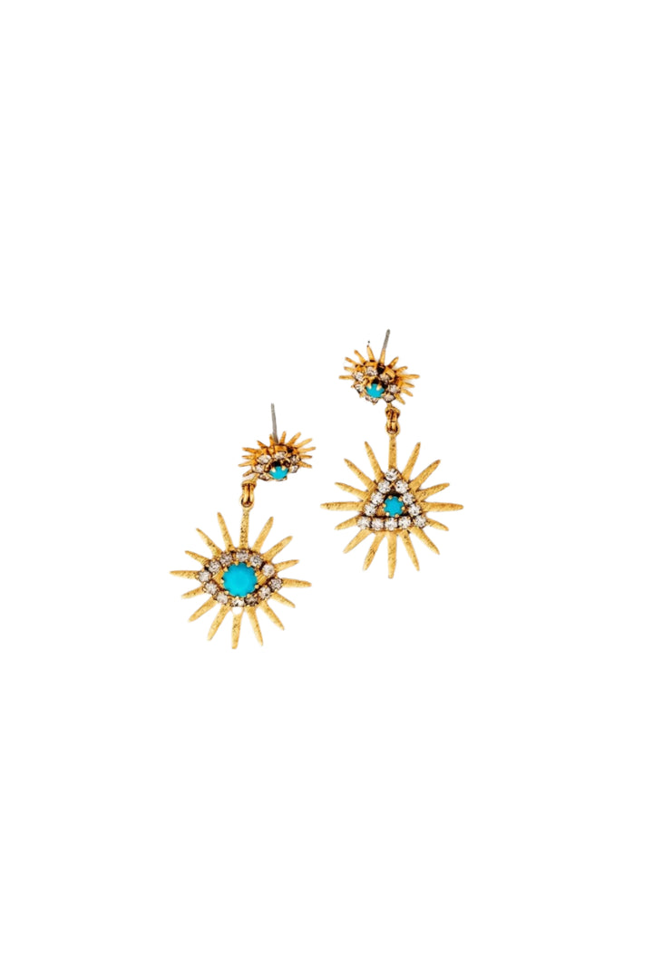 These Callaia Earrings by Elizabeth Cole – Unleash your inner risk-taker with these dangle sunburst earrings, adorned with crystals and faux turquoise. Featuring powerful glyph symbols of protection and understanding, they add confidence and style to any adventure.