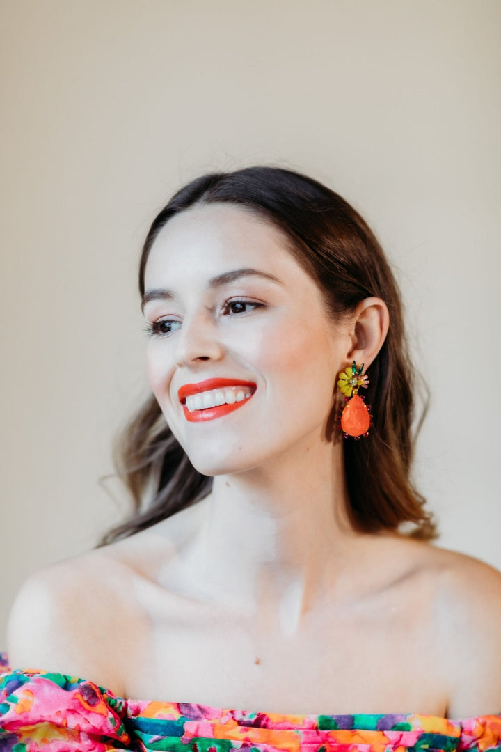 These Camelia Earrings by Elizabeth Cole – Add a burst of floral color to your spring wardrobe with these earrings featuring oversized coral pink pears, floral studs with vintage yellow petals, glittering emerald green leaves, and pale pink baguettes.