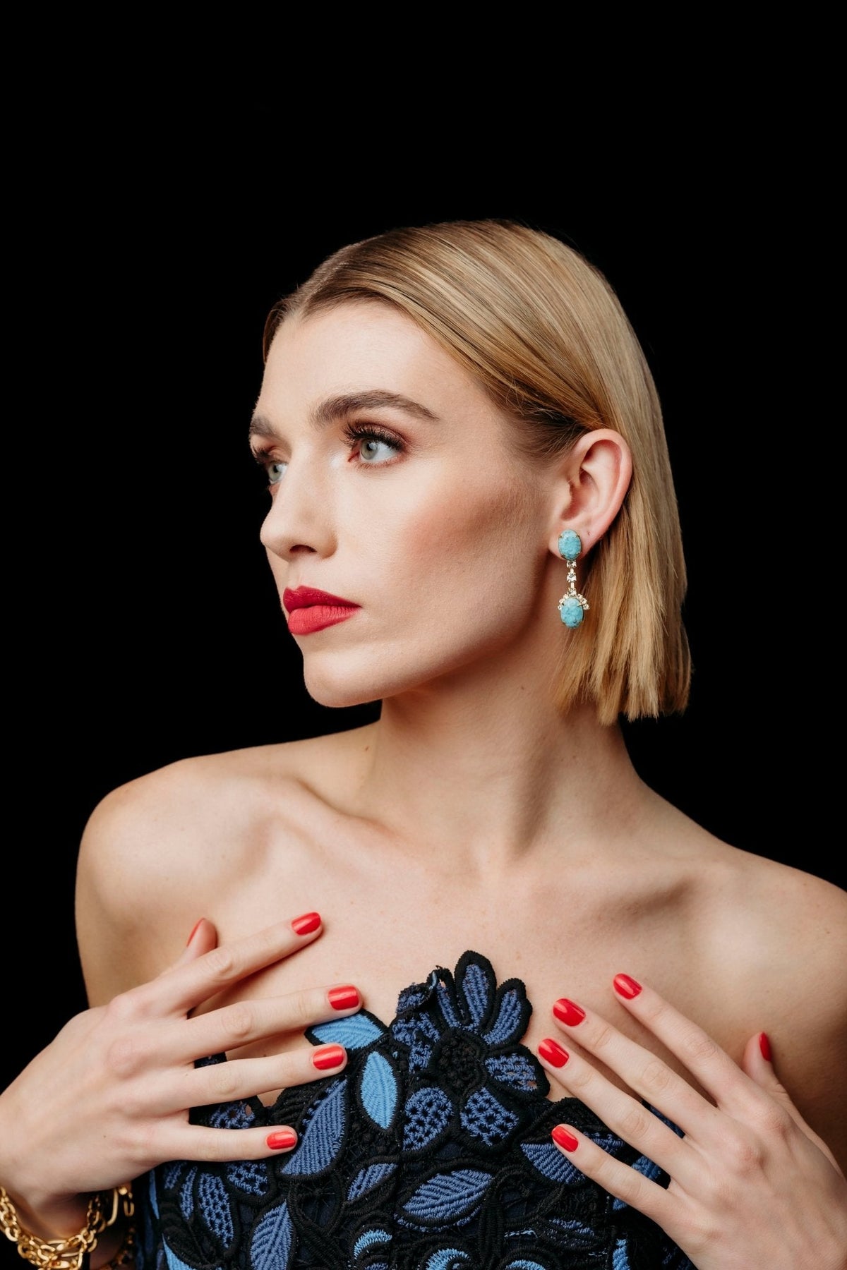 These Capri Earrings by Elizabeth Cole – Add a touch of sophistication and elegance with these dangle earrings featuring faux turquoise and sparkling crystals. Perfect for elevating your style on any occasion, these earrings are a must-have for fashion-forward individuals.
