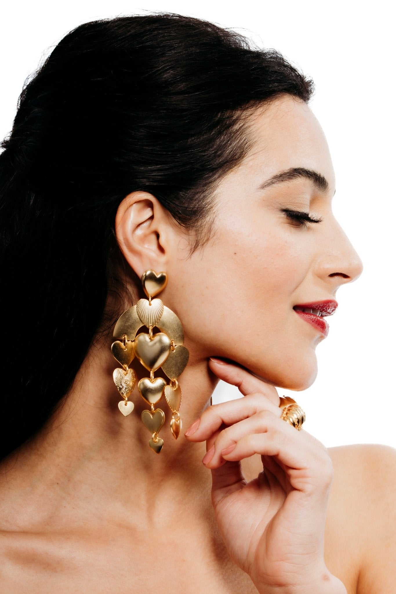 These Carissa Earrings by Elizabeth Cole – Make a statement with these oversized earrings featuring golden arches and graduated hearts. They add a touch of whimsy and charm to any outfit, making them a fun and bold accessory.