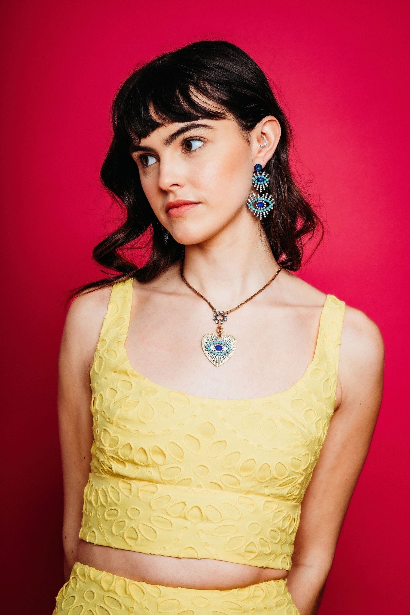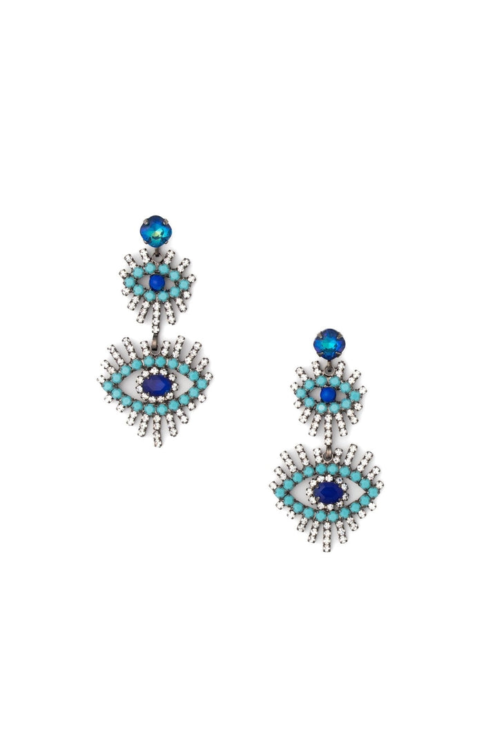 These Casimir Earrings by Elizabeth Cole – These triple drop earrings feature gunmetal plating, evil eye, turquoise, and crystal details, with bold blue oval centers. Perfect for making a strong statement with serious attitude.