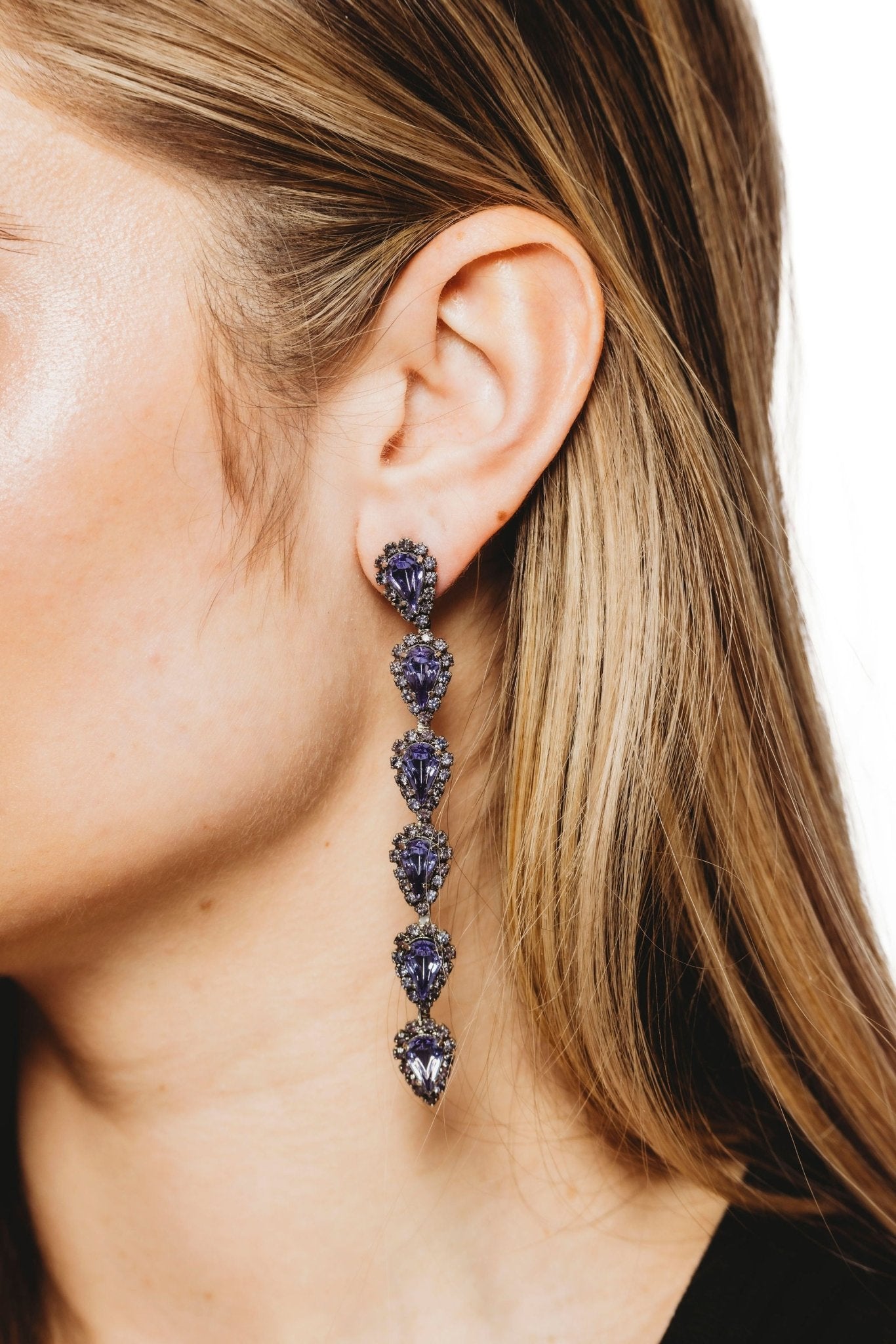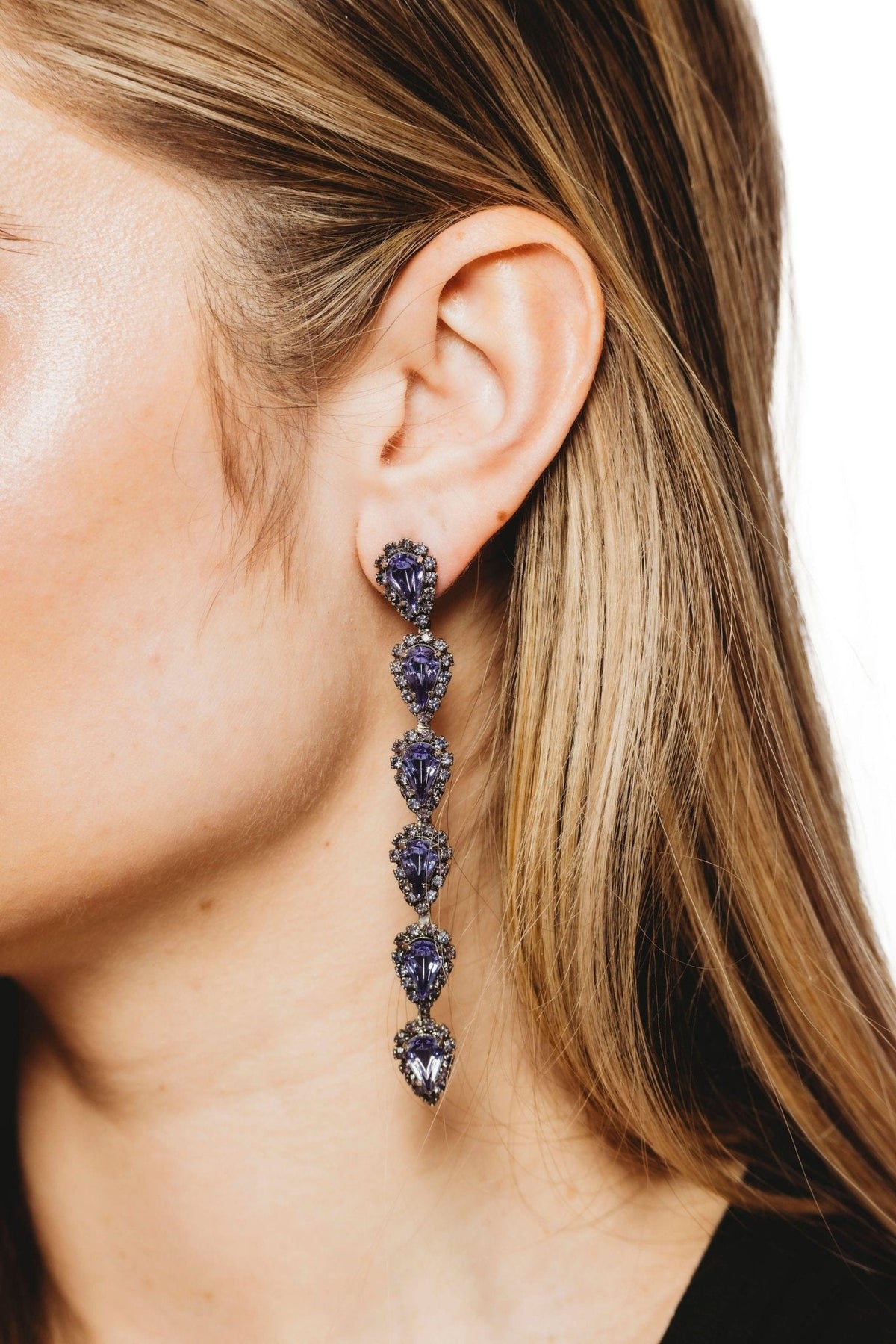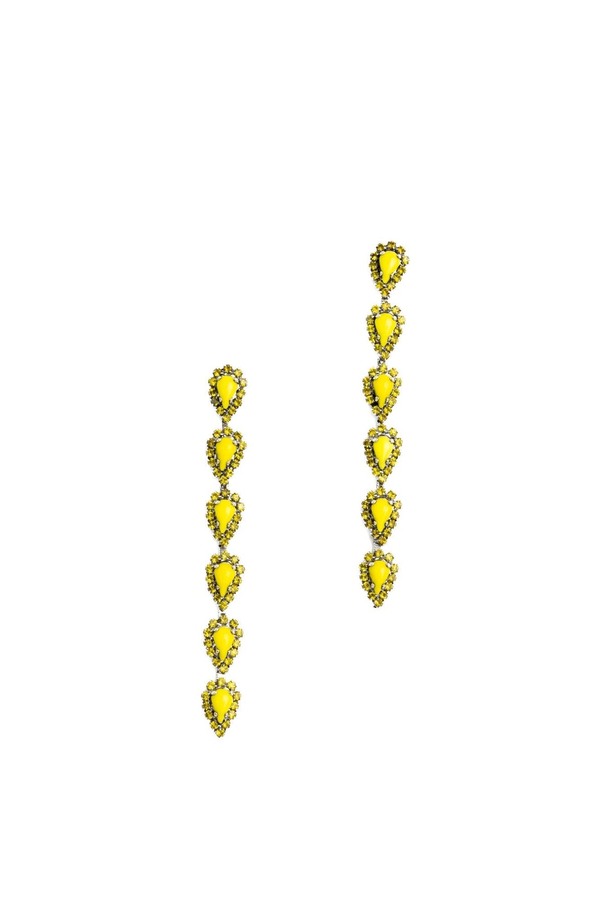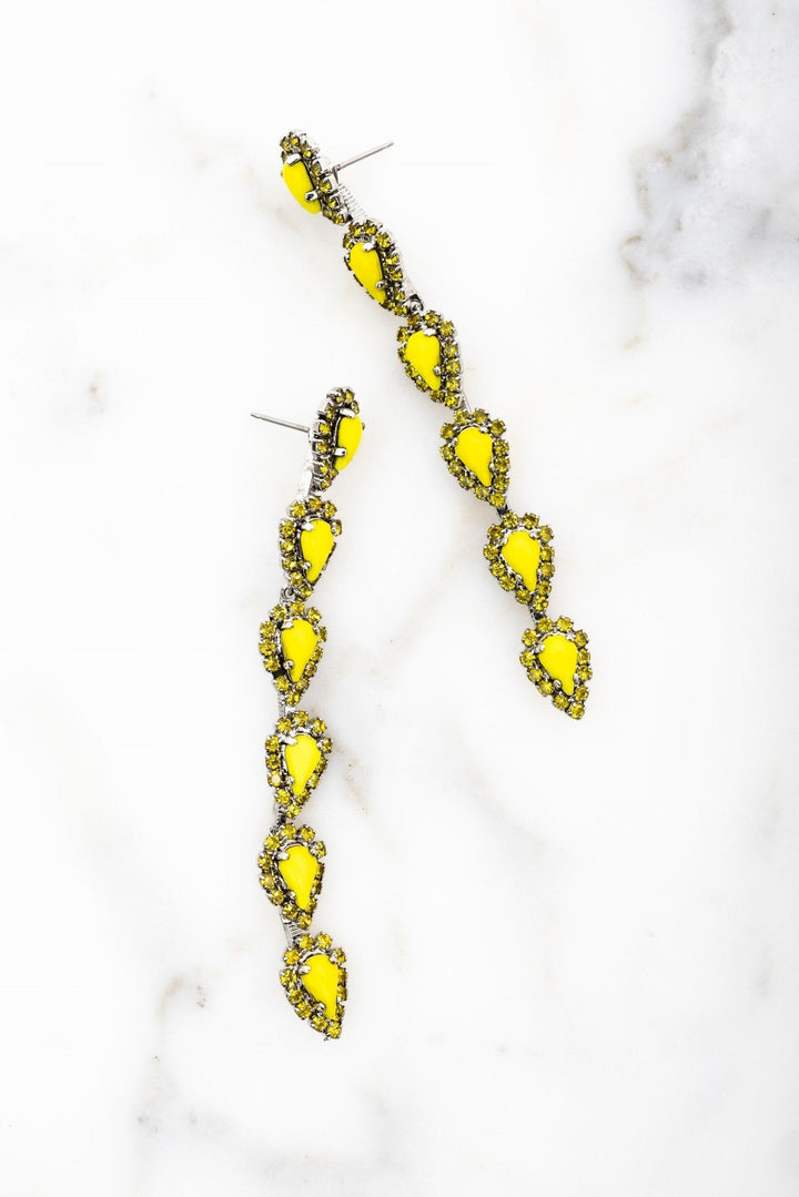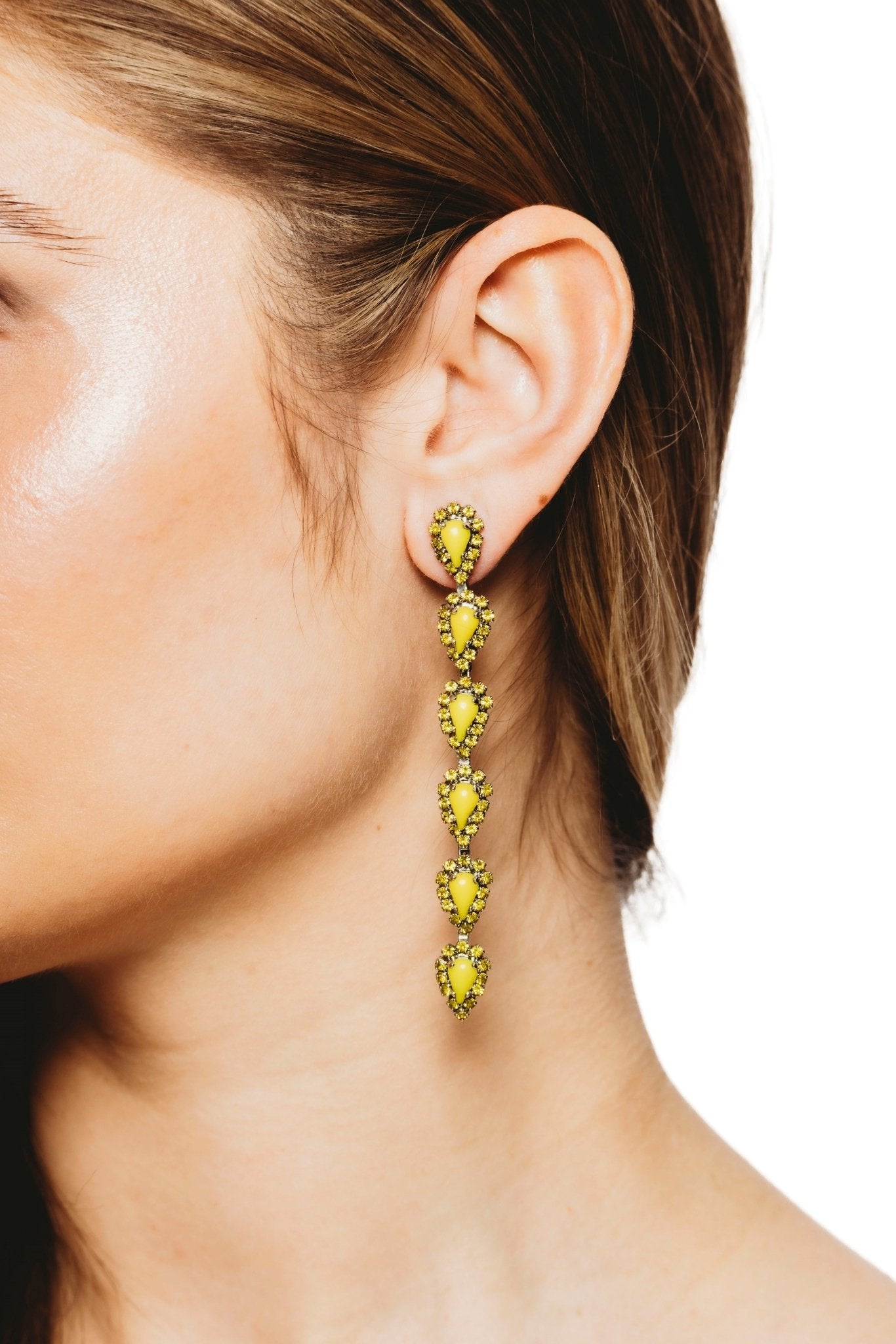 These Catríona Earrings by Elizabeth Cole – Playful and whimsical, these long linear earrings feature glittering petite pears surrounded by crystal details. Available in a variety of colors, they add a touch of sparkle to any outfit.