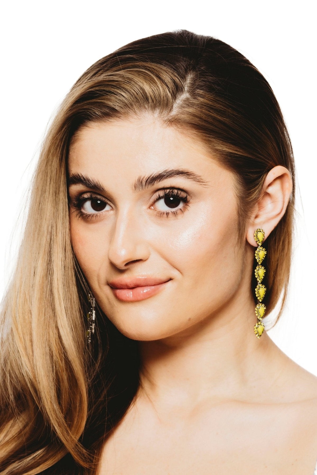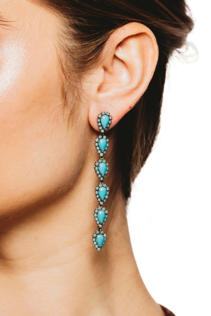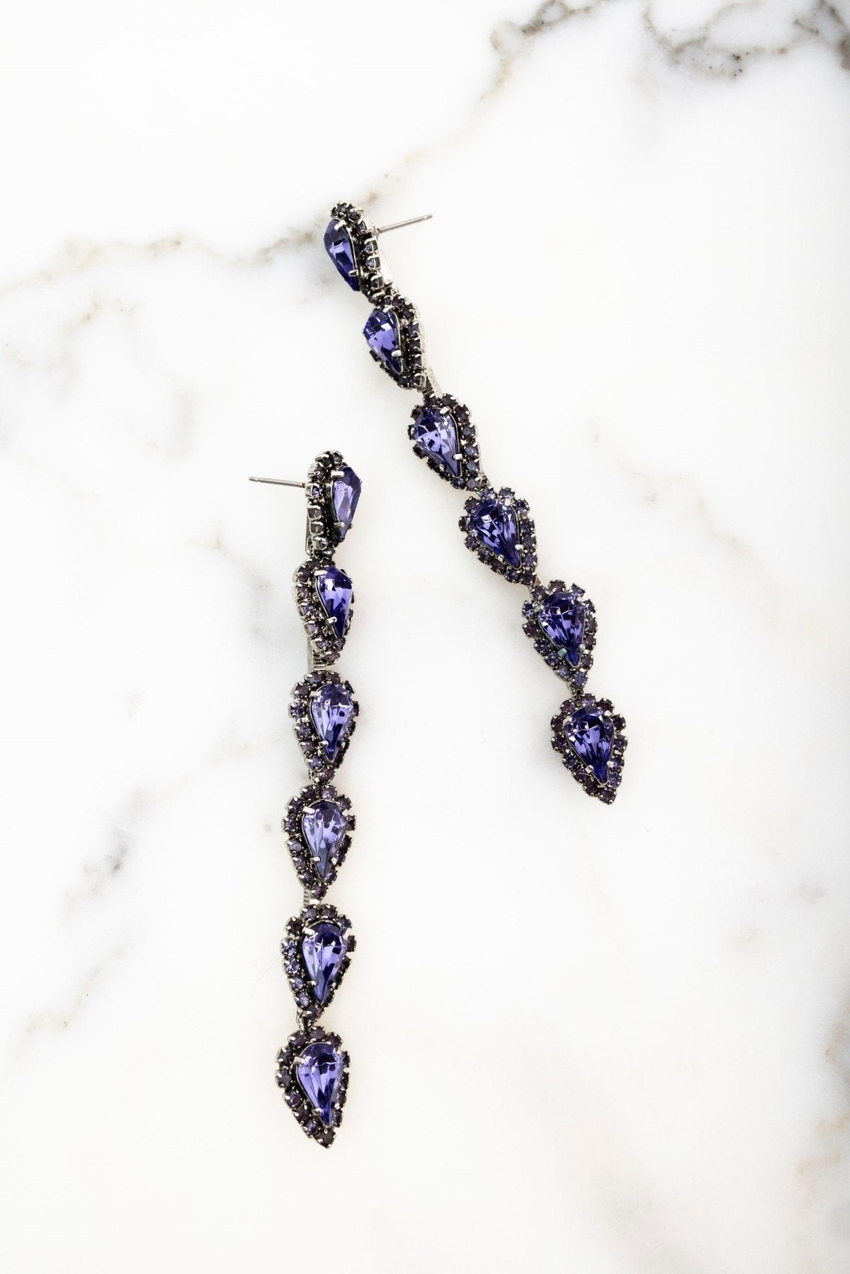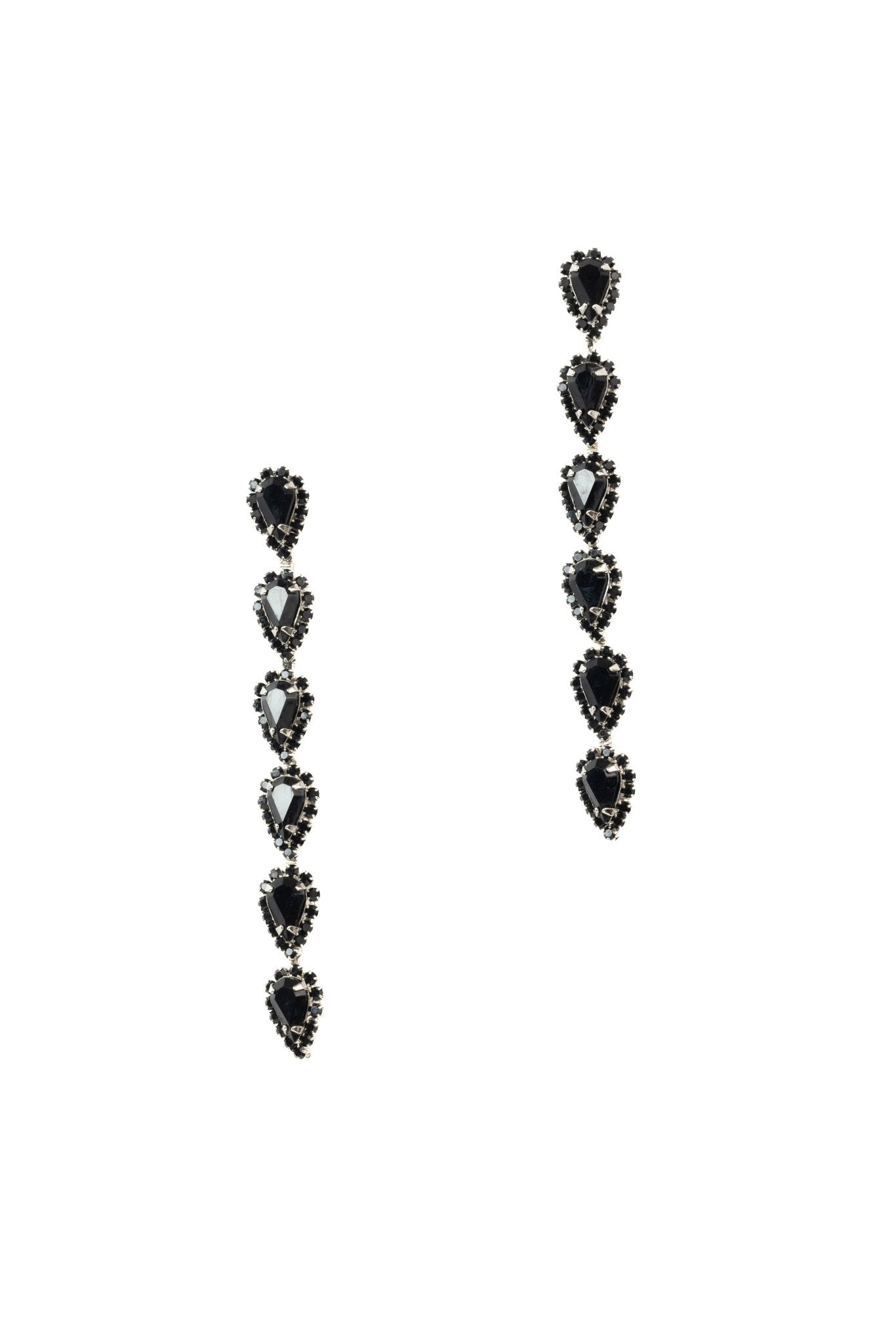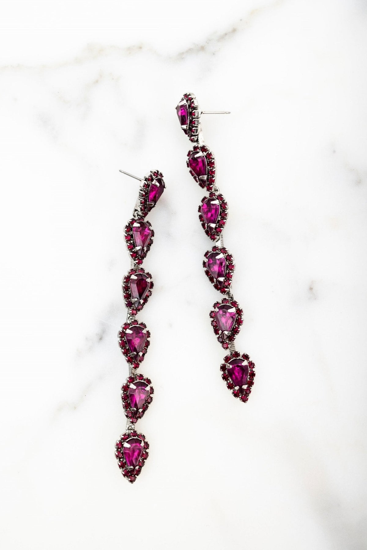 These Catríona Earrings by Elizabeth Cole – Playful and whimsical, these long linear earrings feature glittering petite pears surrounded by crystal details. Available in a variety of colors, they add a touch of sparkle to any outfit.