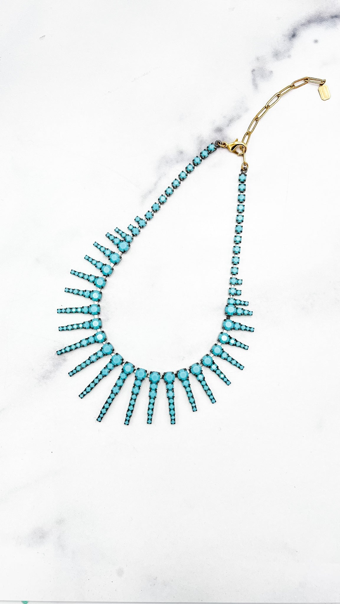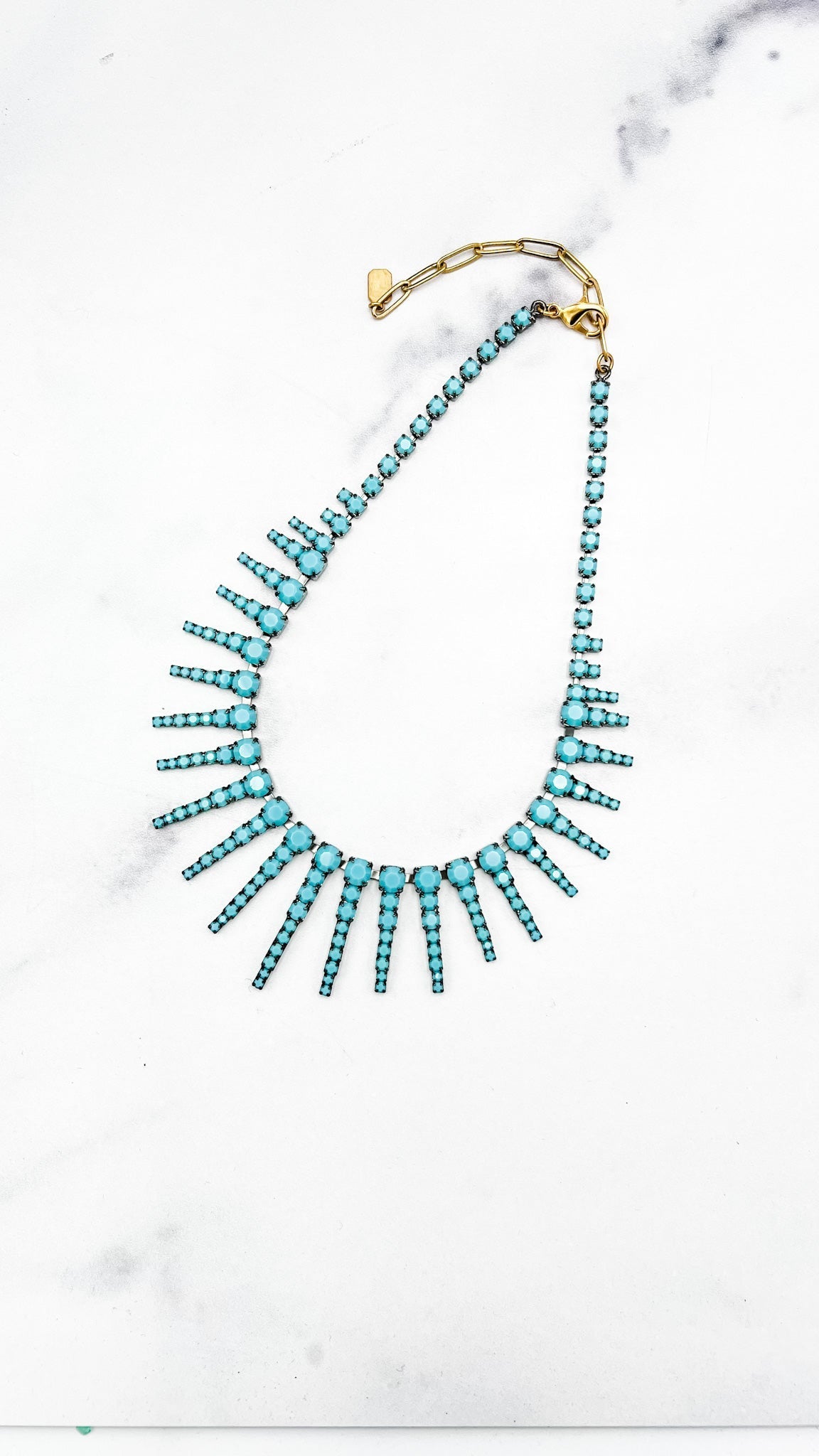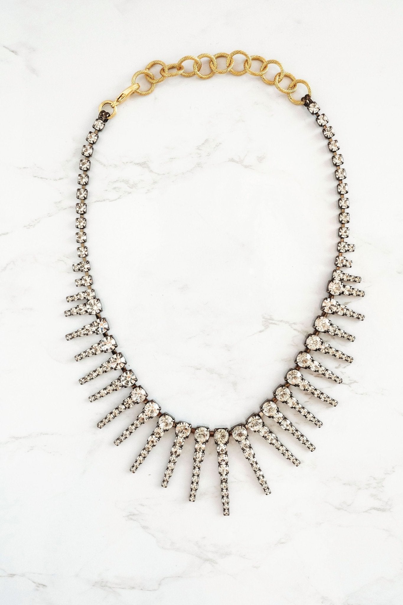 This Channing Necklace by Elizabeth Cole – Wear it layered or alone, the Channing Necklace features graduated crystal daggers finished in a gunmetal hue, adding a touch of edgy sophistication to any outfit. Perfect for making a statement.
