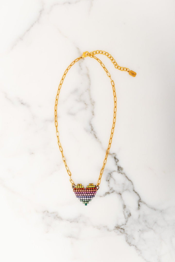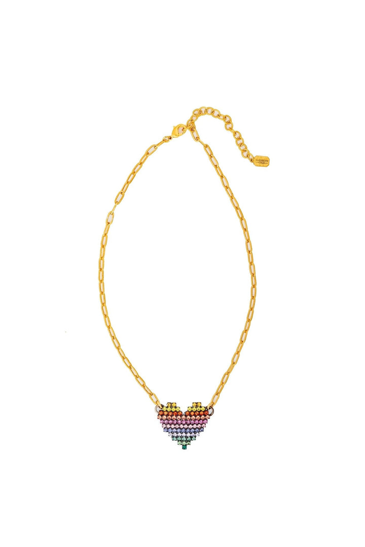 This Charley Necklace by Elizabeth Cole – Wear your heart on your sleeve with the Charley Necklace, featuring delicate golden links, sparkling Czech crystals, and a petite rainbow crystal heart. A must-have statement piece for any jewelry collection.