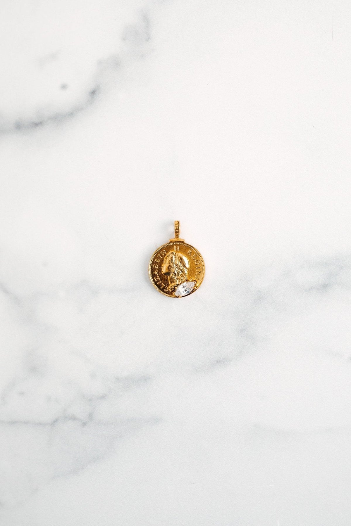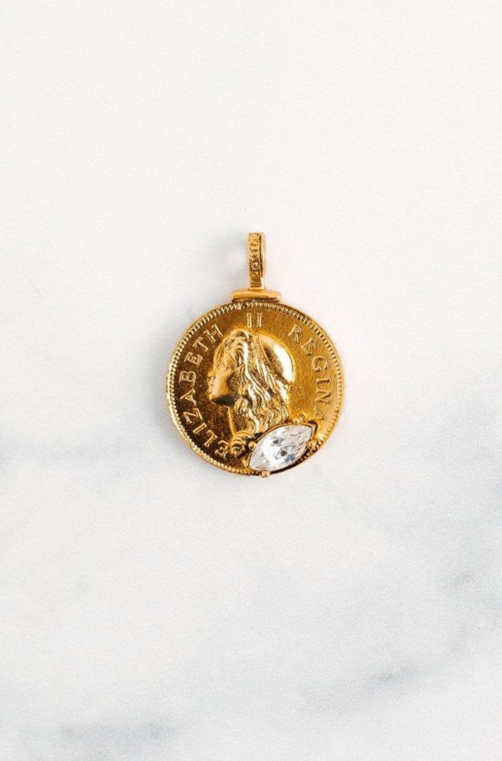 This Charon Charm by Elizabeth Cole – Add a statement to your favorite necklace or bracelet with this vintage coin charm. Featuring the Queen of England’s profile and a glittering marquis crystal, it’s perfect for a unique touch.