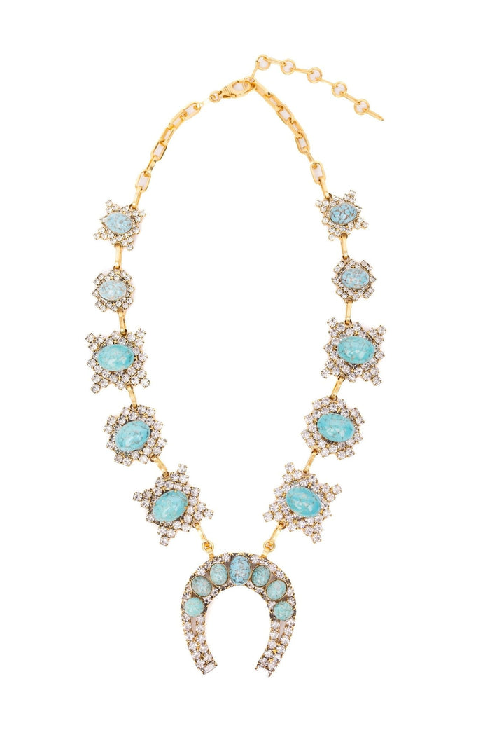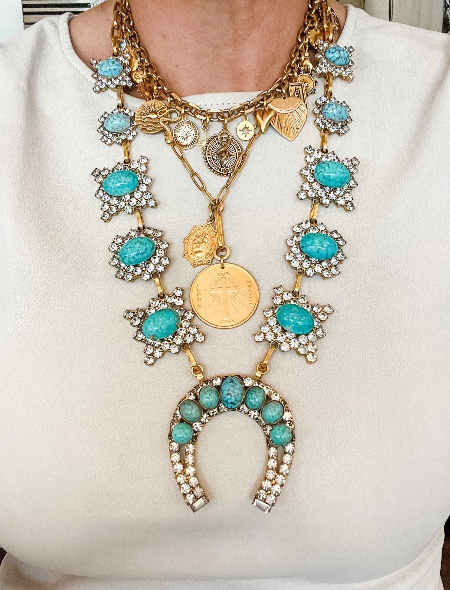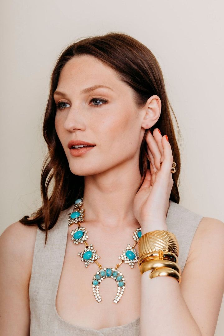 This Clarisse Necklace by Elizabeth Cole – Back by popular demand, the Clarisse Necklace features a traditional Squash Blossom design with a hand-blown turquoise matrix stone and clusters of brilliant crystals. Available for pre-order with options for antique gold or silver finishes.