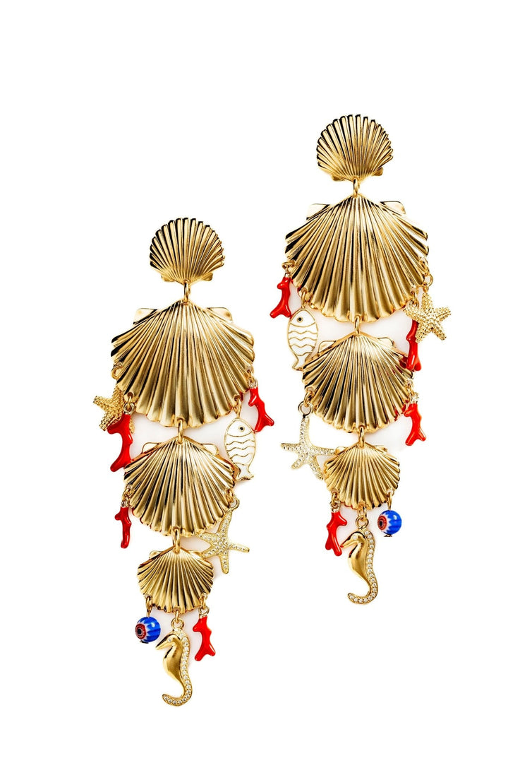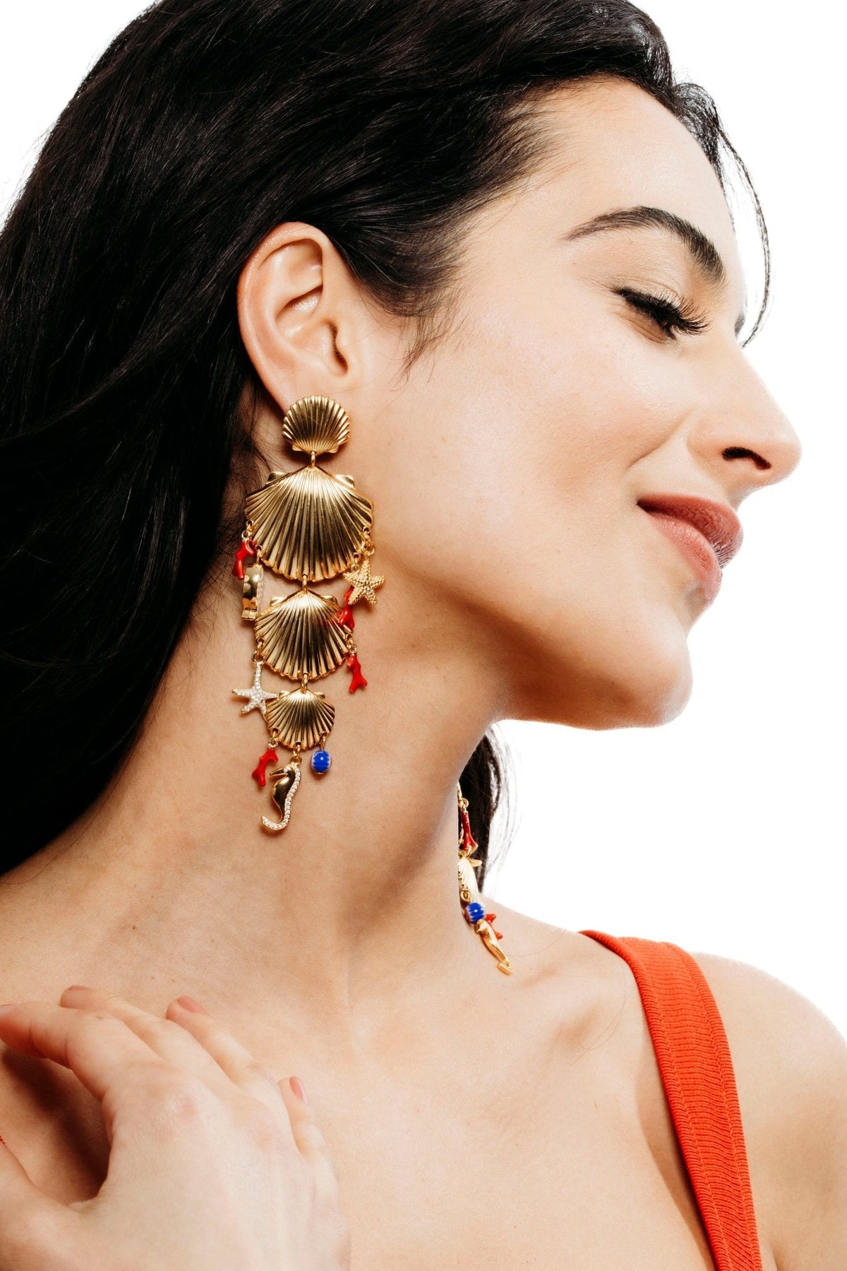 These Coralia Earrings by Elizabeth Cole – Bring ocean vibes to your look with these dramatic drop shell earrings adorned with playful coral, seahorse, and fish charms, all finished with stunning glass blue beads.