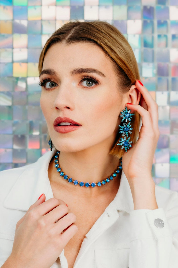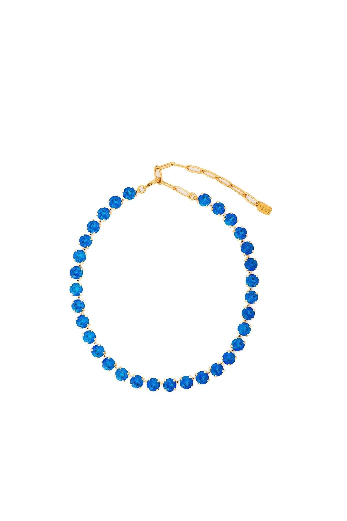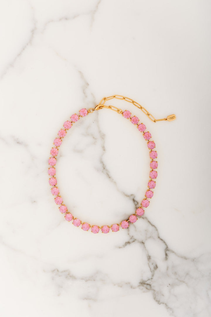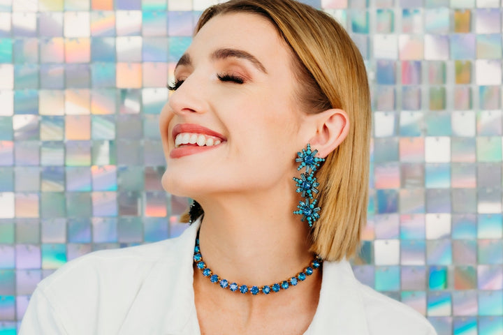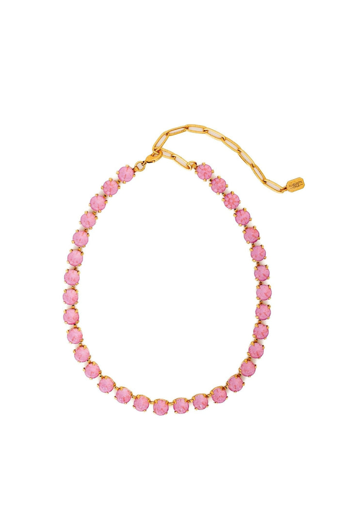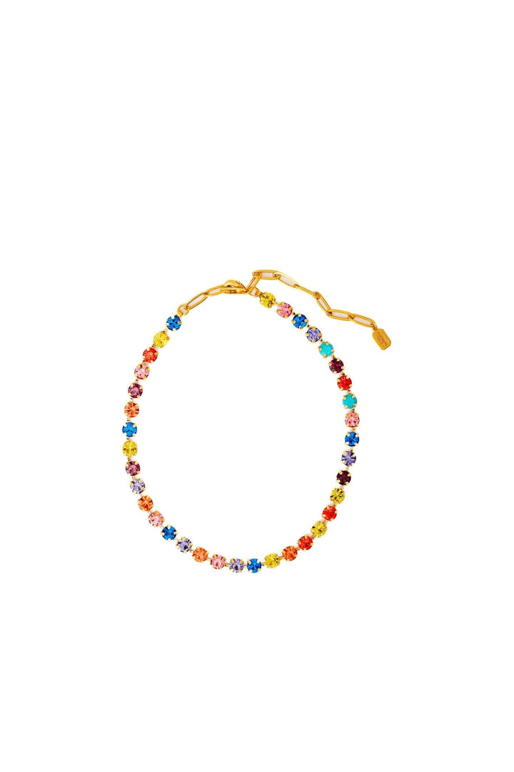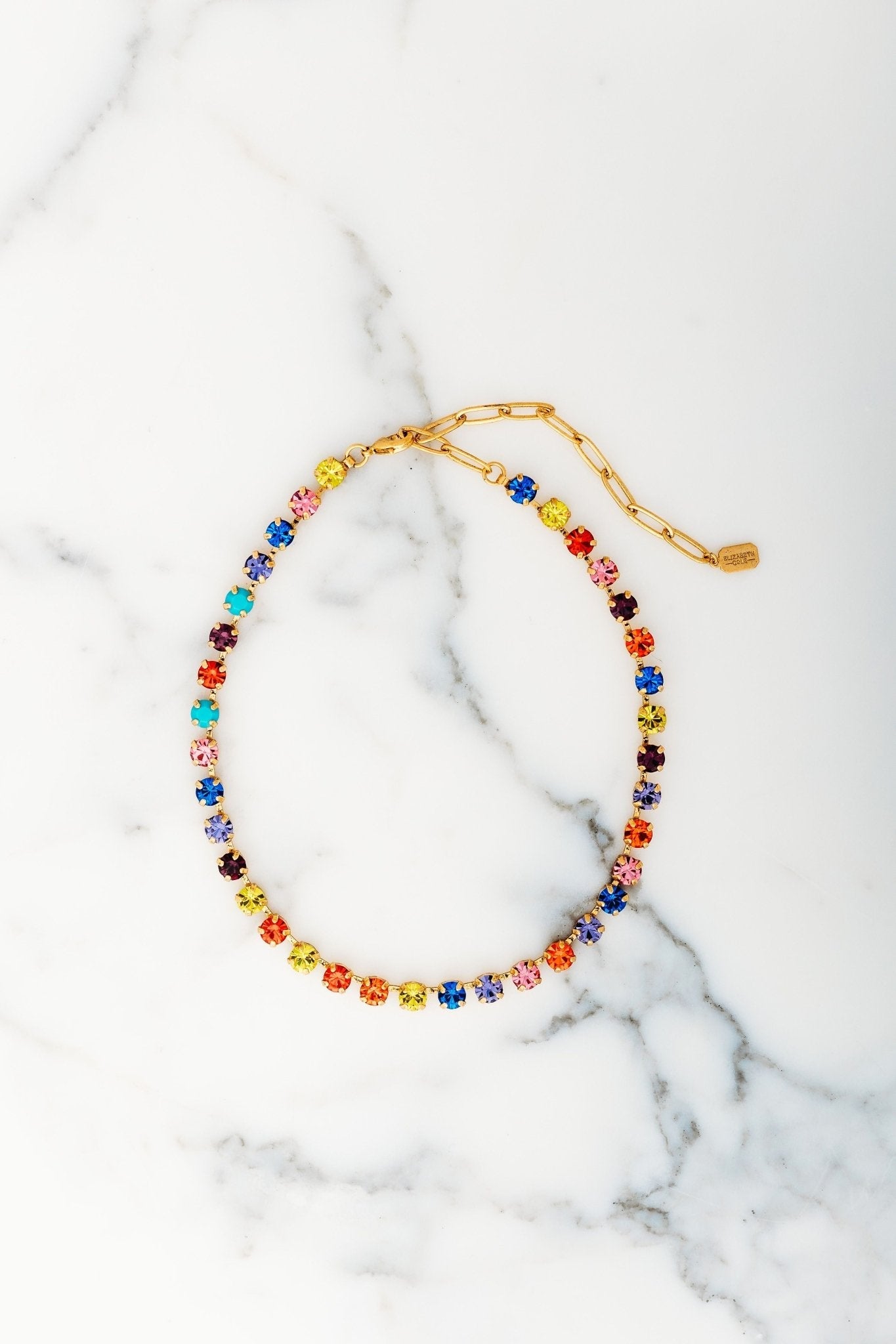 This Coraline Necklace by Elizabeth Cole – Enhance your style with this stunning necklace, featuring round crystals in shades of blue, pink, and rainbow. Add a touch of color and shine to any outfit with this beautiful piece.