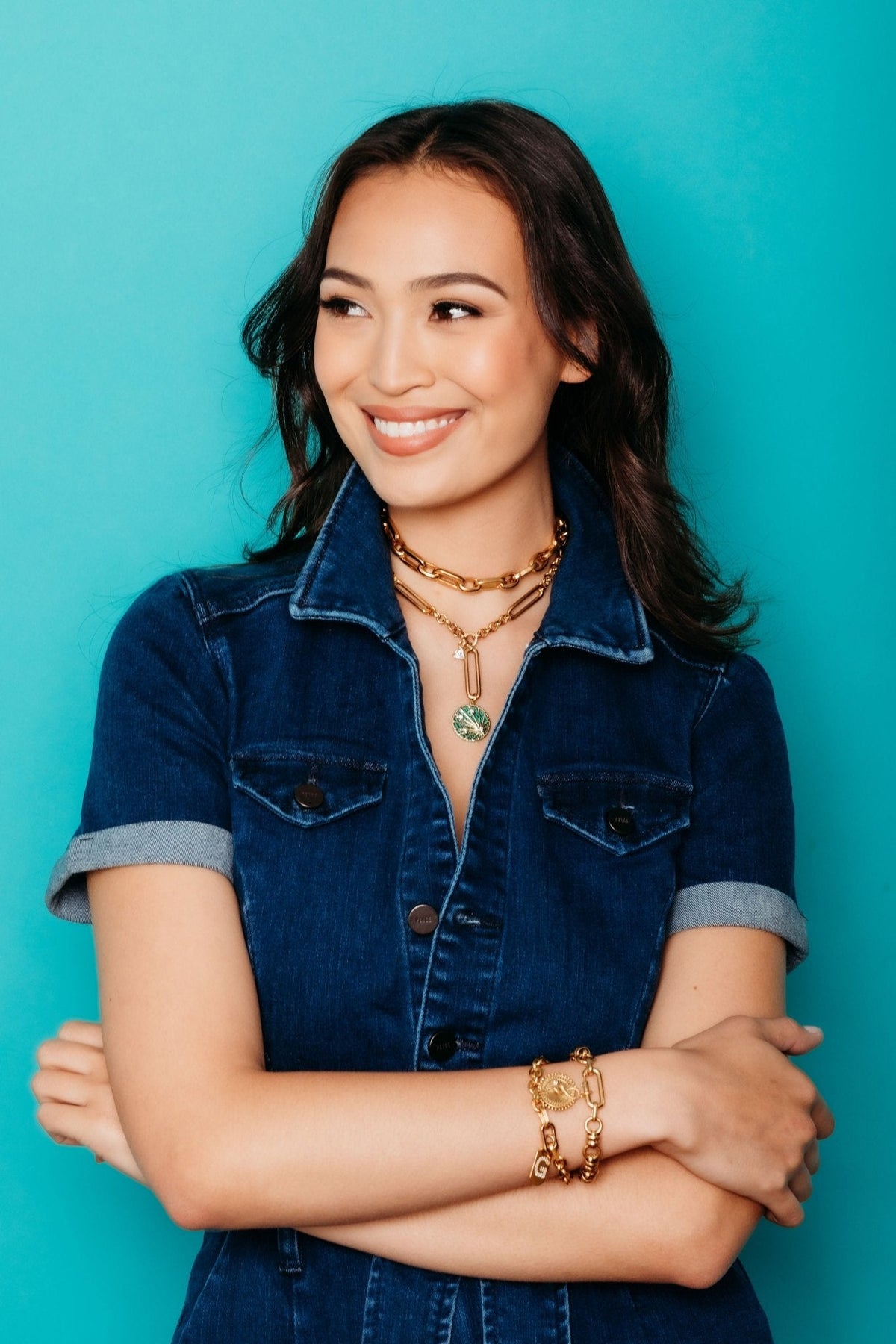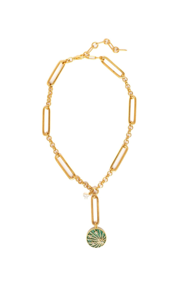 This Cosmos Necklace by Elizabeth Cole – Take a plunge into the cosmos with this 24kt gold plated necklace featuring a classic alternation of round and oval links, highlighted by mesmerizing malachite and crystal details.