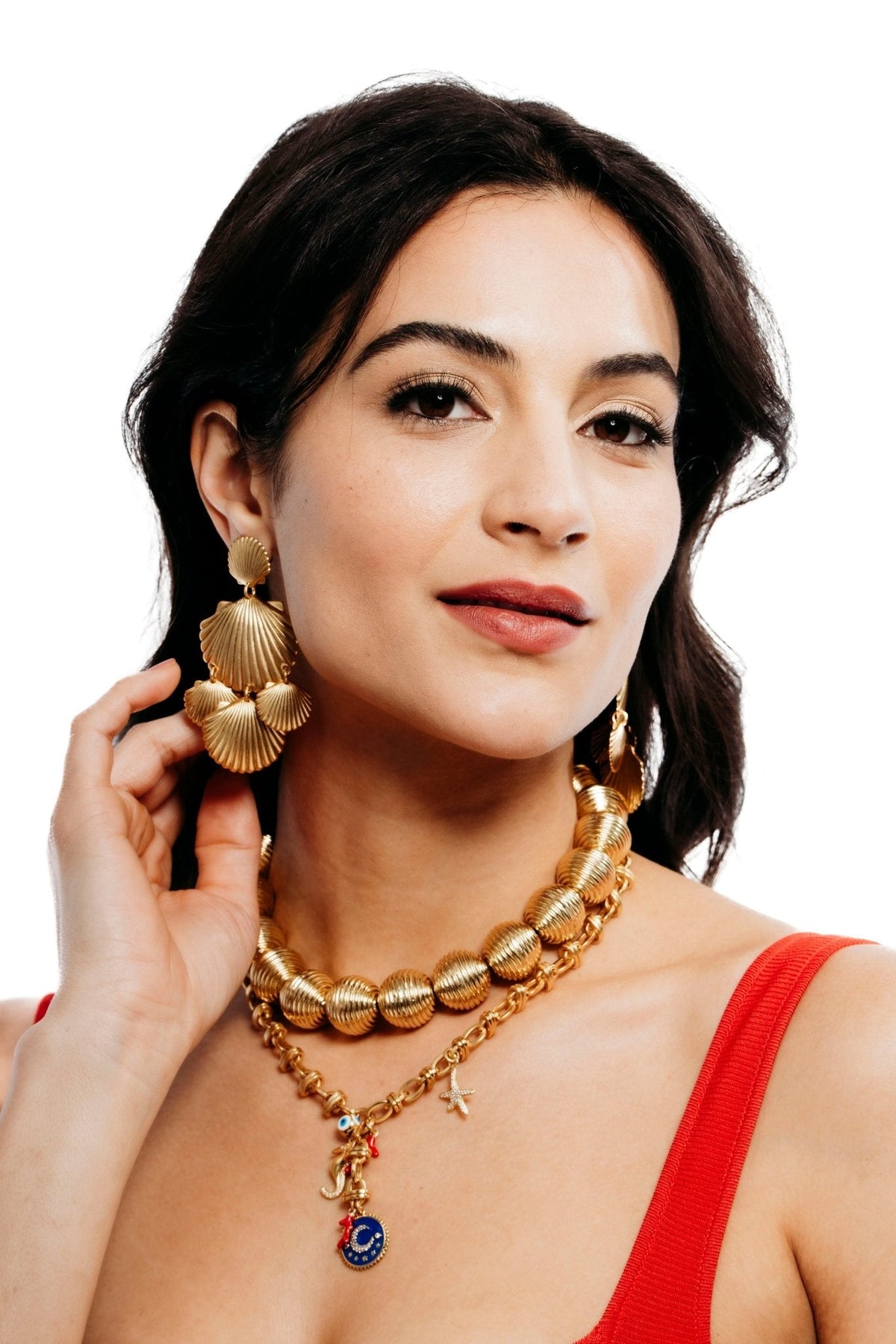 This Crescent Necklace by Elizabeth Cole – Add a touch of whimsy to your beachy look with this charming necklace featuring a coral, regal seahorse, and sparkling starfish. Perfect for channeling mermaid vibes.