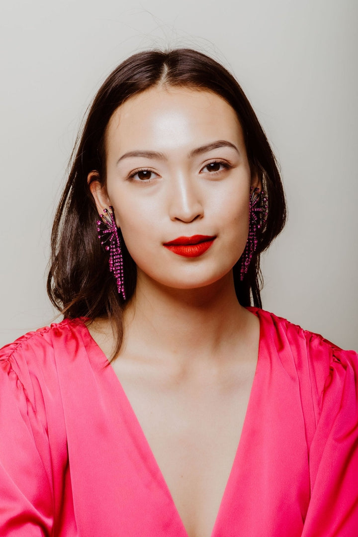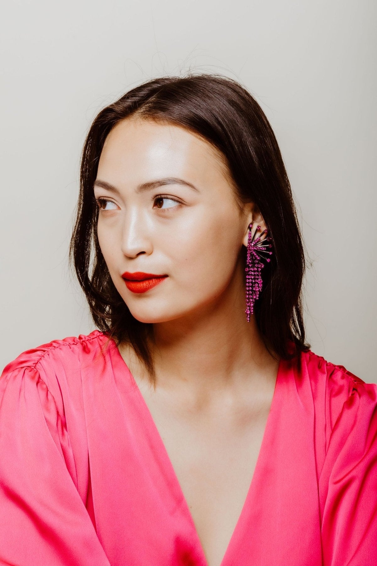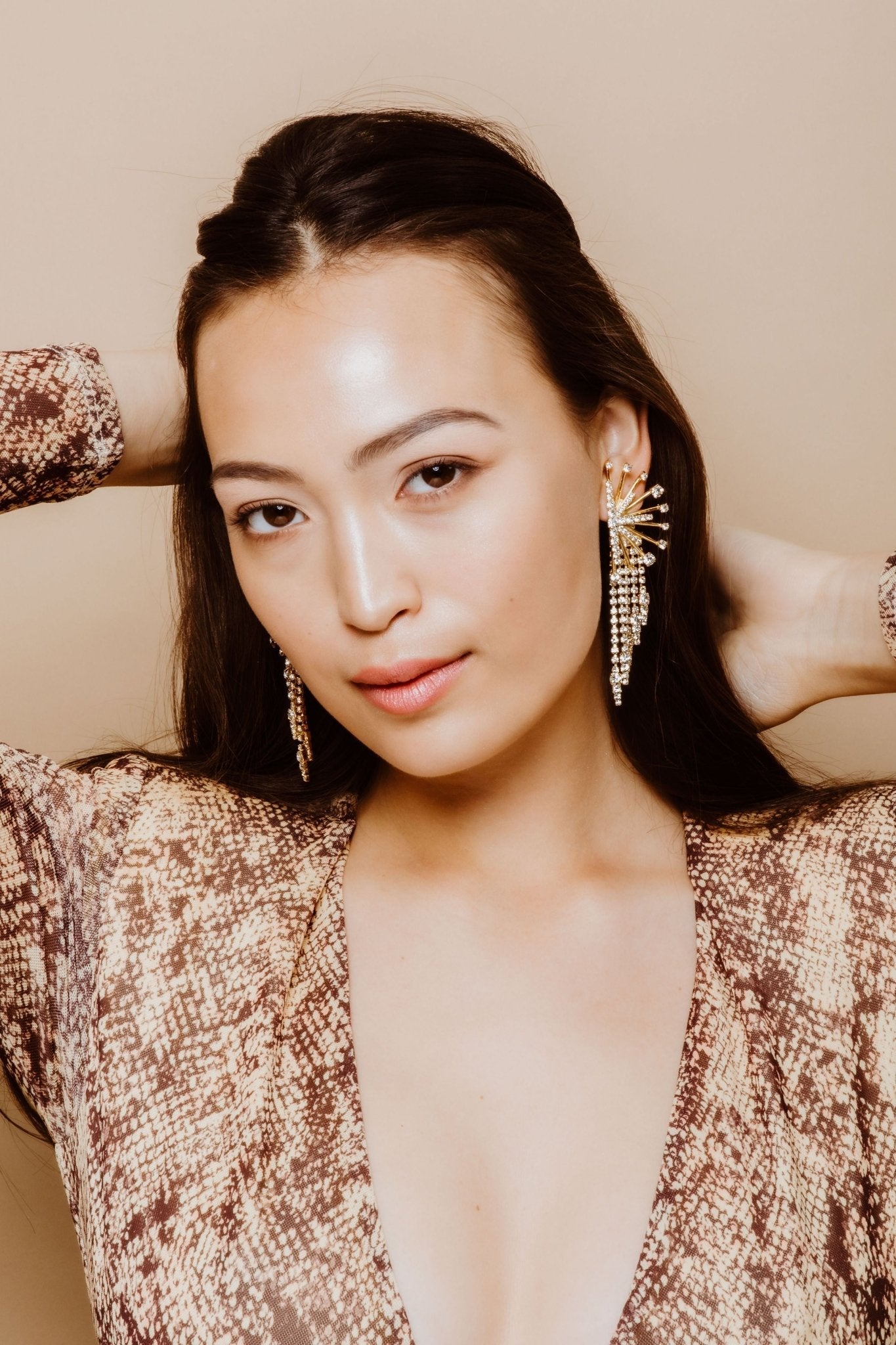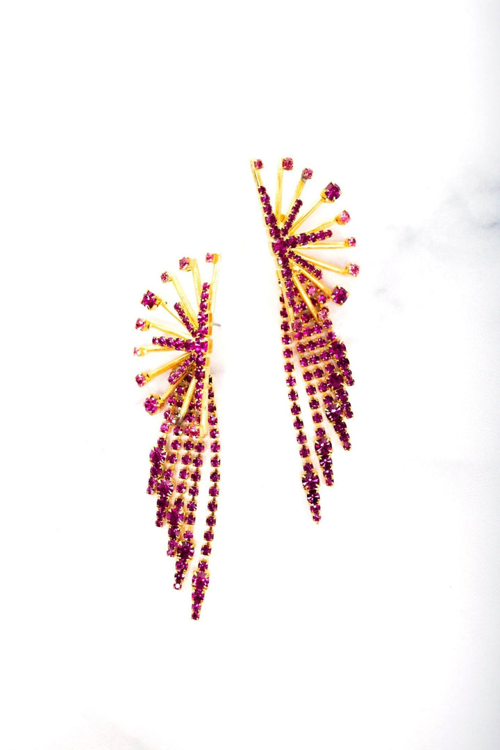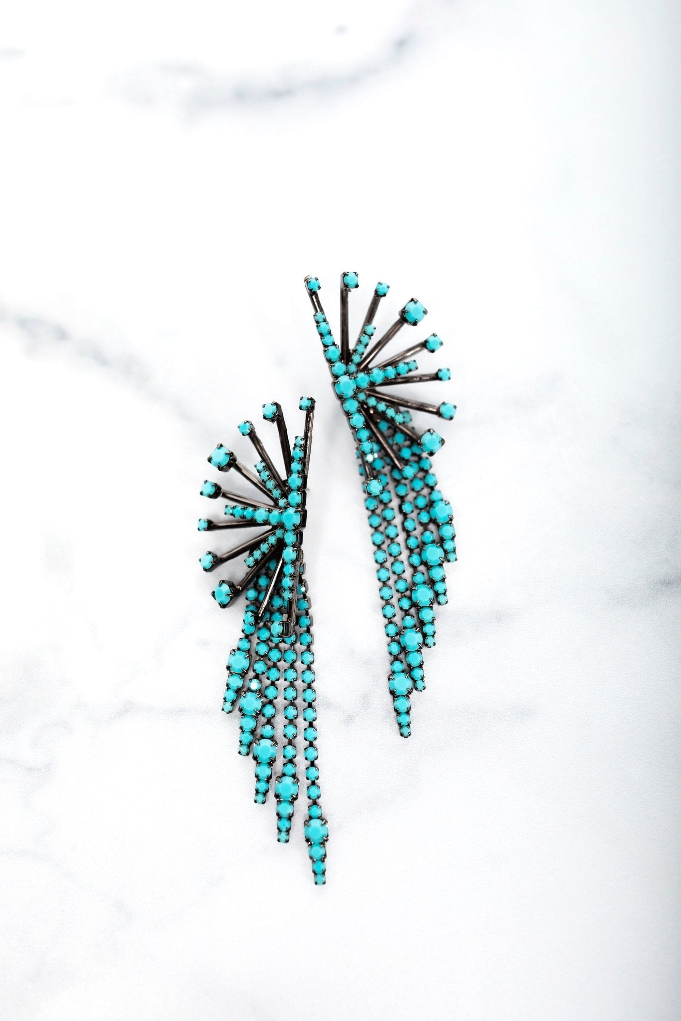 These Cressida Earrings by Elizabeth Cole – Make a statement with the Cressida Earrings, featuring a spray of glittering crystals and a dazzling crystal fringe. Available in various colors, these earrings elevate any look to the next level.