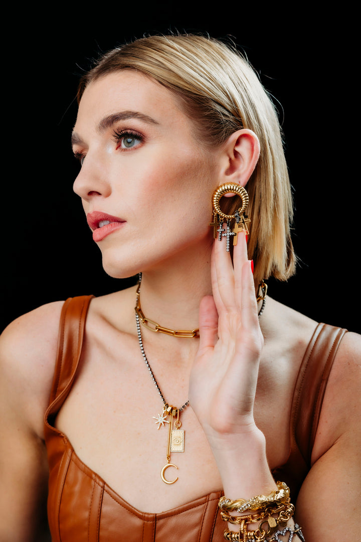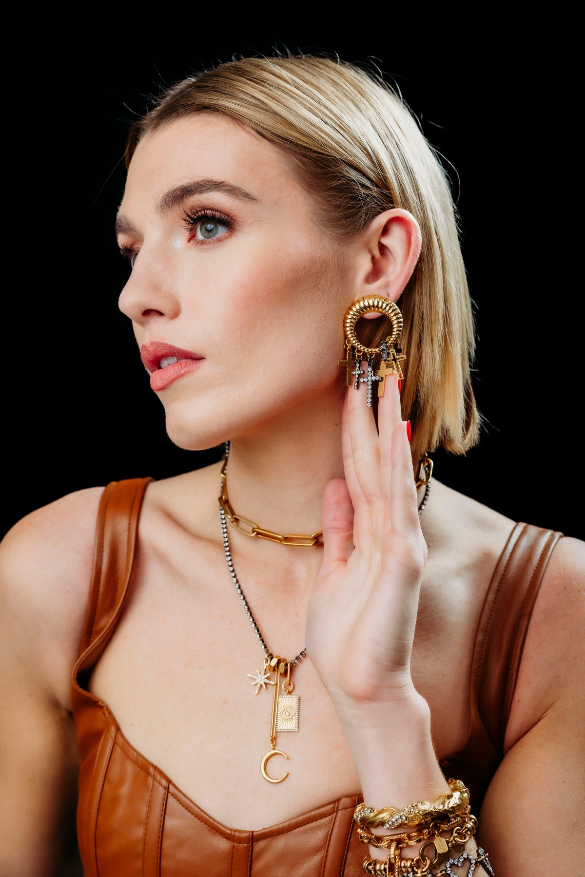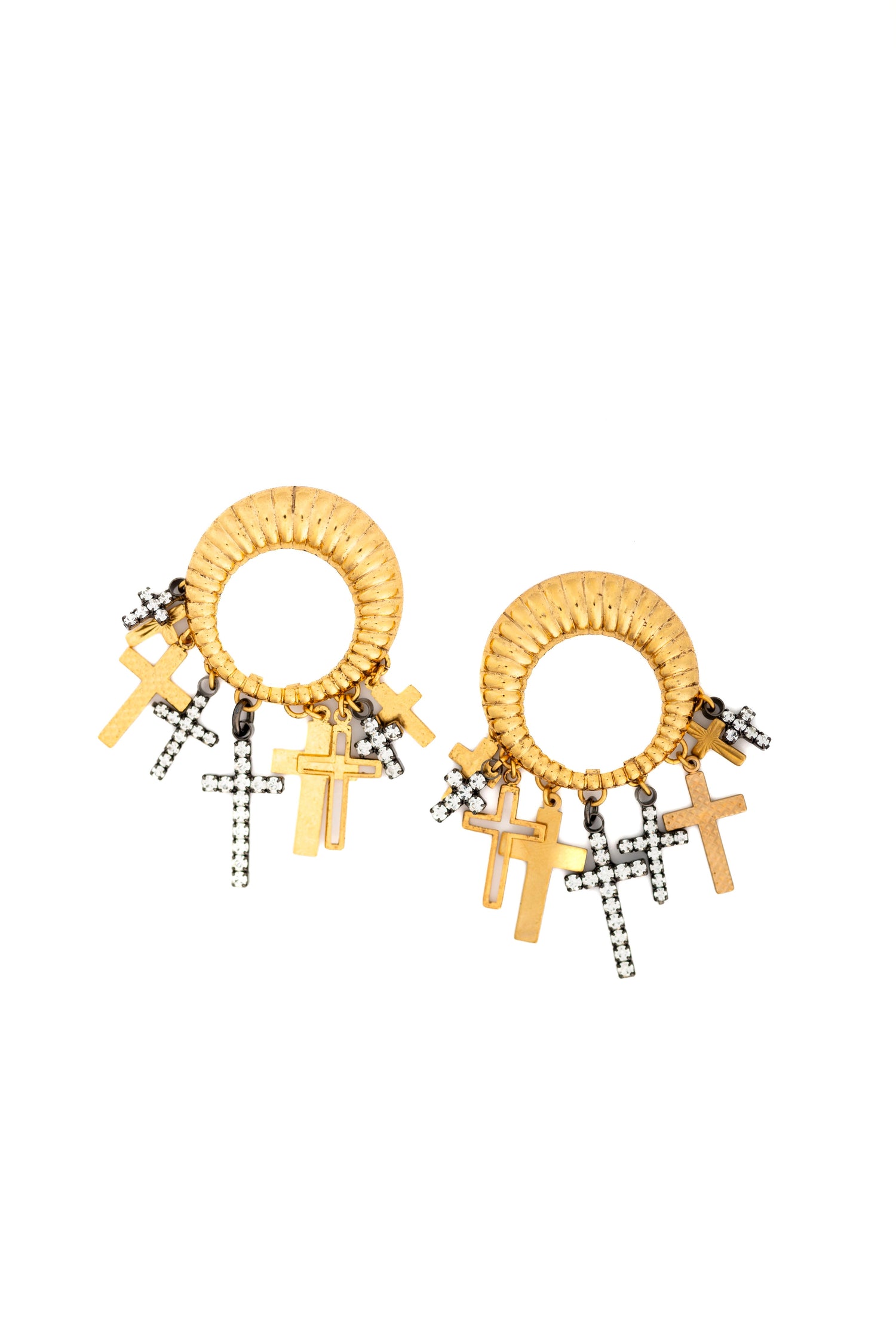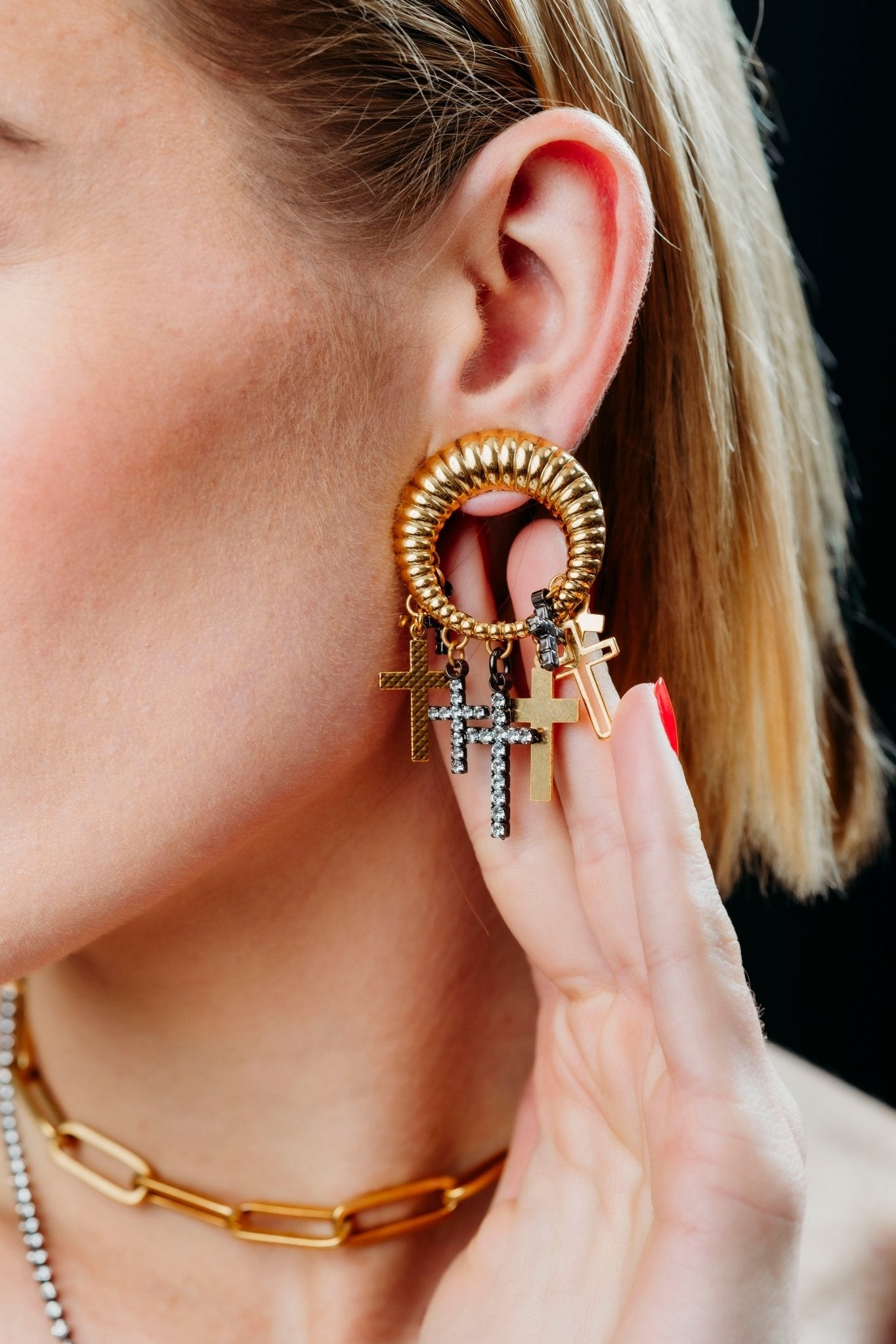 These Cristanta Earrings by Elizabeth Cole – Show off your unique style with these textured front-facing hoop earrings adorned with a fringe of crystal and golden crosses. These earrings are perfect for making a statement at any occasion.