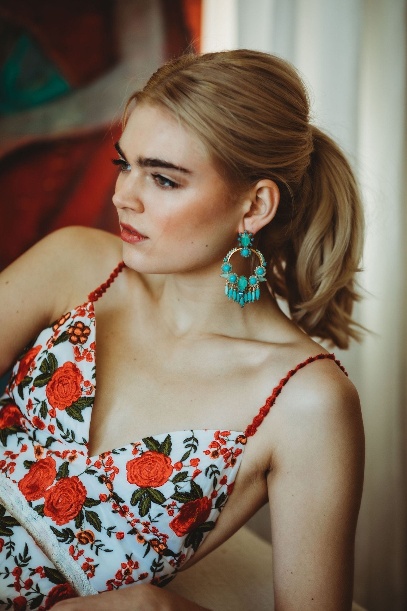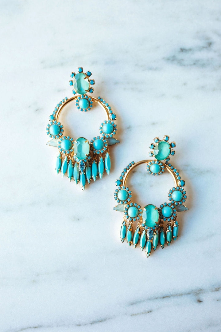 These Fiona Earrings by Elizabeth Cole – Make a colorful statement with these front-facing hoops, encrusted with turquoise, jade, and mint stones, perfect for bold looks.