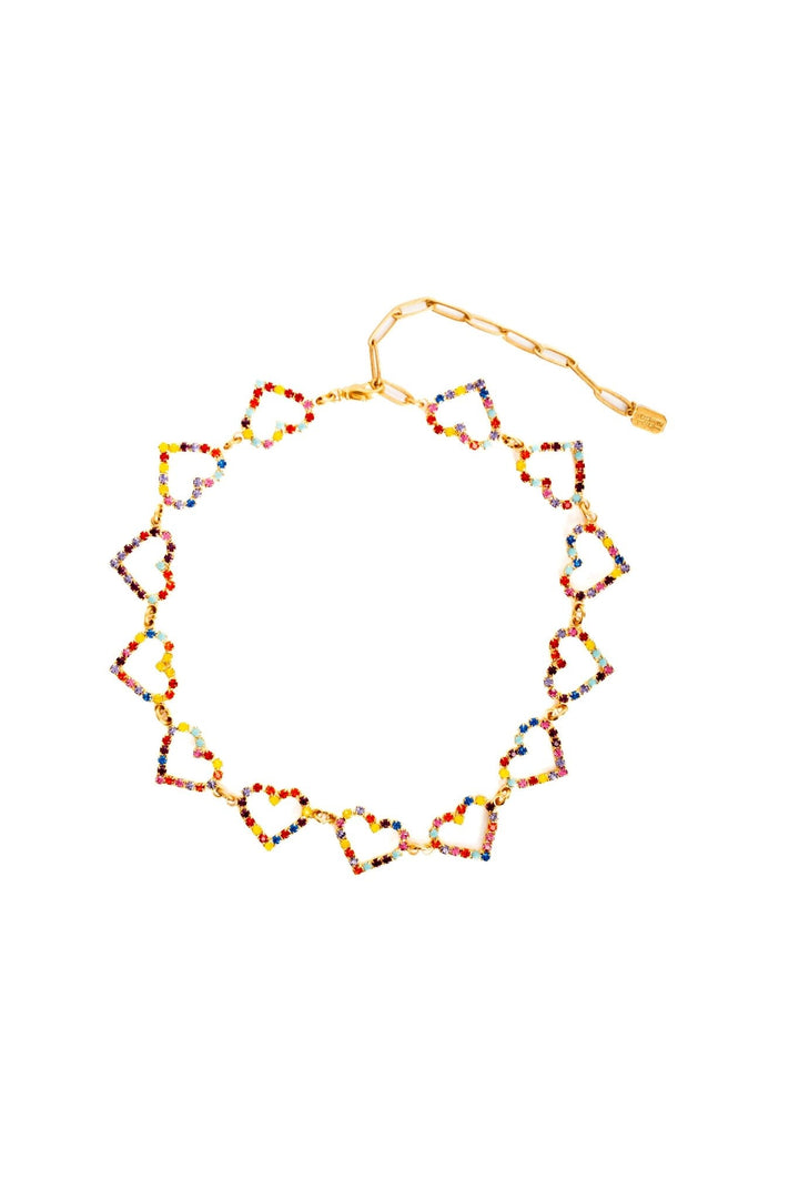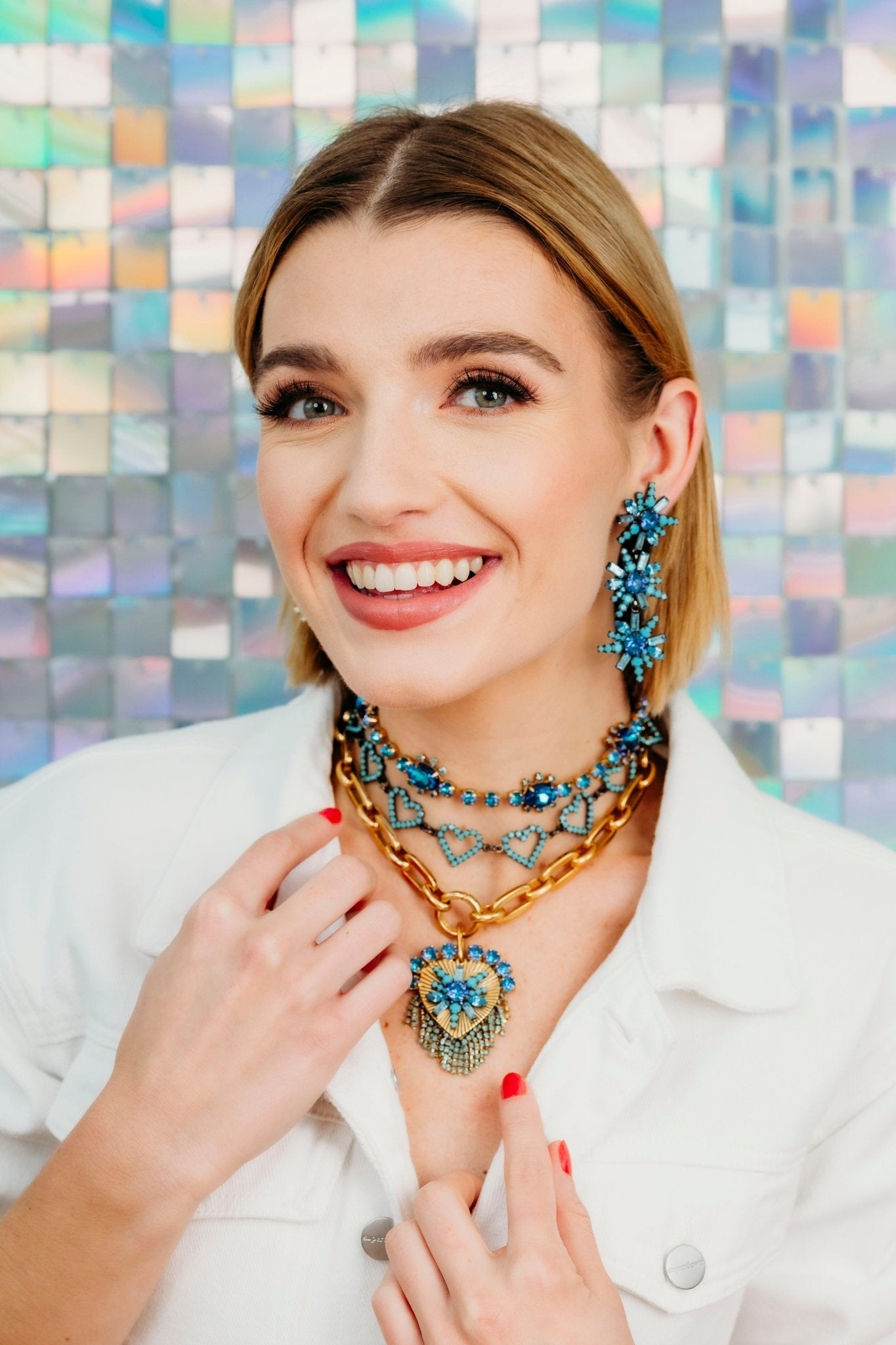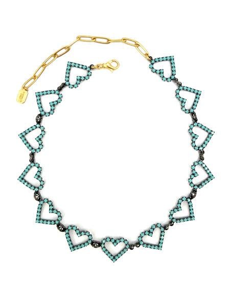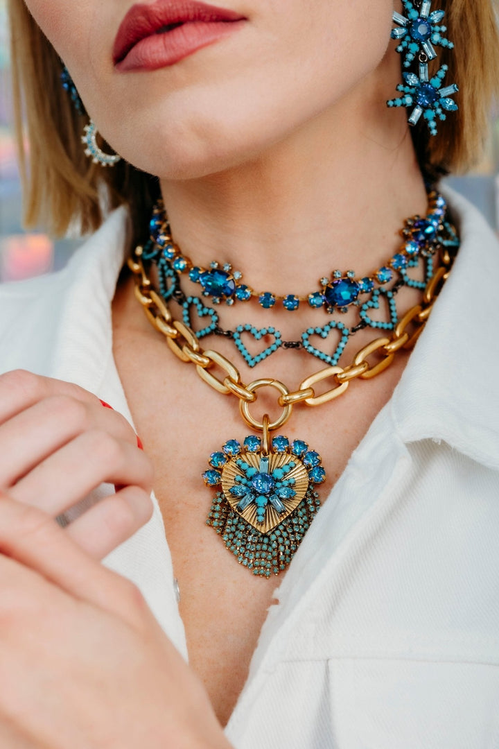 This Hestia Necklace by Elizabeth Cole is a symbol of everlasting love and beauty. Featuring an open heart design available in crystal, faux turquoise, or multi crystals, this piece captures both elegance and sentiment, making it perfect for elevating any outfit with a meaningful touch.