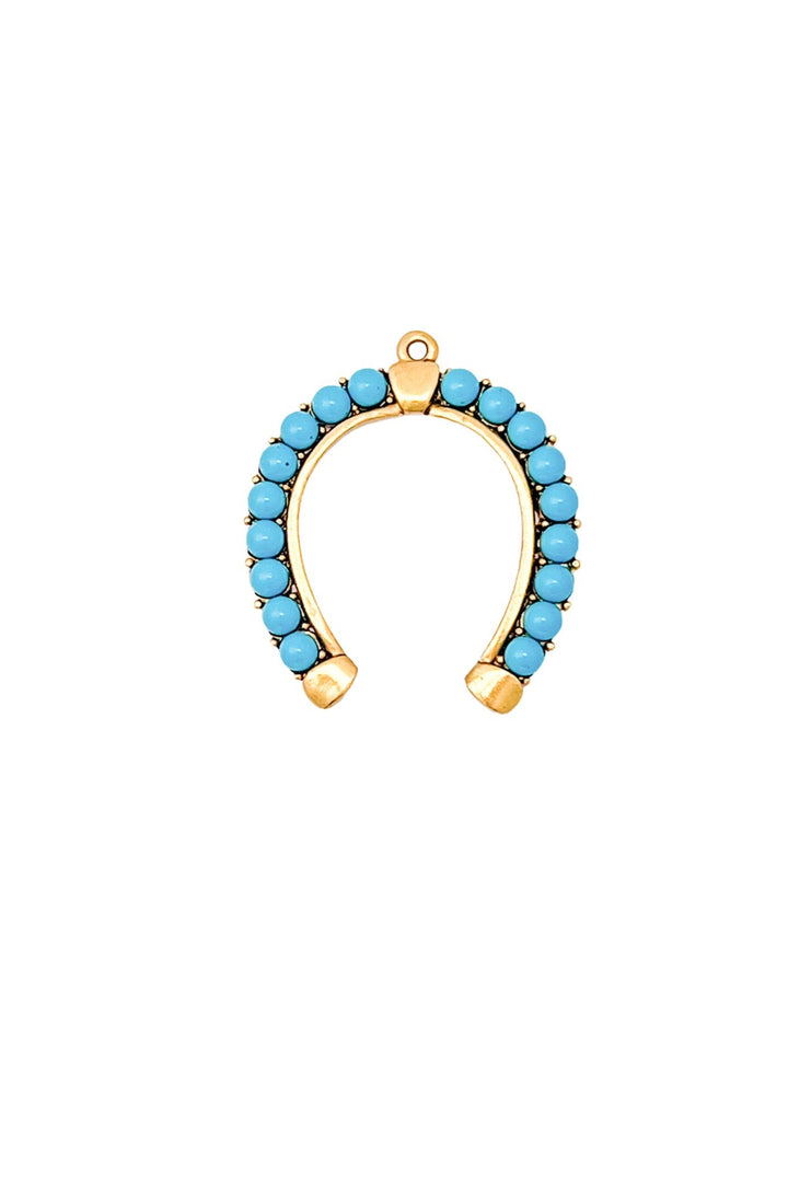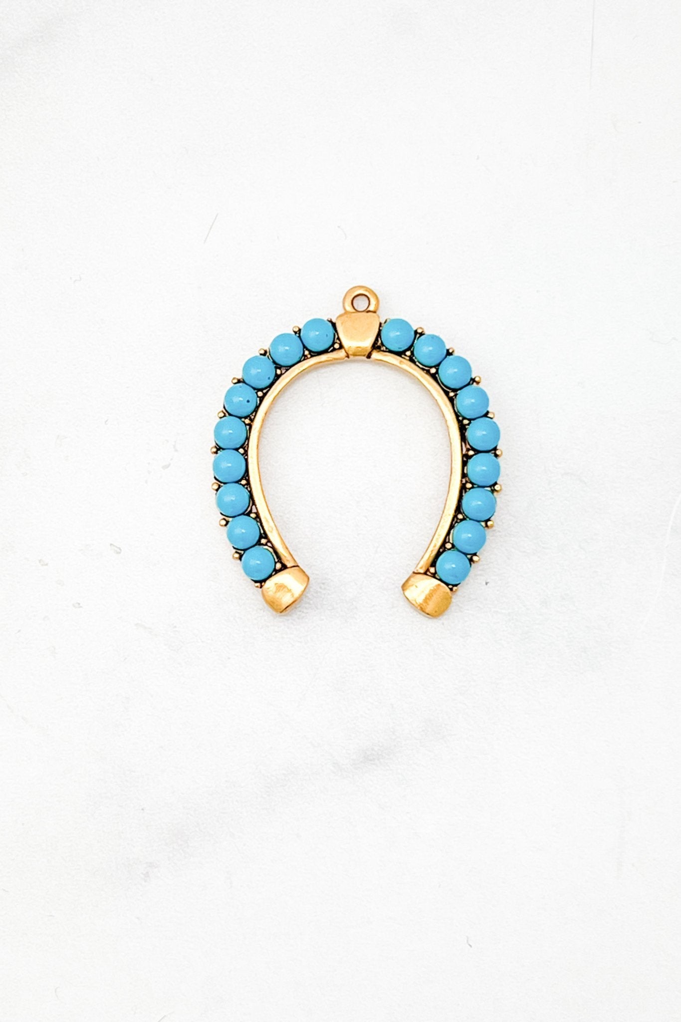 This Horseshoe Charm by Elizabeth Cole is a charming symbol of good luck, adorned with turquoise stones and set in 24kt gold. A versatile and stylish addition to any jewelry collection, this charm can be easily added to your favorite chains for a personalized touch of luck.