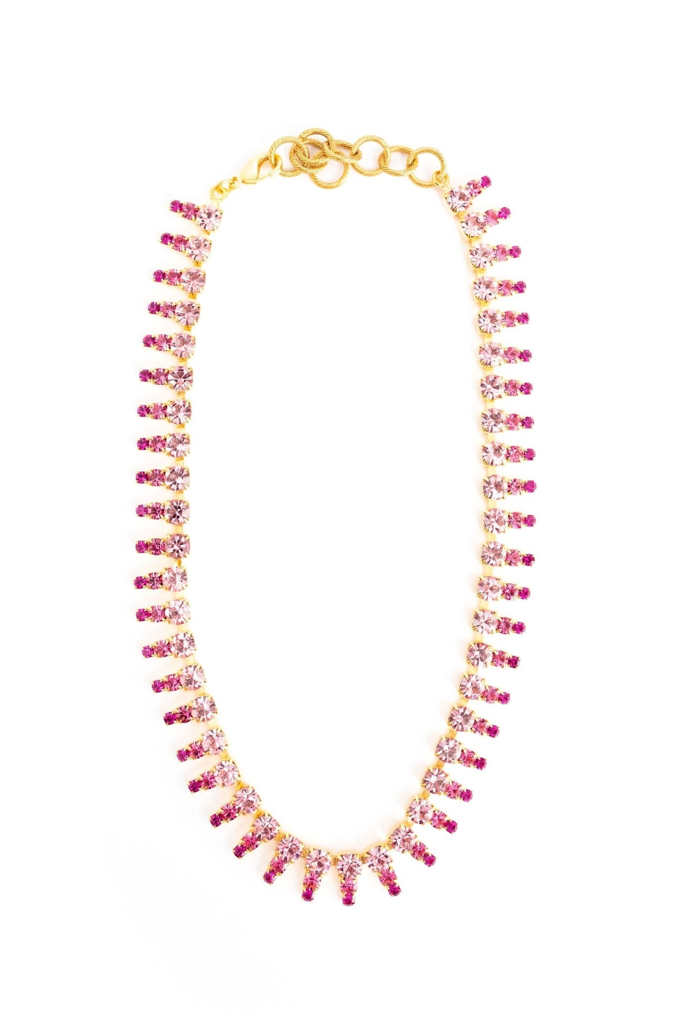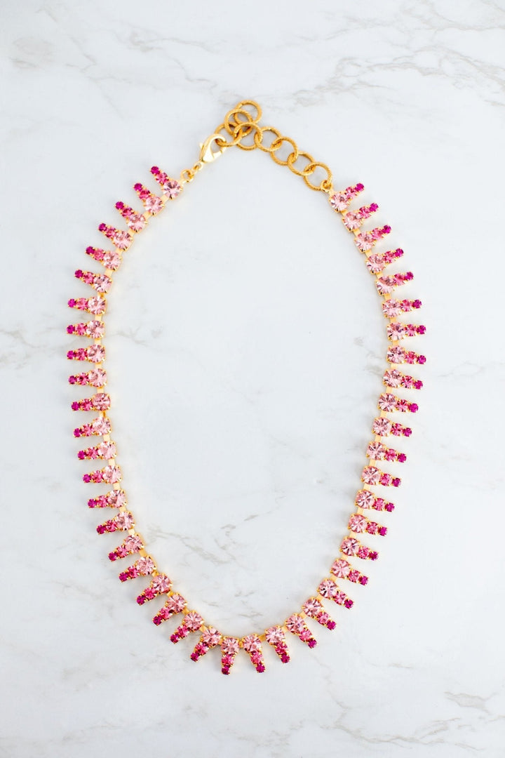 This Izara Necklace by Elizabeth Cole features graduated pink stones, offering a versatile accessory that can be worn alone or layered with your favorite pieces. Its soft hues and elegant design make it a perfect addition to any jewelry collection.
