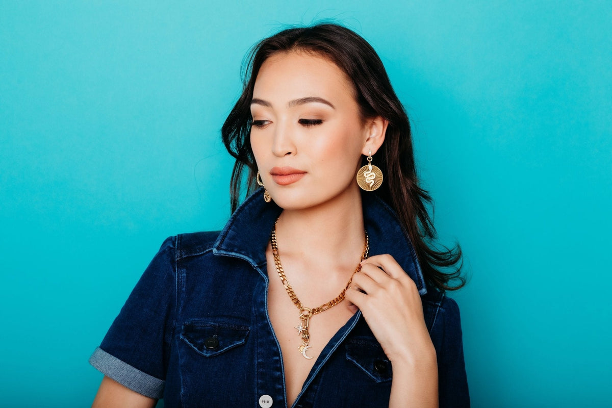 This Jayella Necklace by Elizabeth Cole invites the bold explorer in you with its golden links and crystal-encrusted star, moon, and compass charms. This adventurous necklace is perfect for those with a daring sense of style.