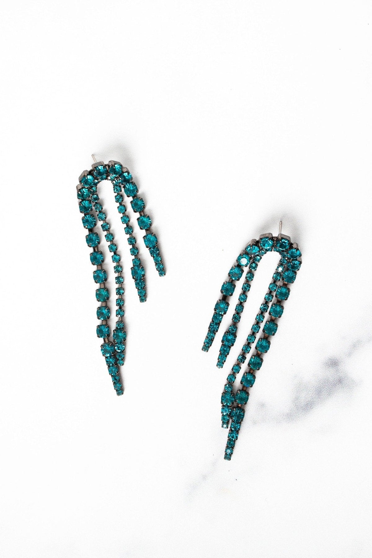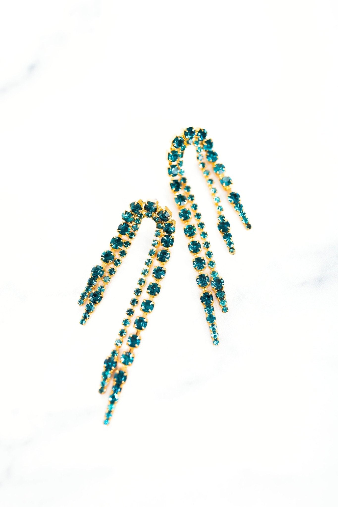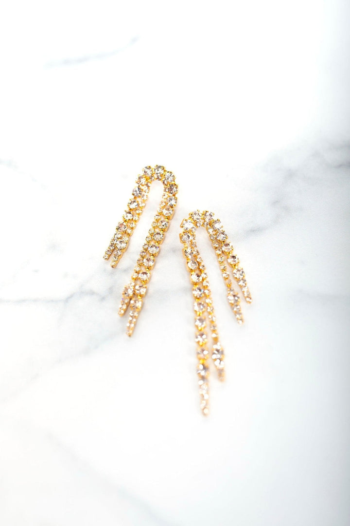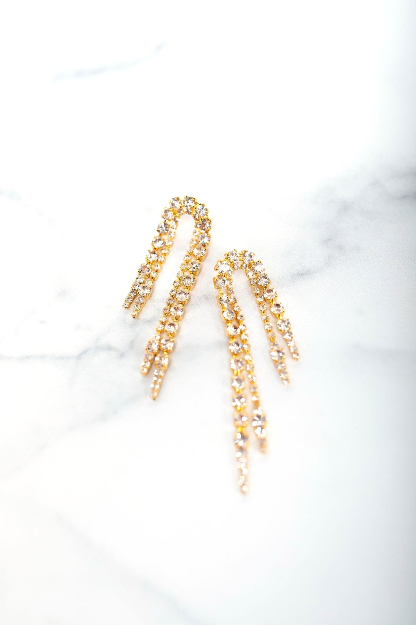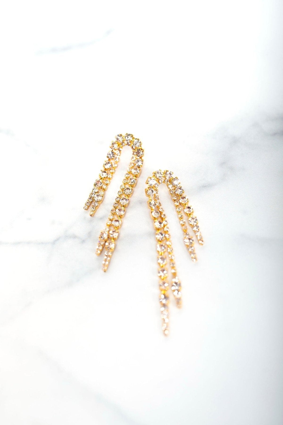 Czech crystals set in 24kt gold or hematite plate. Length: 3in (7.6cm), Weight: 7.3g. Post closure. Proudly made in the USA.
