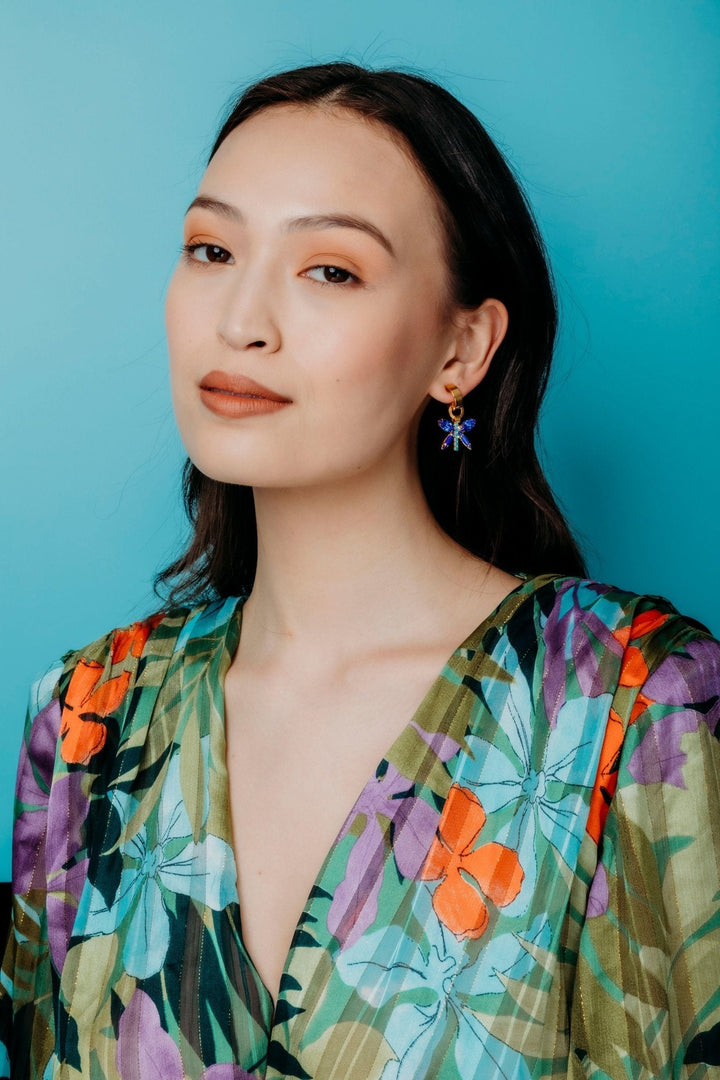 These Karina Earrings by Elizabeth Cole feature butterflies in bright blue fluttering from golden hoops, adding a touch of elegance and hope to your everyday look. Perfect for making a statement while keeping a playful vibe.