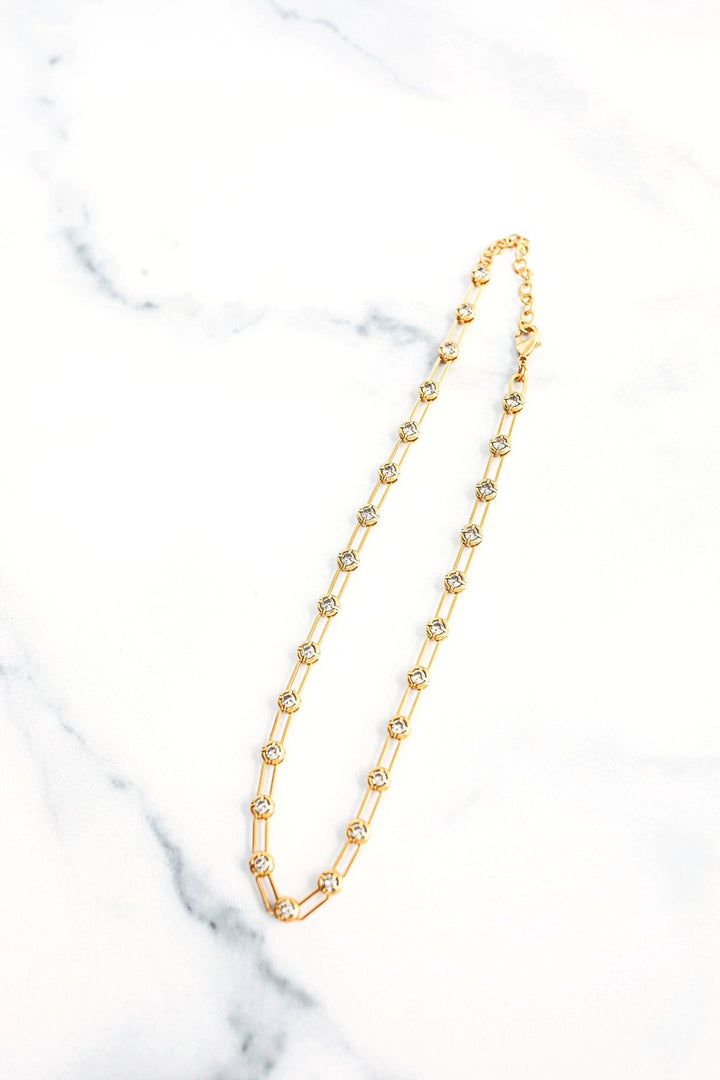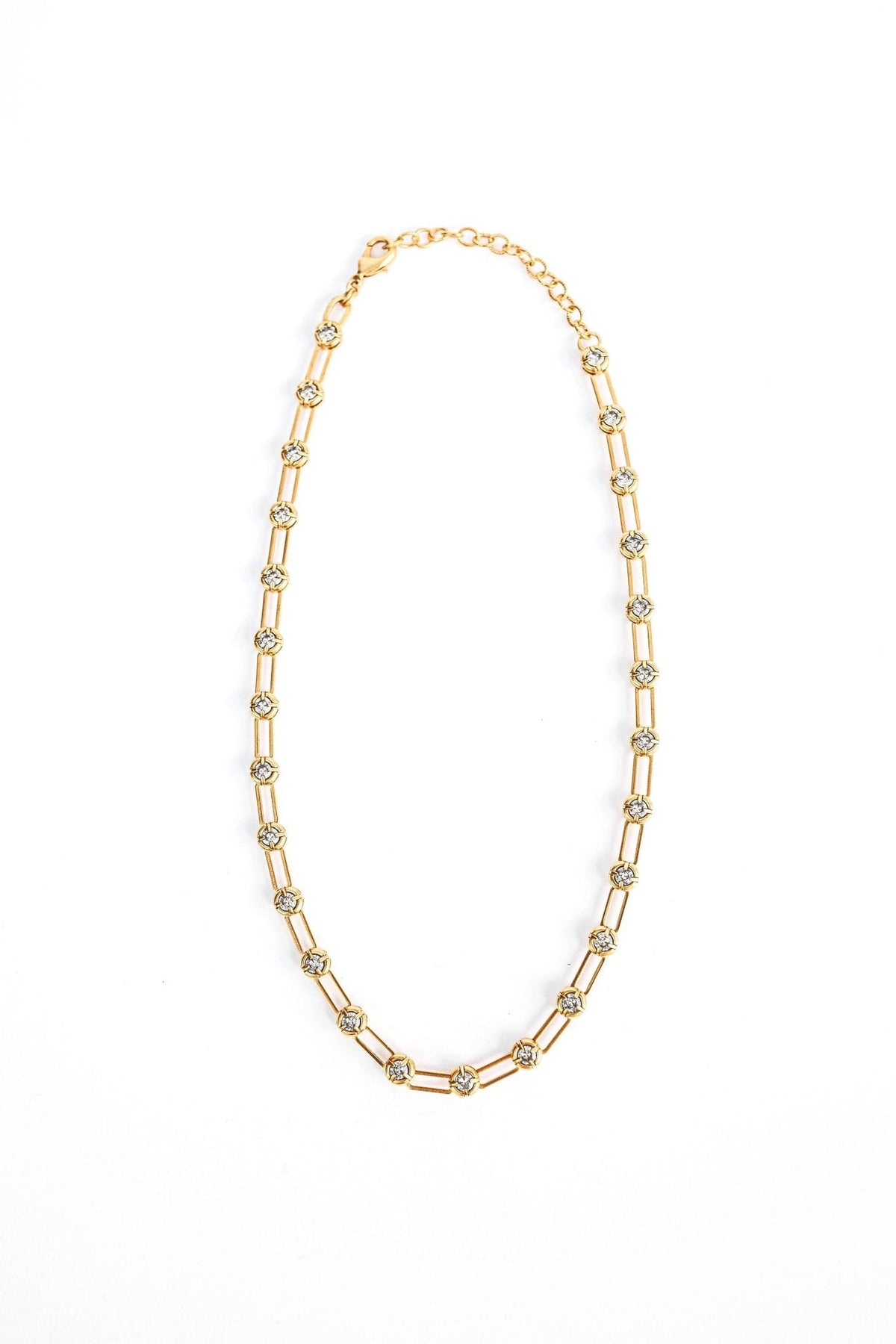 This Leta Necklace by Elizabeth Cole offers a classic silhouette with delicate golden links topped with brilliant crystals, making it a timeless and versatile piece for any occasion.