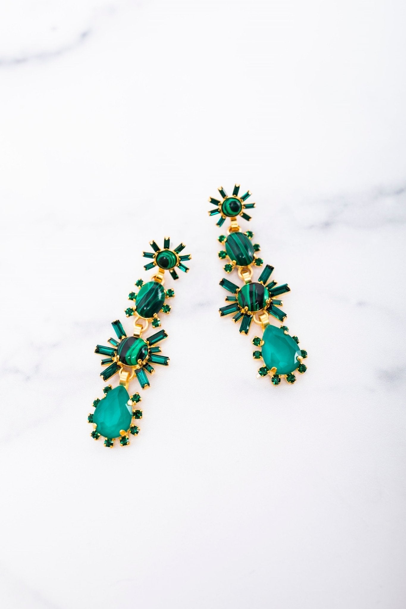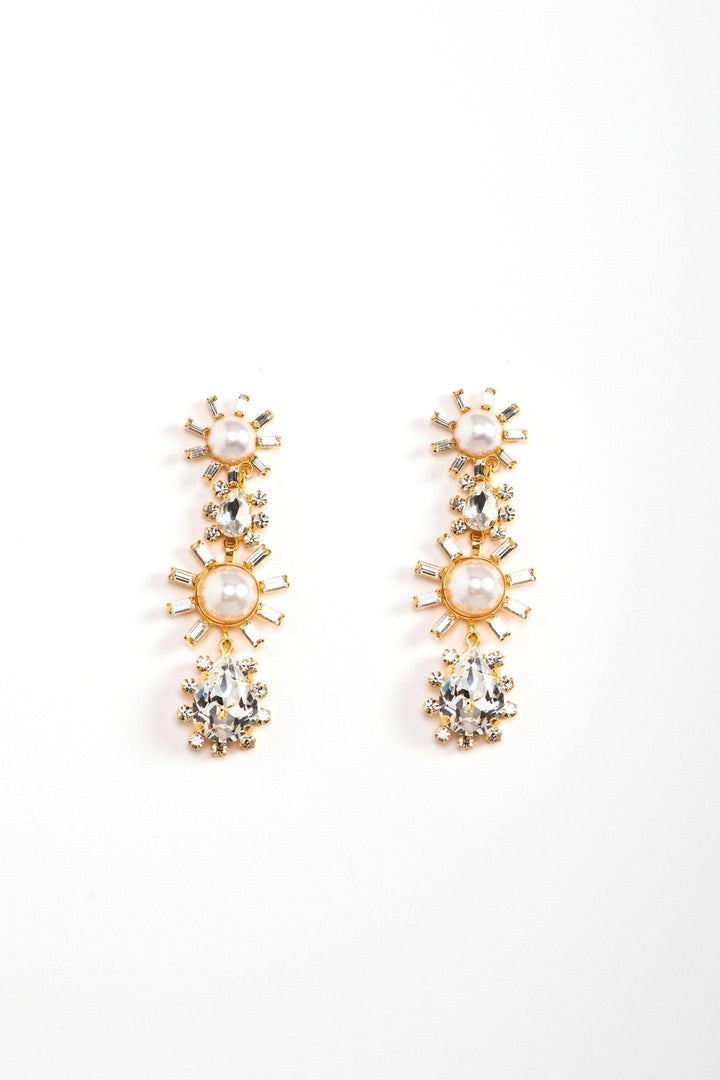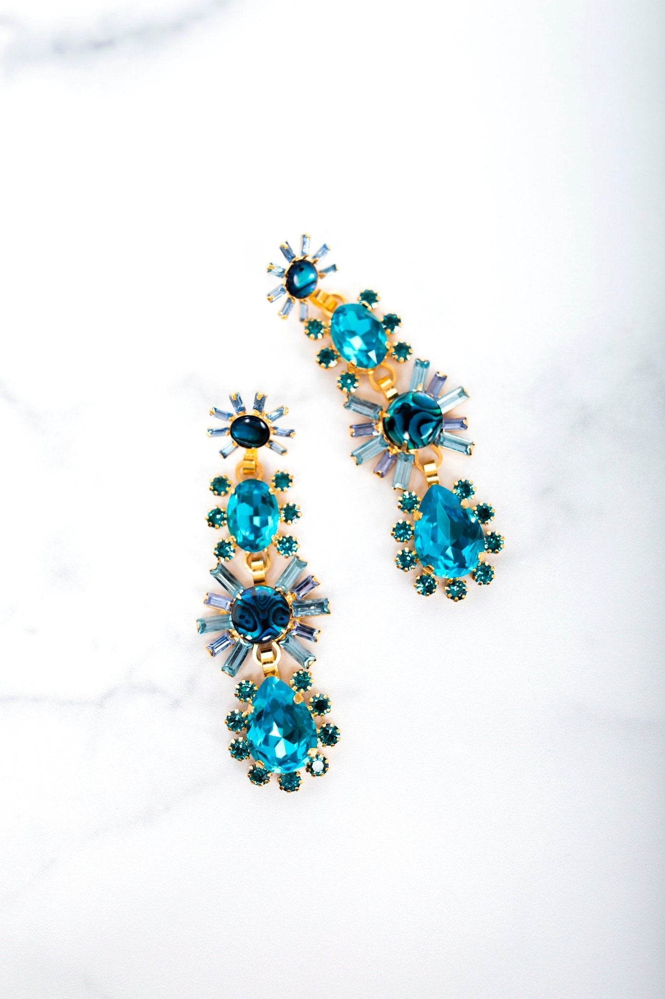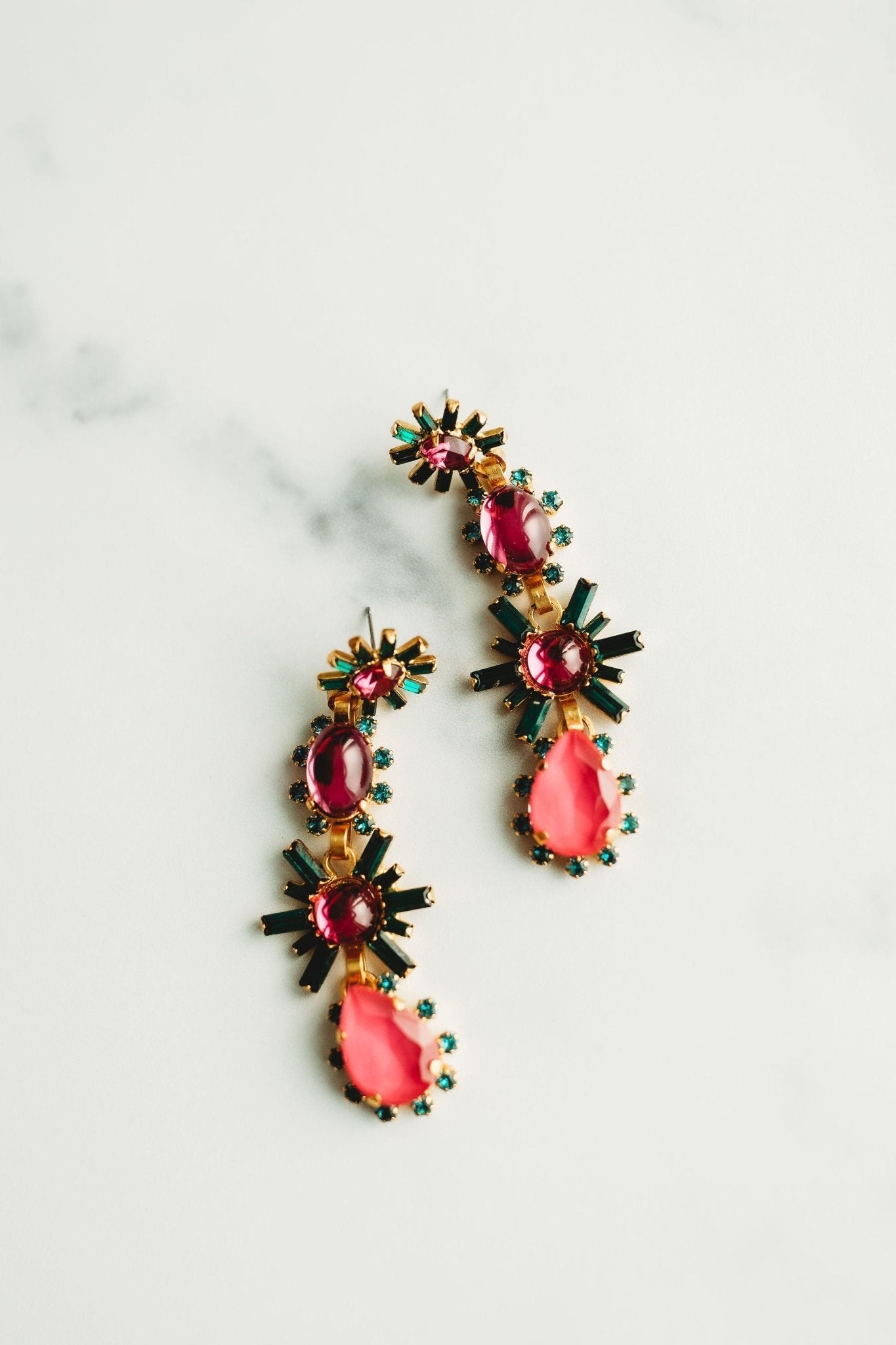 Swarovski crystals, glass stones, 24kt gold plate. Length: 3.75in (9.5cm), Weight: 12.1g. Post closure. Proudly made in the USA.