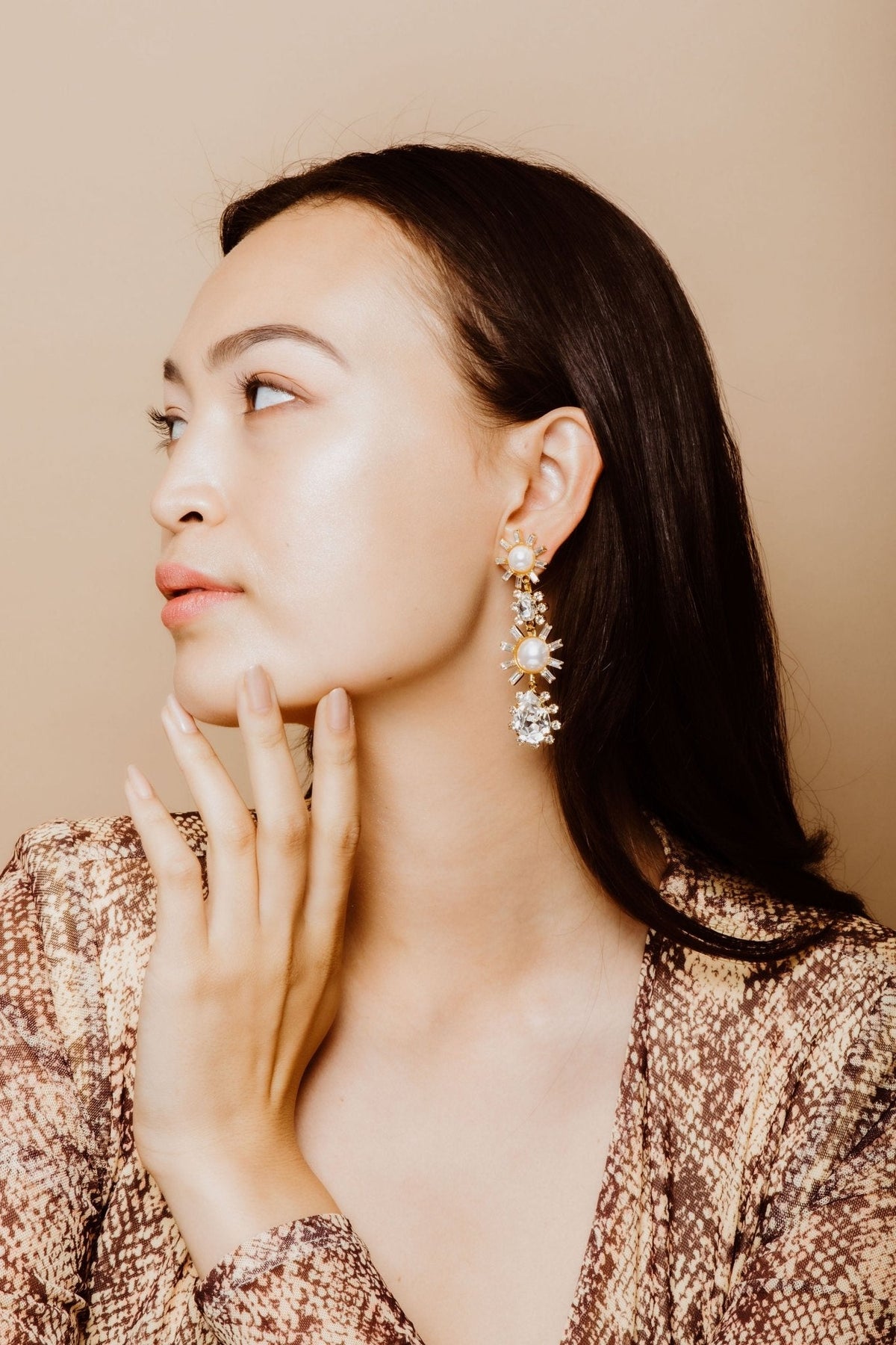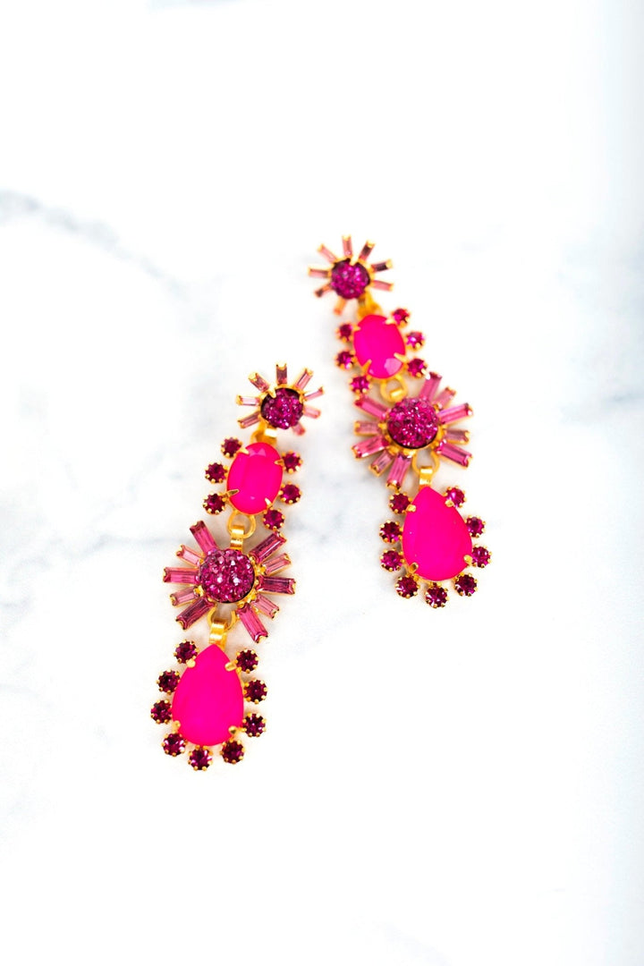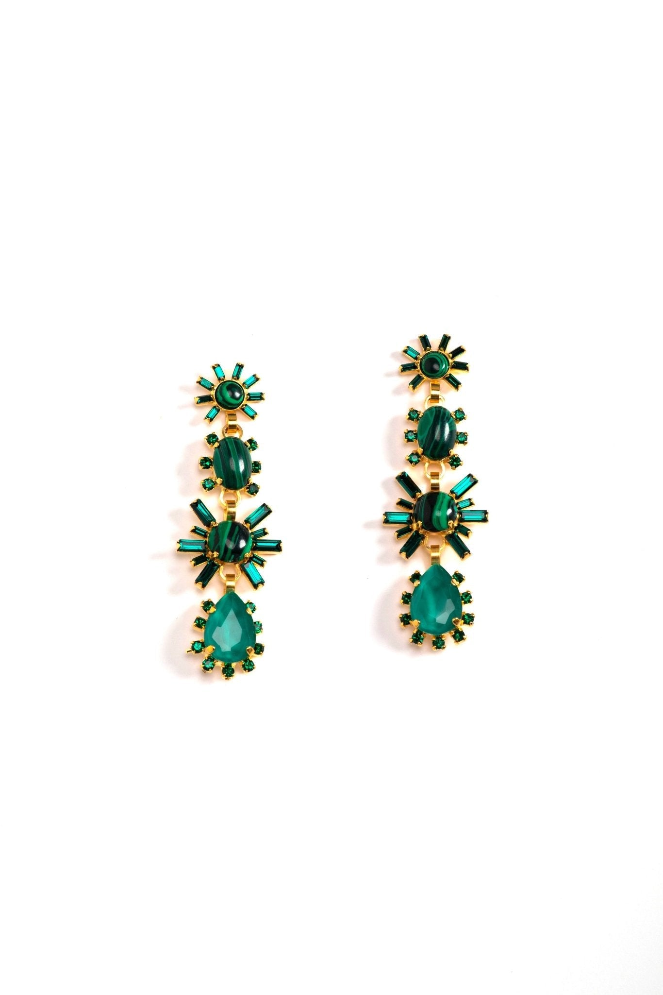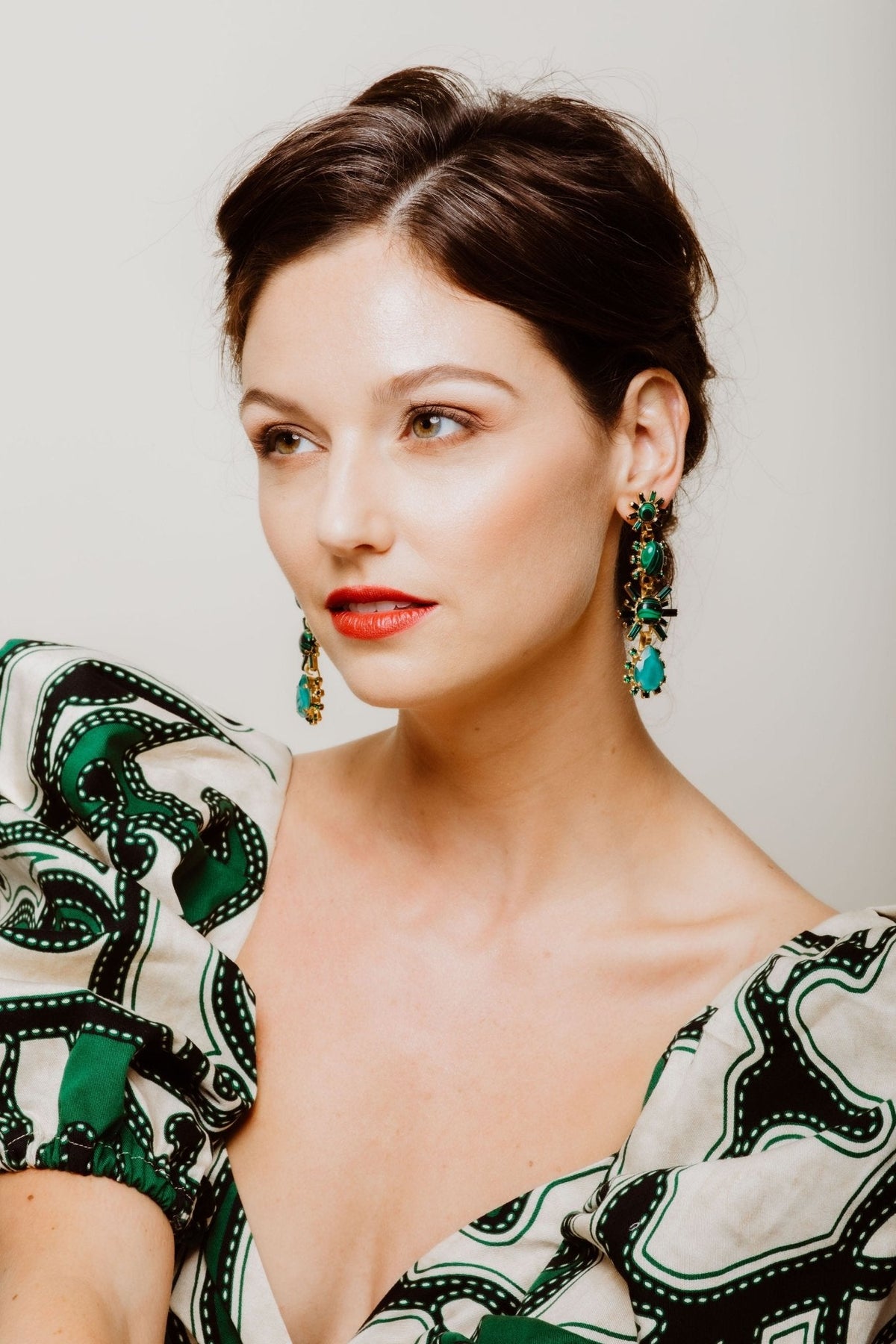 Swarovski crystals, glass stones, 24kt gold plate. Length: 3.75in (9.5cm), Weight: 12.1g. Post closure. Proudly made in the USA.
