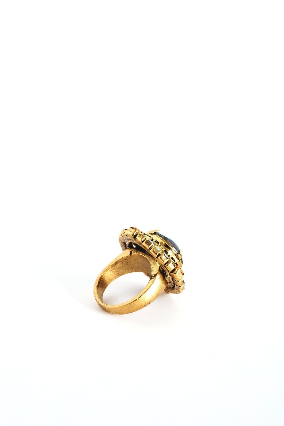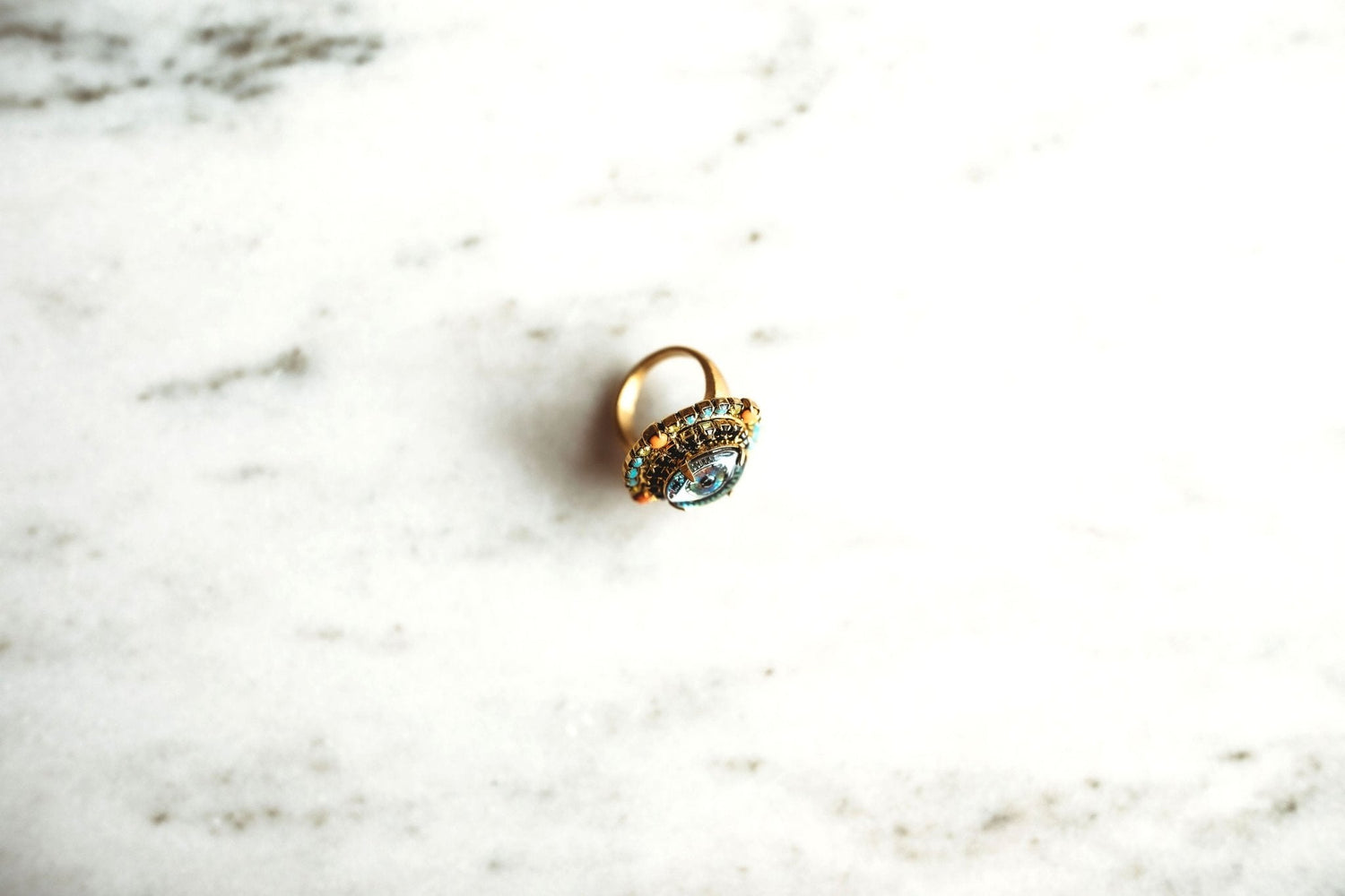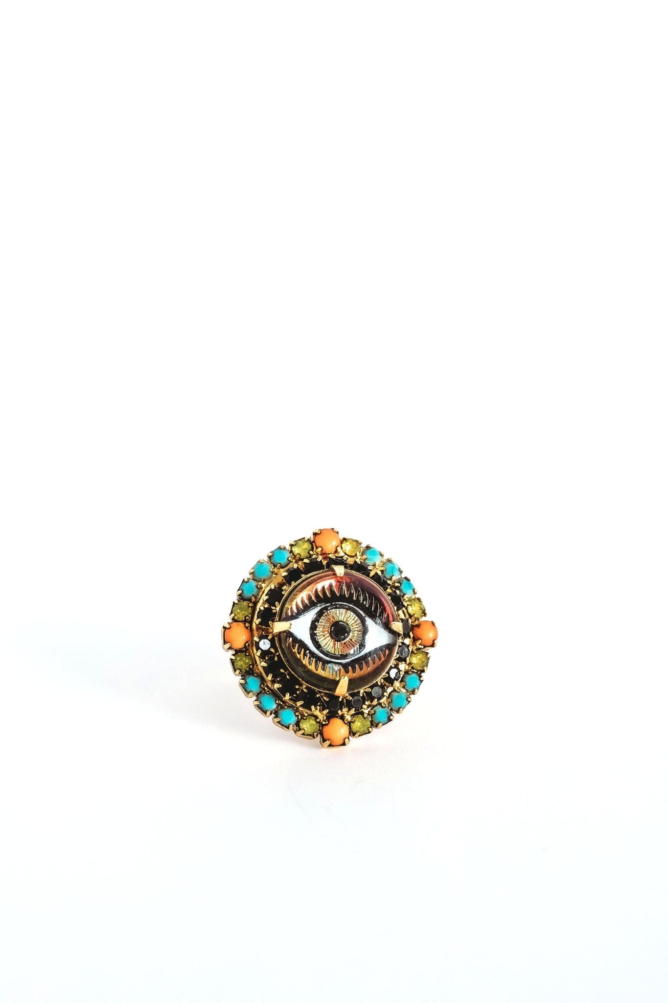 This Lizzy Ring by Elizabeth Cole features an evil eye design in apricot hues surrounded by turquoise, orange, and black crystal details. A bold and meaningful statement piece for any jewelry collection.