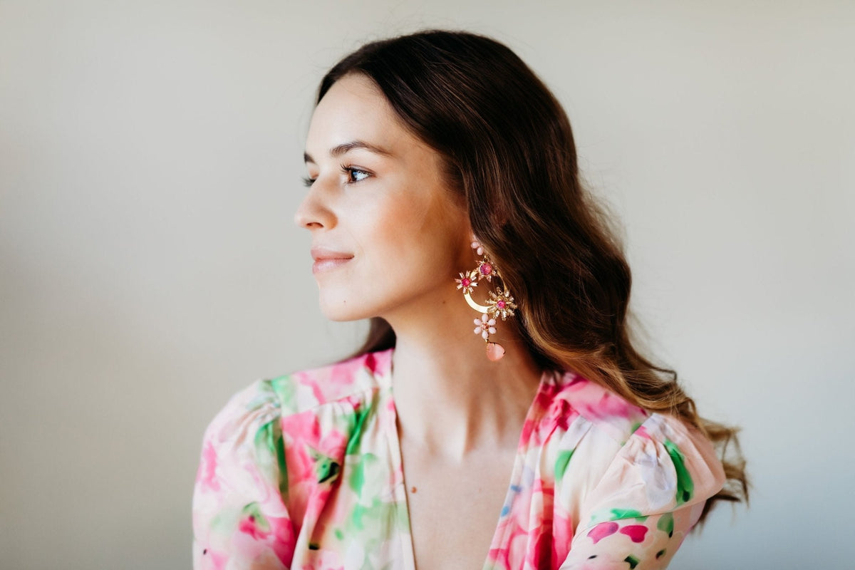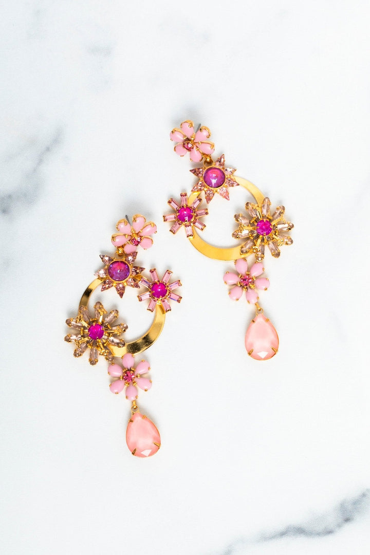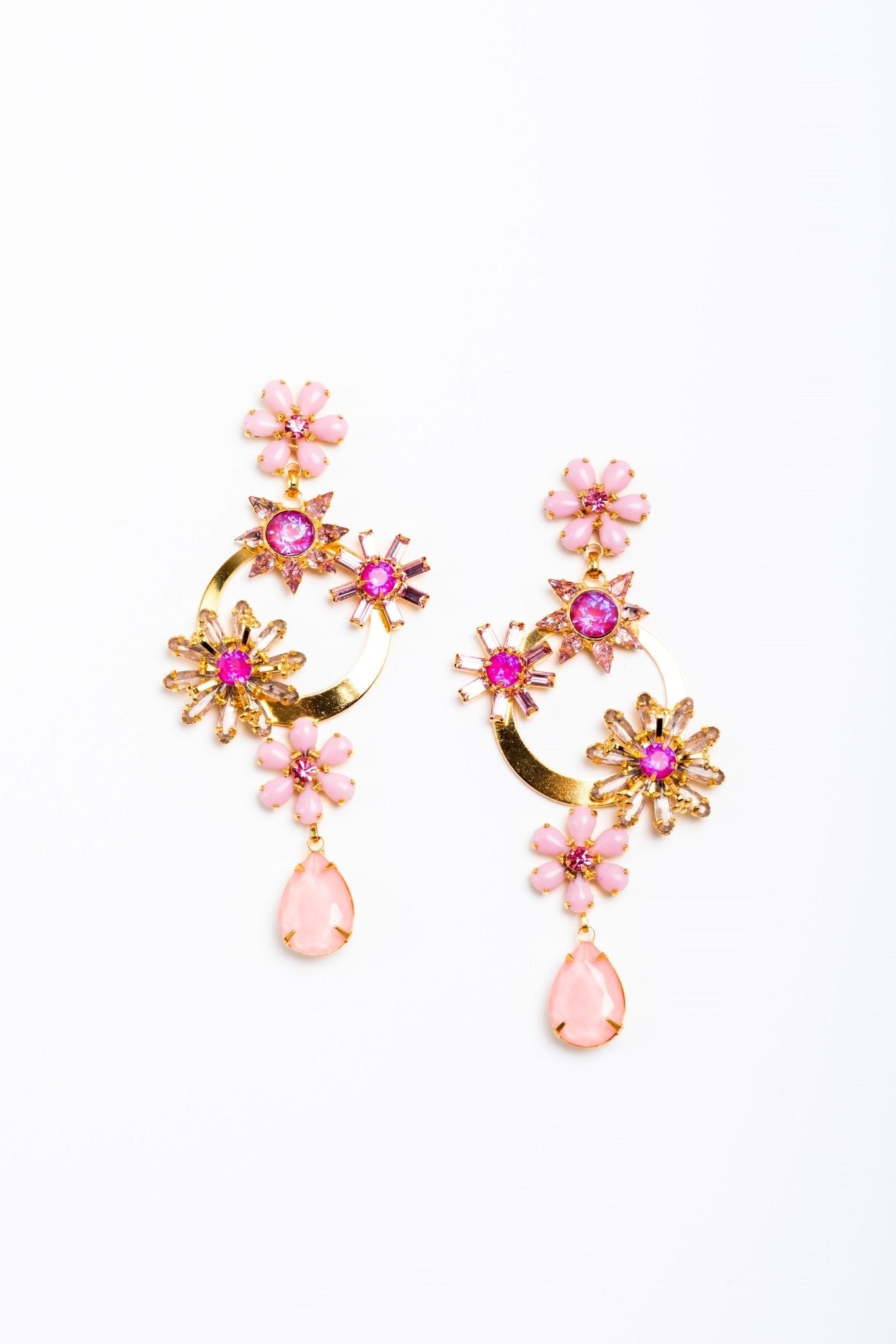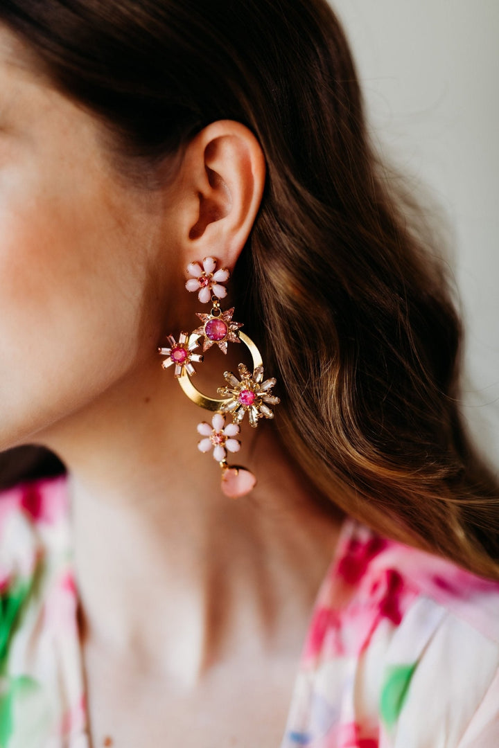 These Lotus Earrings by Elizabeth Cole offer a fresh twist on classic gold hoops, featuring front-facing hoops adorned with pale pink flowers and finished with large pale pink pears. A head-turning accessory for any occasion.