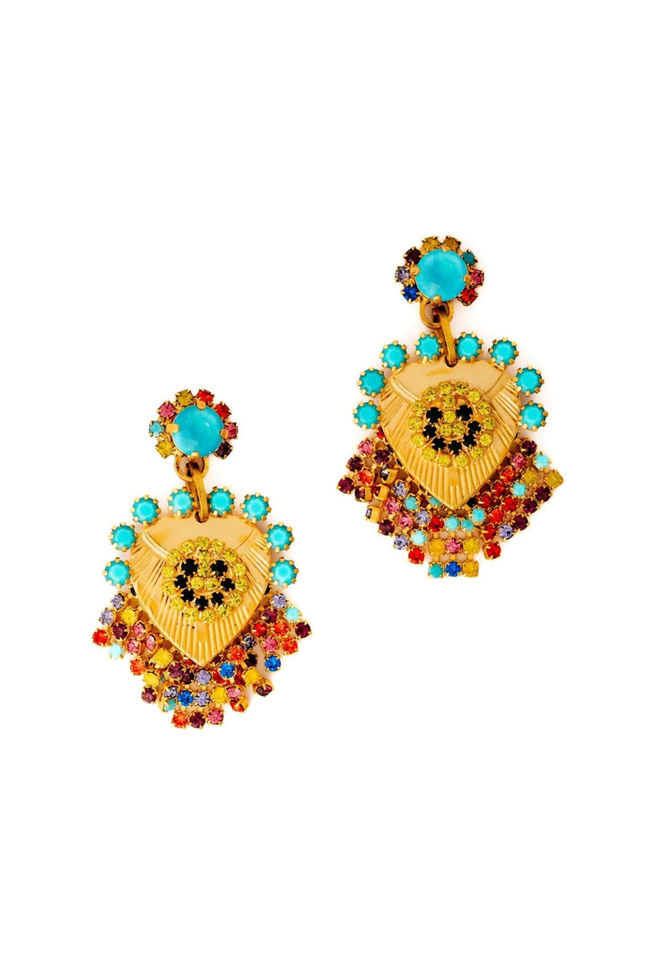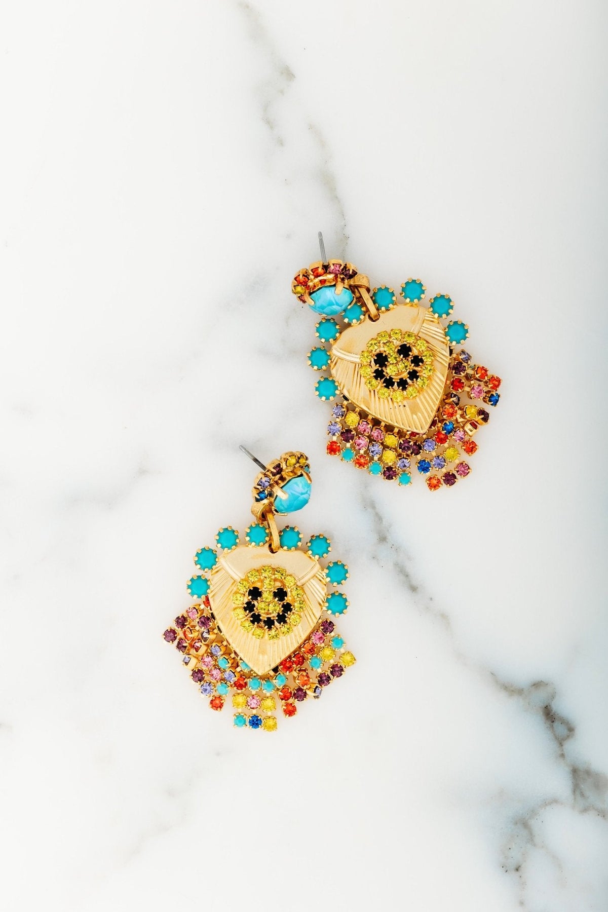 These Lovella Earrings by Elizabeth Cole bring a playful touch with their heart and smiley face designs, adorned with colorful blue and crystal stones. Perfect for spreading joy and adding a unique flair to any outfit.