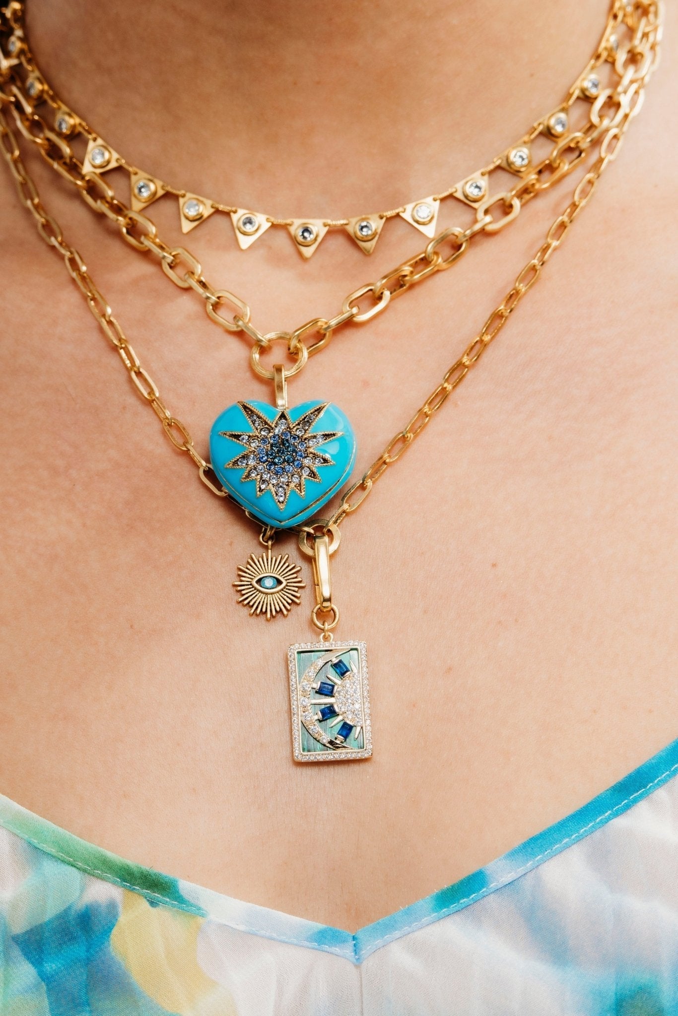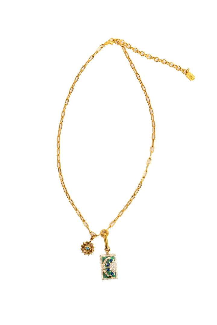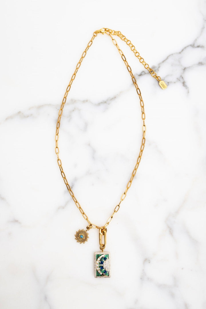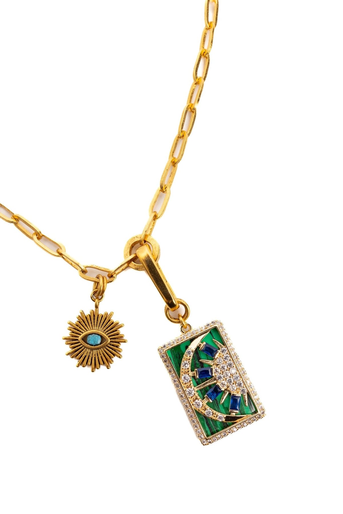 This Luciana Necklace by Elizabeth Cole offers a powerful symbol of protection and elegance, featuring an open link chain with a sunburst evil eye and a rectangular charm adorned with faux turquoise, malachite, and crystals.