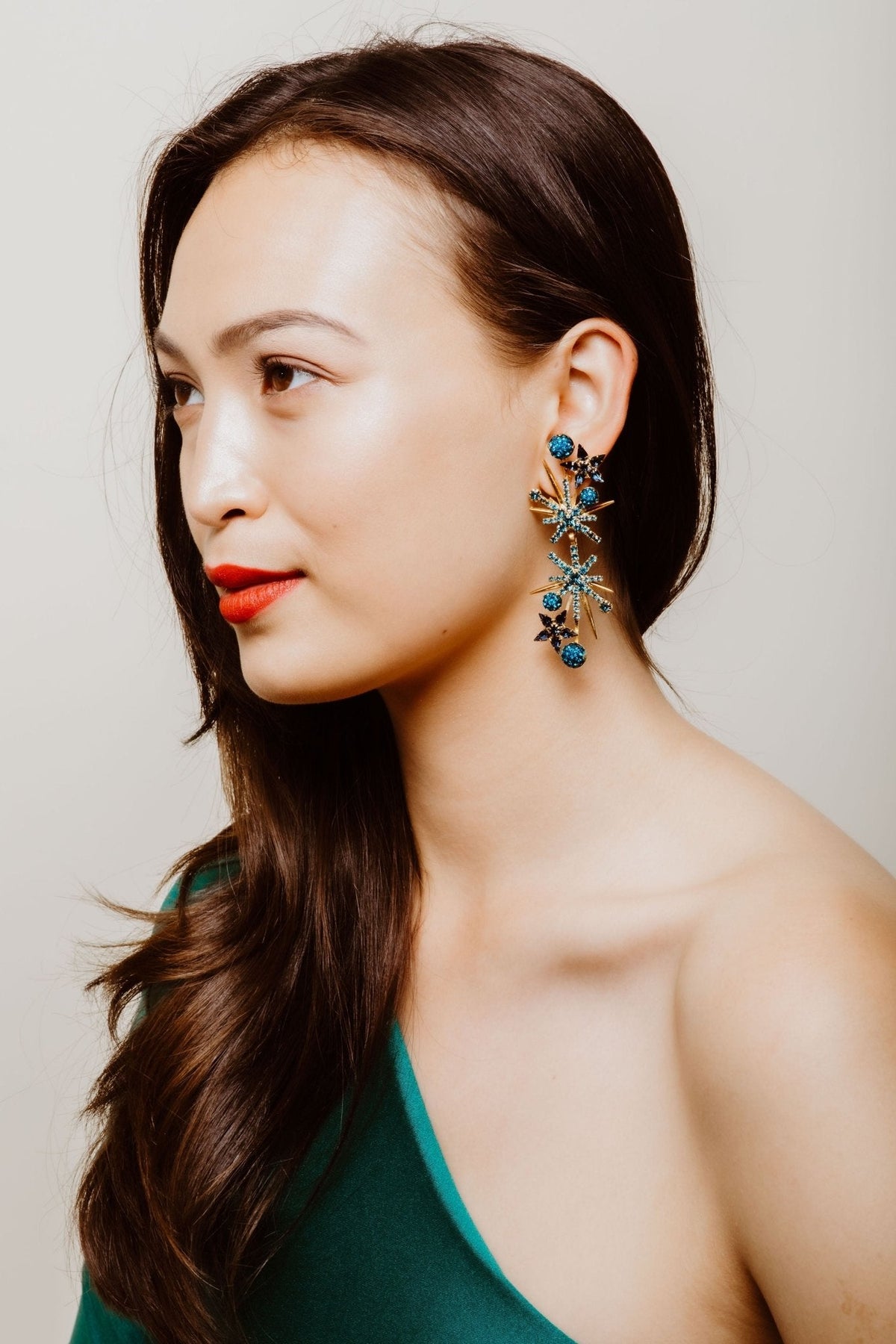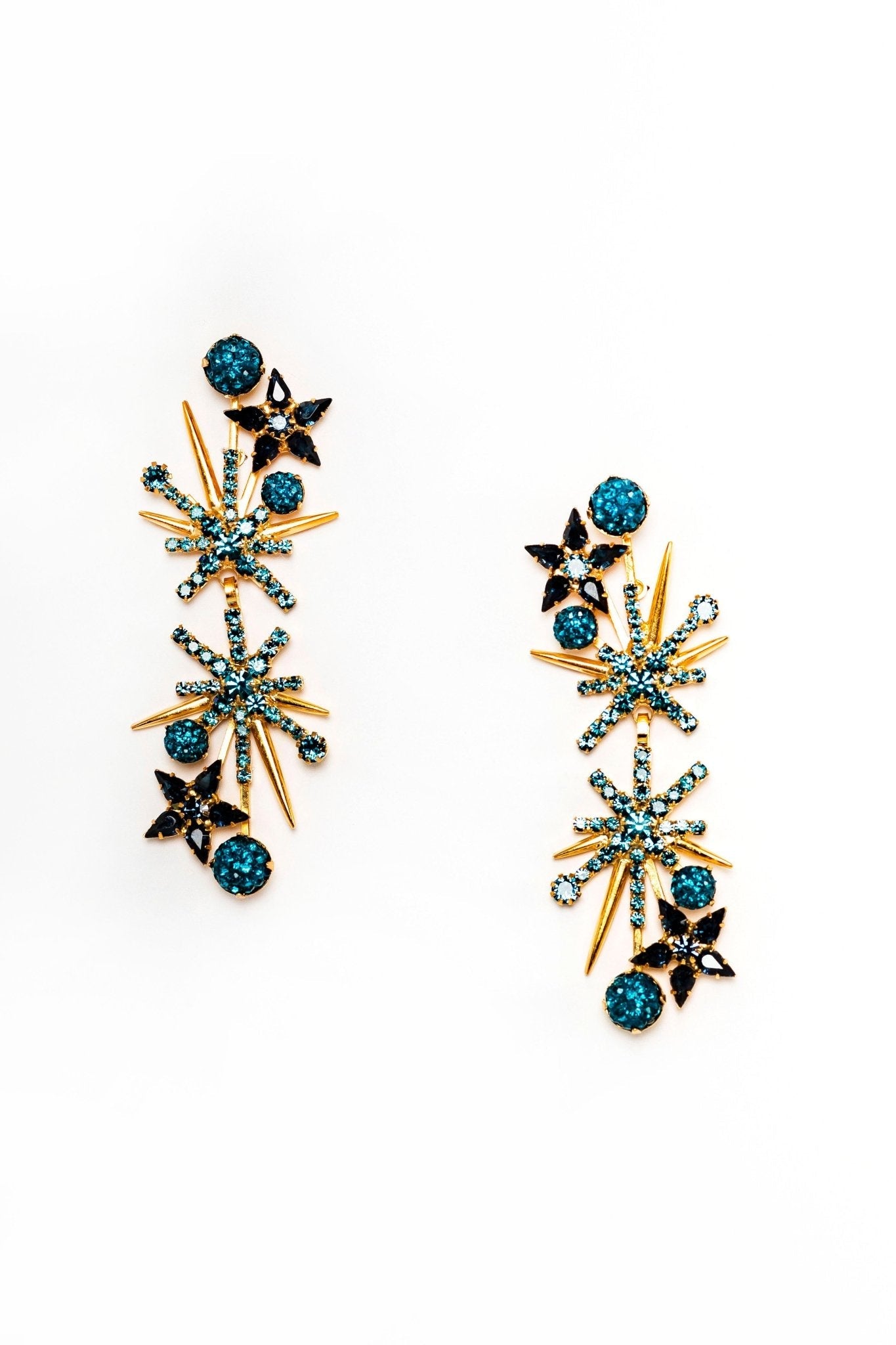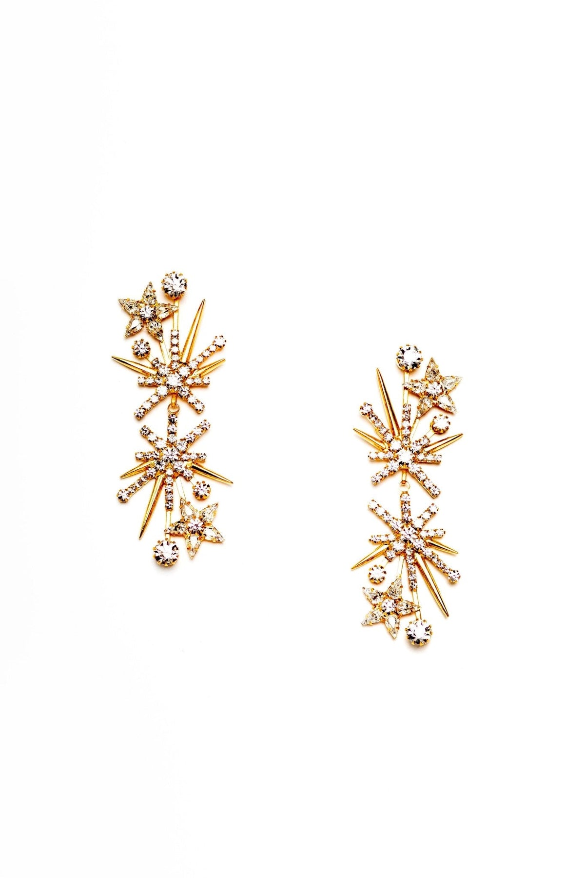 Swarovski and Czech crystals, 24kt gold plate. Length: 3in (7.6cm), Weight: 11g. Post closure. Proudly made in the USA.